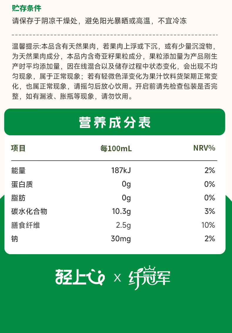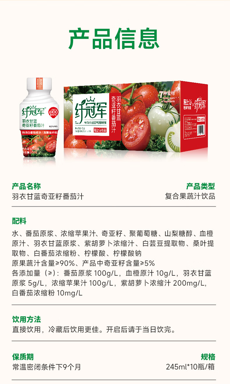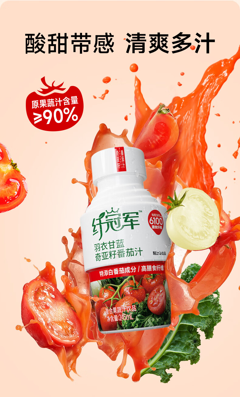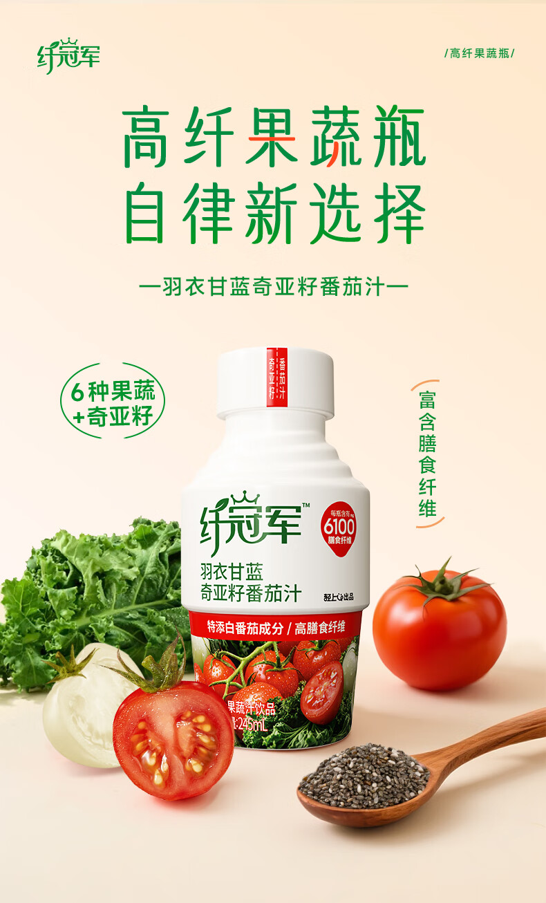 纤冠军羽衣甘蓝奇亚籽番茄汁纤维饮料复合果蔬汁富含膳食纤维代餐 羽衣甘蓝奇亚籽番茄汁245ml*30瓶
