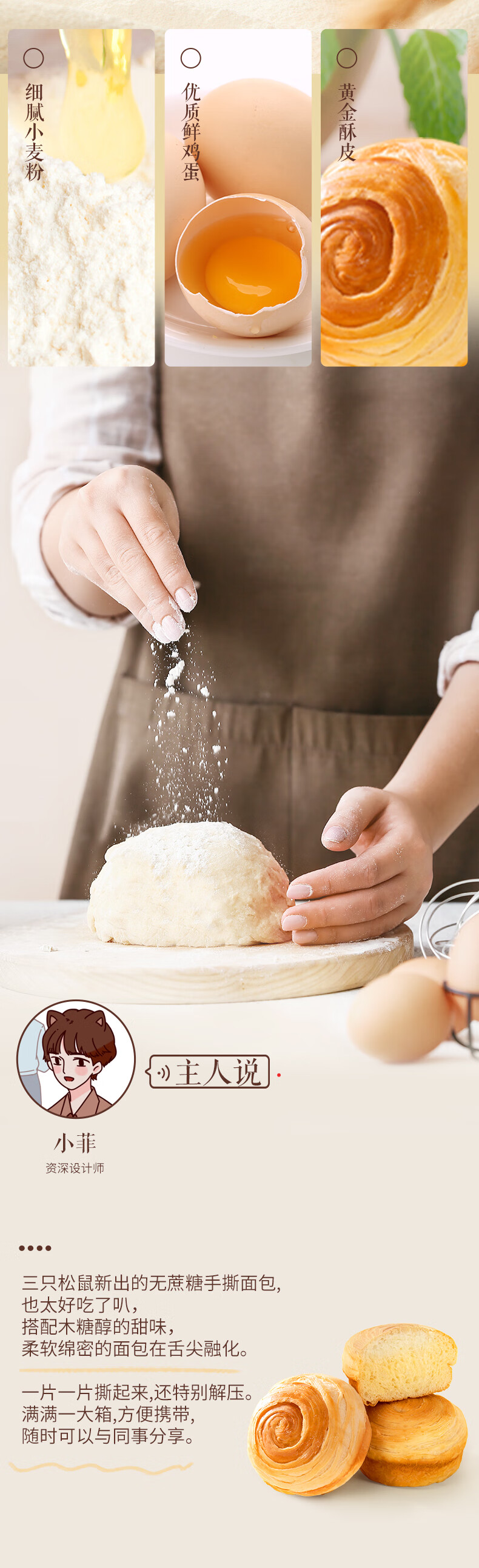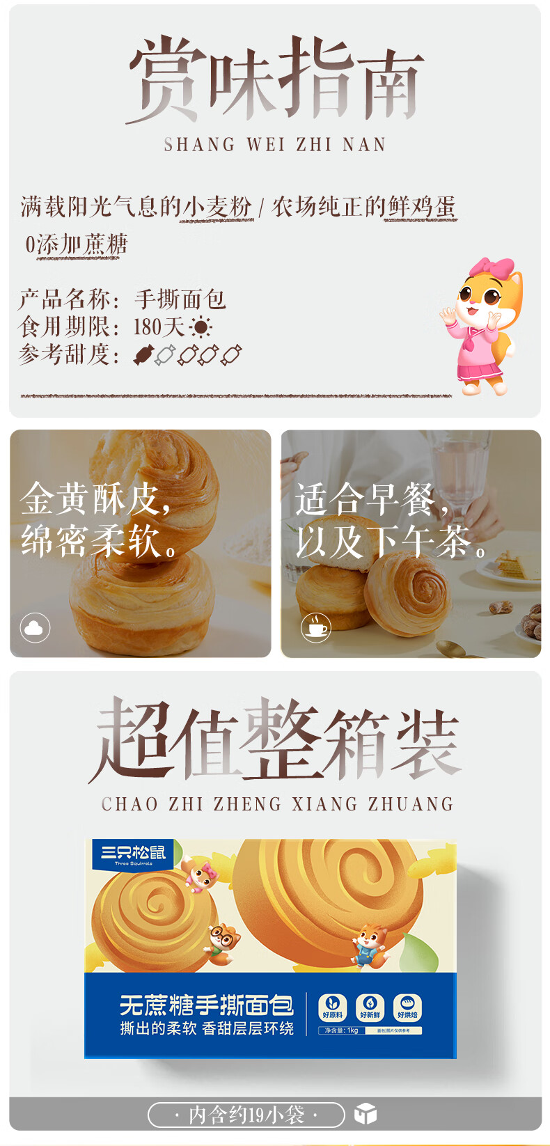 三只松鼠0蔗糖手撕面包 早餐小面包代餐饱腹整箱量贩休闲零食酵母1000g/箱