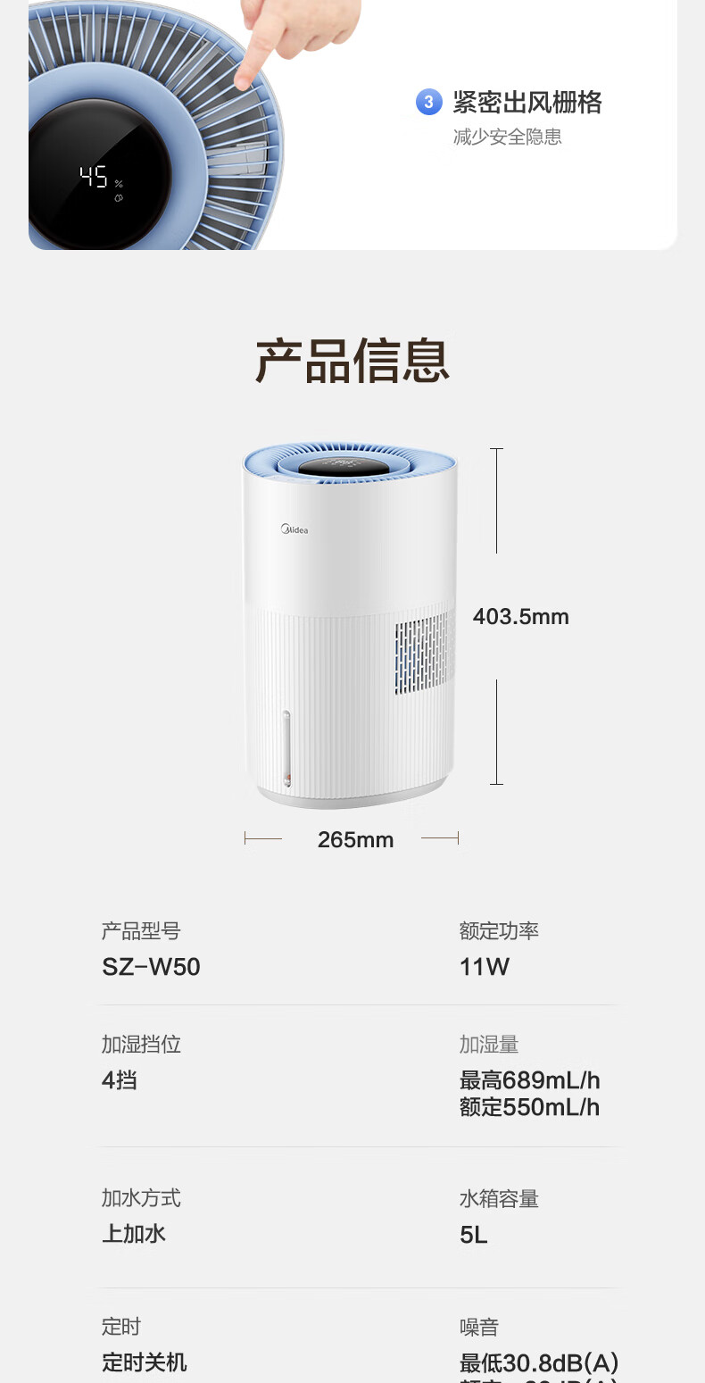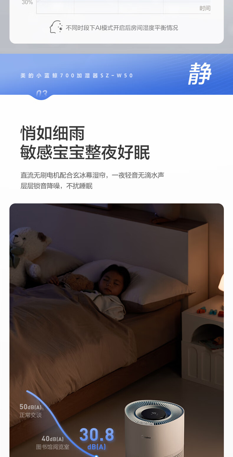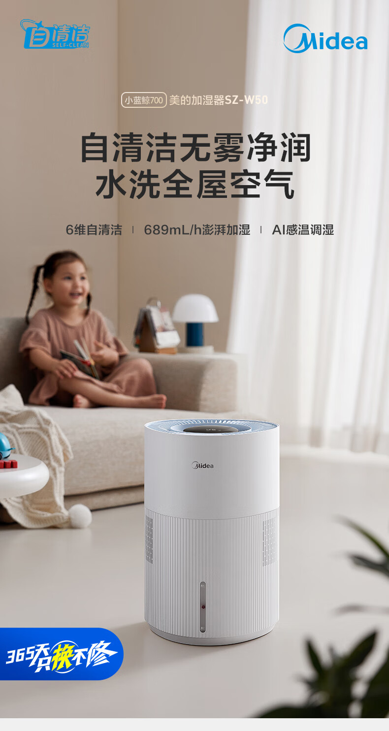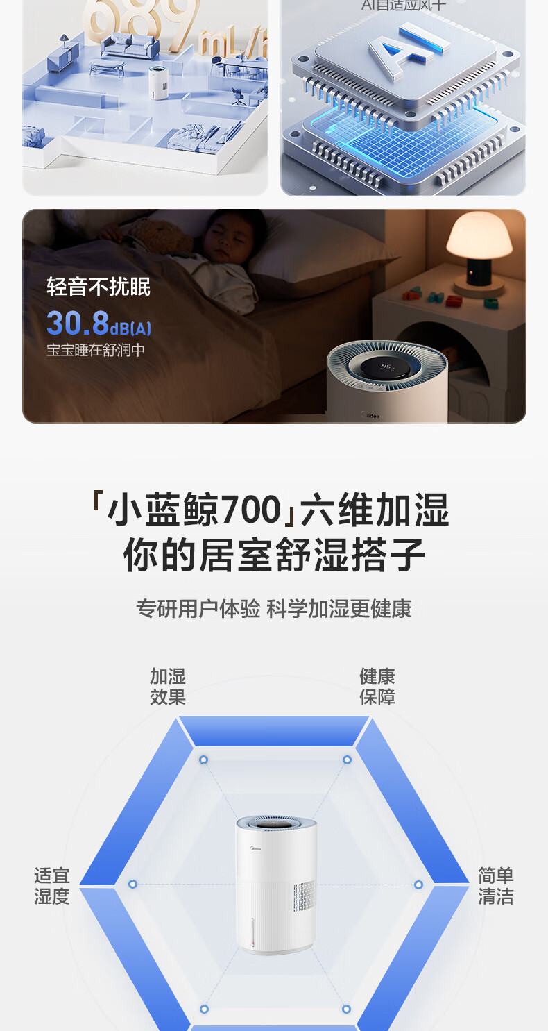 美的(Midea)小蓝鲸700无雾空气加湿器家用卧室大容量客厅孕妇母婴幼儿鼻炎静音抗菌空调取暖补水新年礼物W50