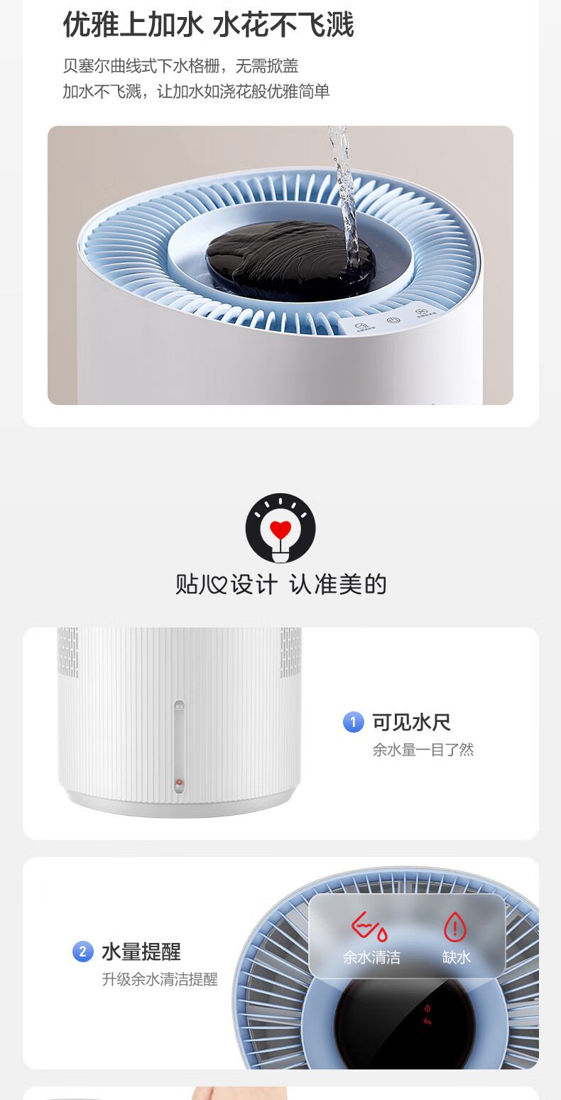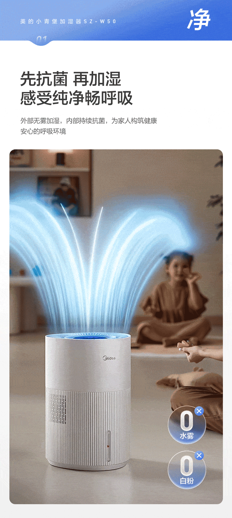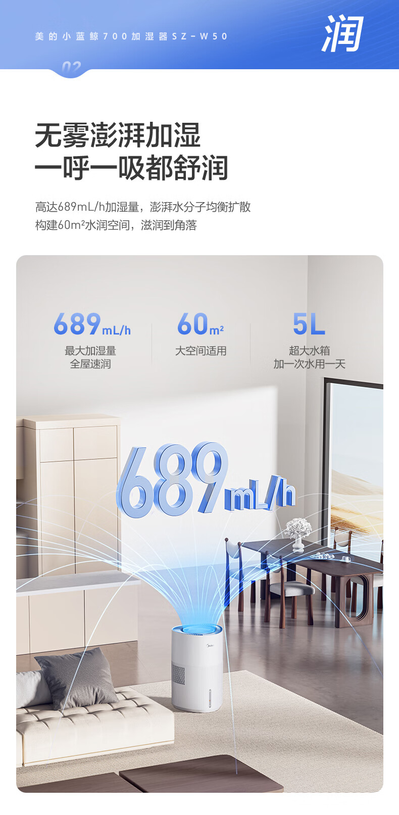 美的(Midea)小蓝鲸700无雾空气加湿器家用卧室大容量客厅孕妇母婴幼儿鼻炎静音抗菌空调取暖补水新年礼物W50