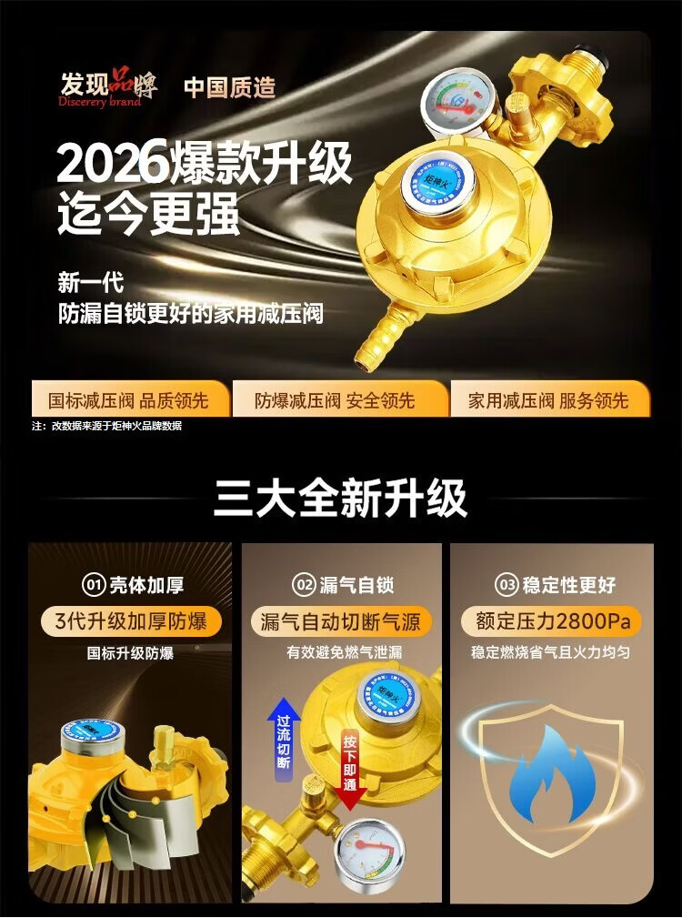 炬神火【2026新国标】煤气罐减压阀家用防爆液化气热水器煤气灶低压阀门 【大火力1.2】生产许可丨防漏丨带表+1.5米防爆管 【品质保障】闪电发货丨极速送达