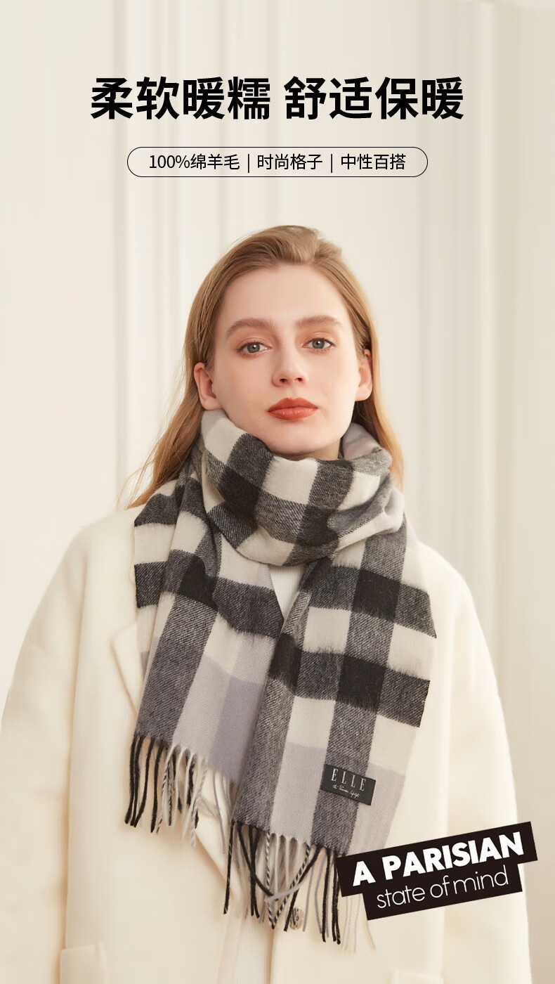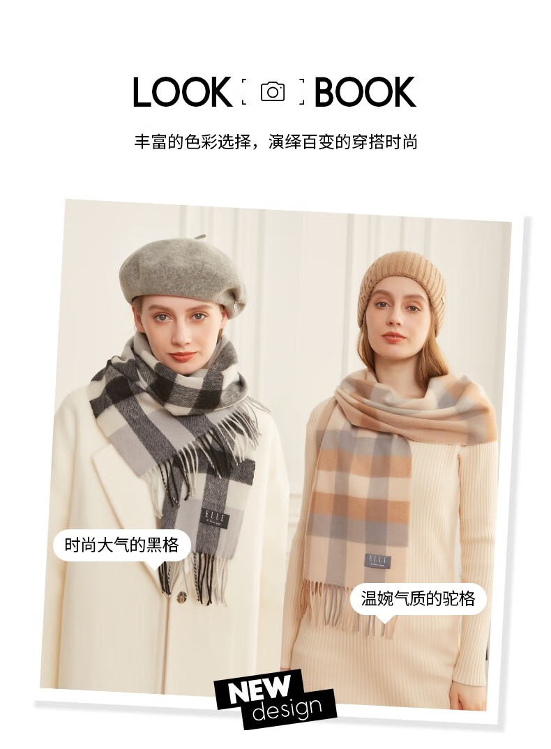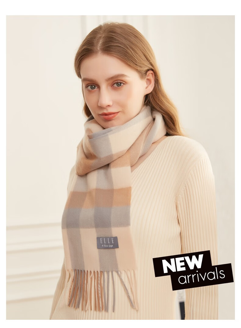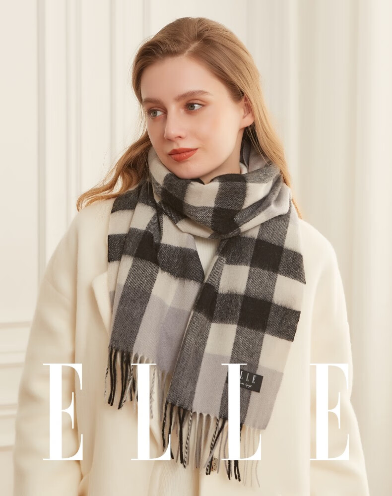 ELLE100%羊毛围巾女士秋冬季保暖时尚百搭格子围脖 驼格