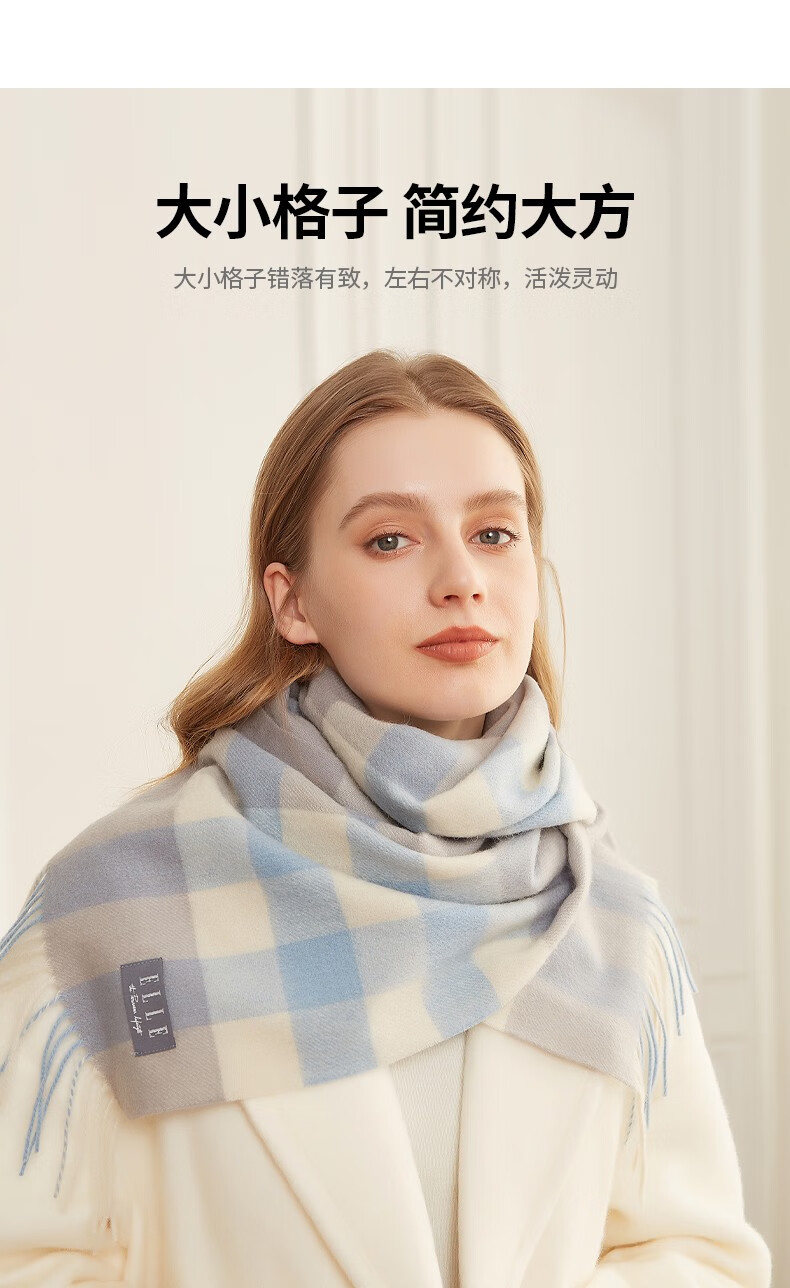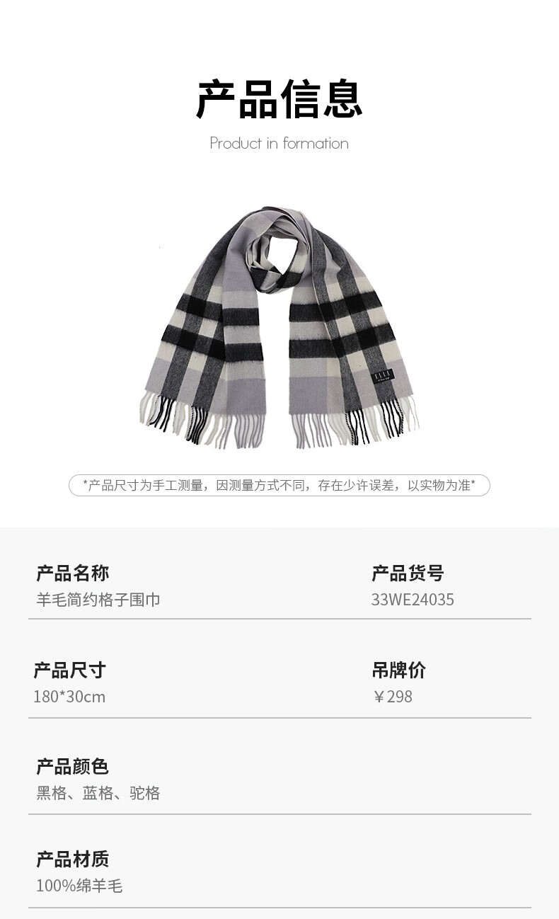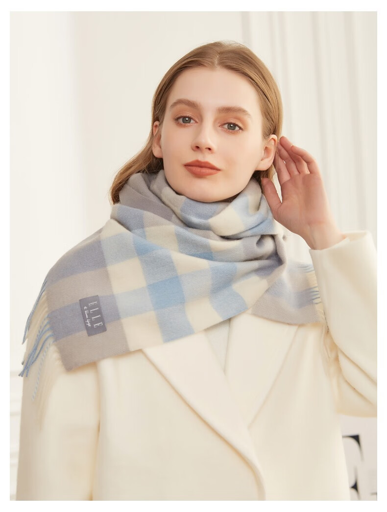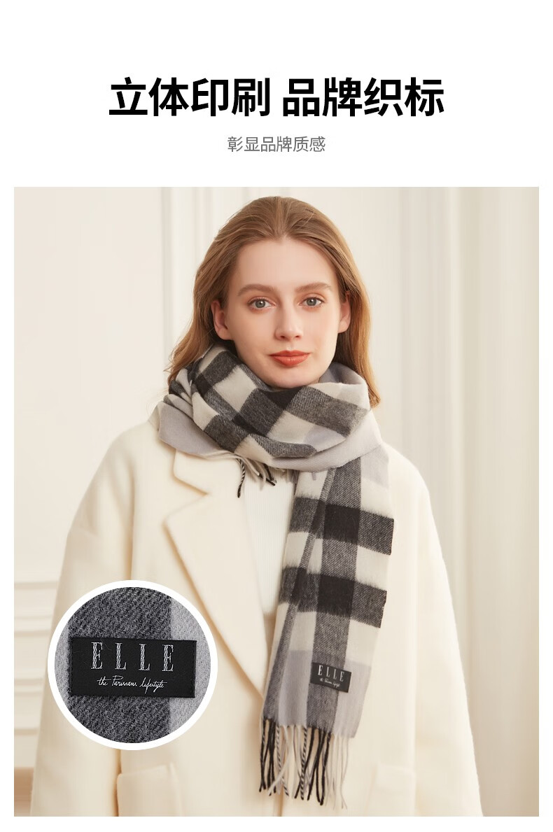 ELLE100%羊毛围巾女士秋冬季保暖时尚百搭格子围脖 驼格