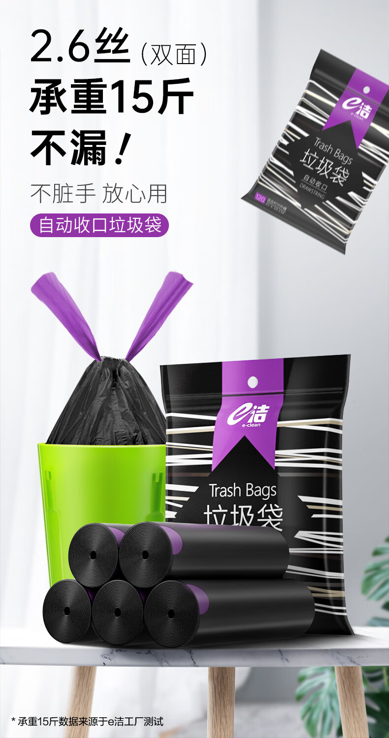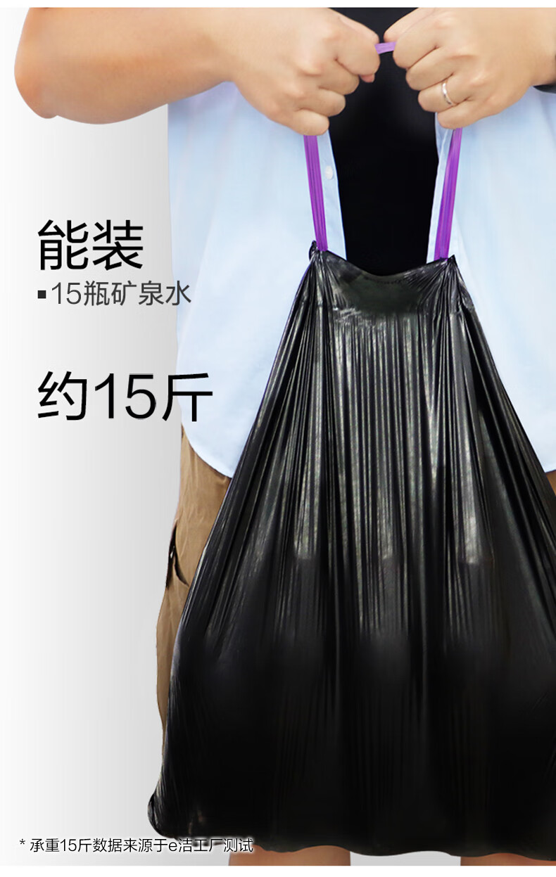 e洁抽绳垃圾袋抽绳加厚黑色45*50cm*120只1.3丝单面家用手提穿绳免撕
