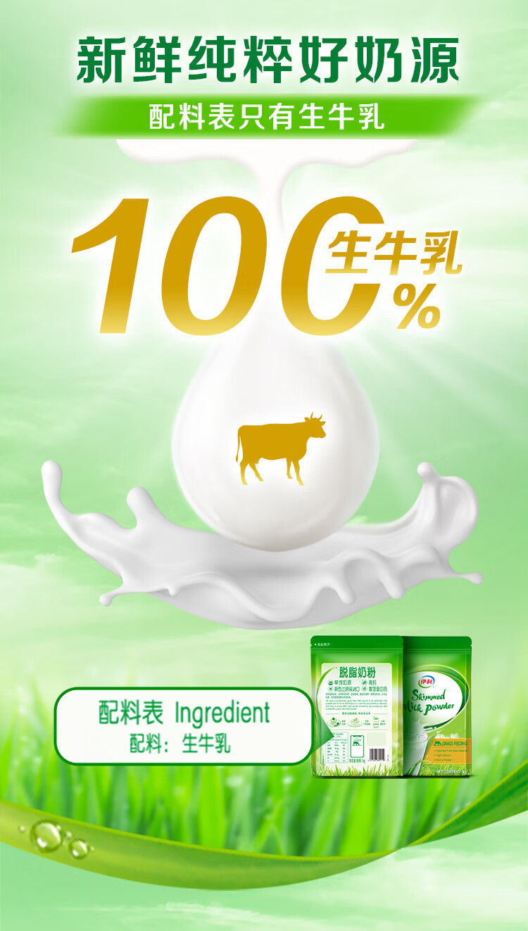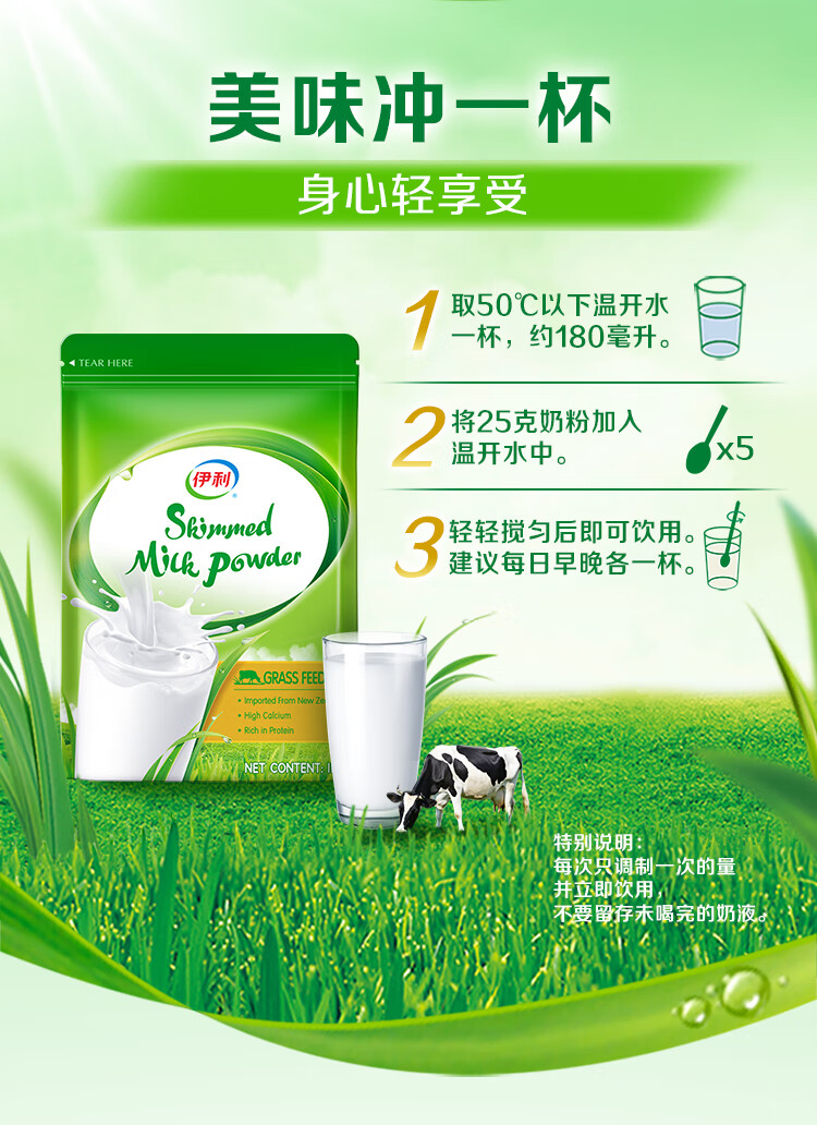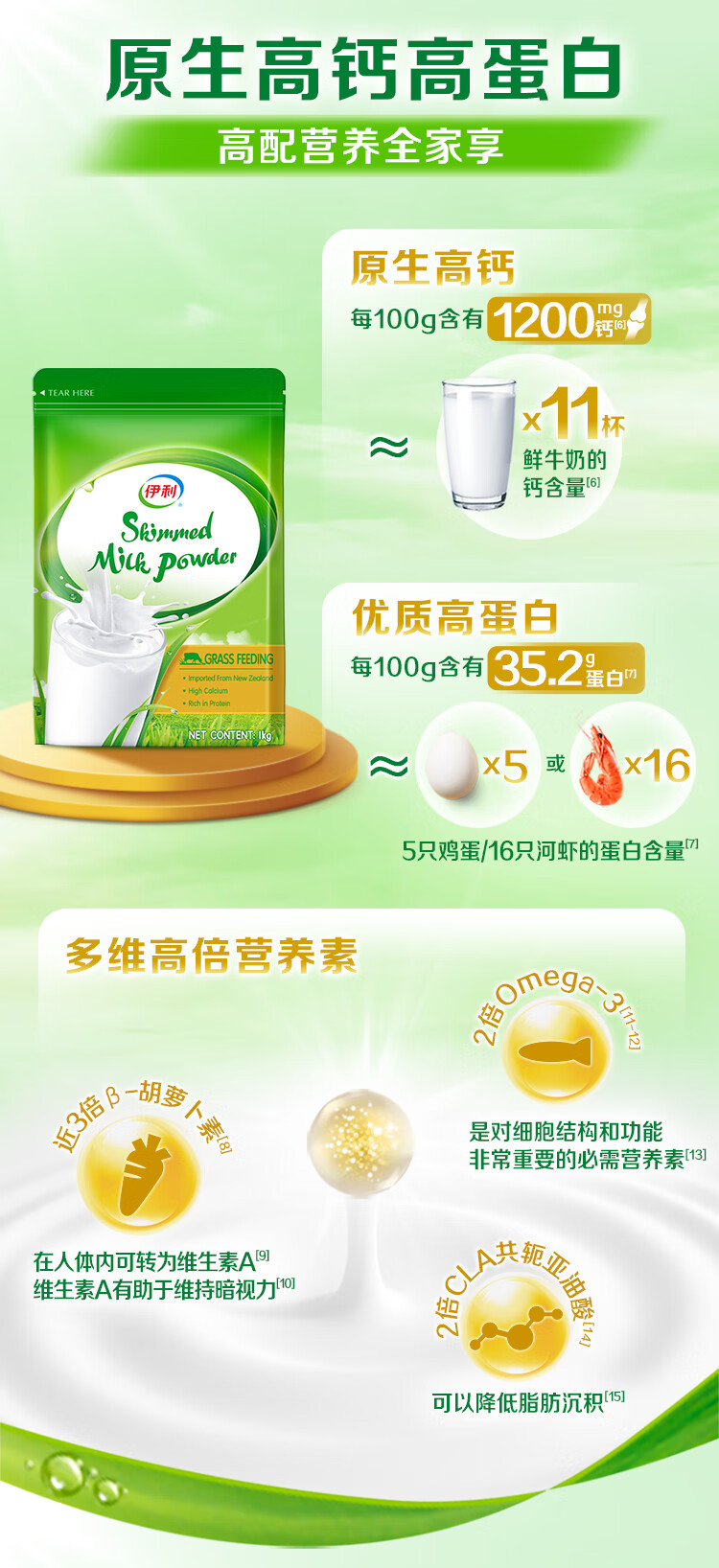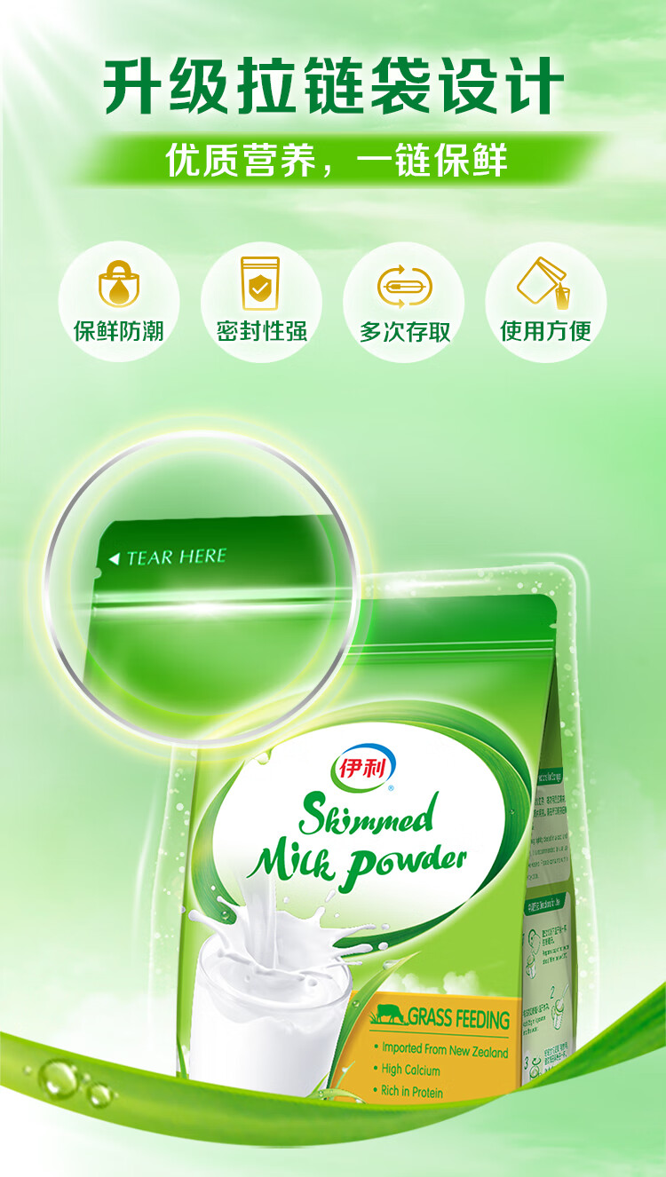 伊利新西兰进口脱脂奶粉 成人奶粉 营养 年货节送礼 高钙高蛋白 1kg