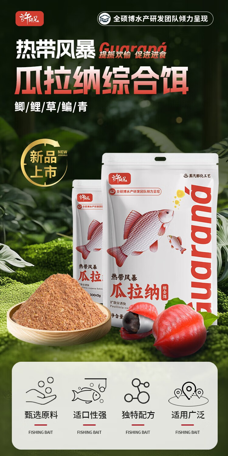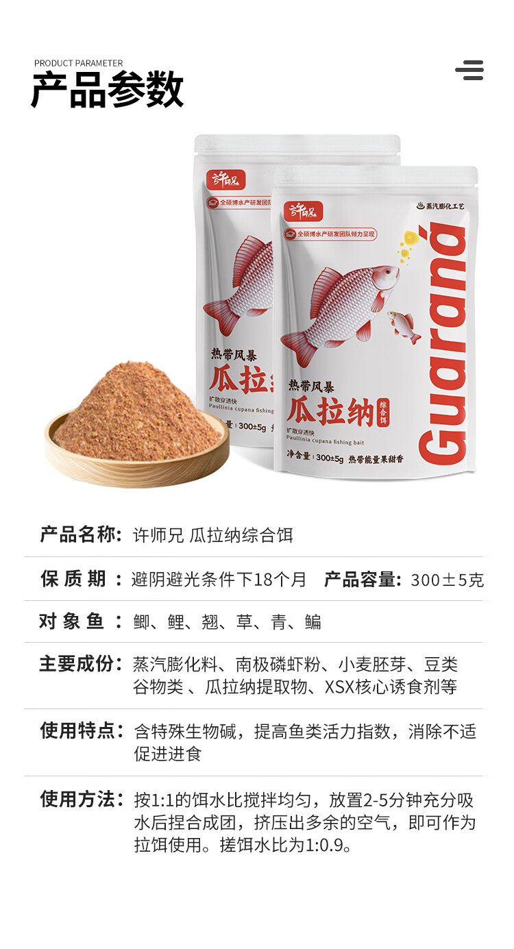 许师兄综合鱼饵料瓜拉纳热带风暴春夏果香鲫鲤草青鳊鱼食通杀鱼饵 瓜拉纳综合饵300G 3包【赠多米三号3袋】