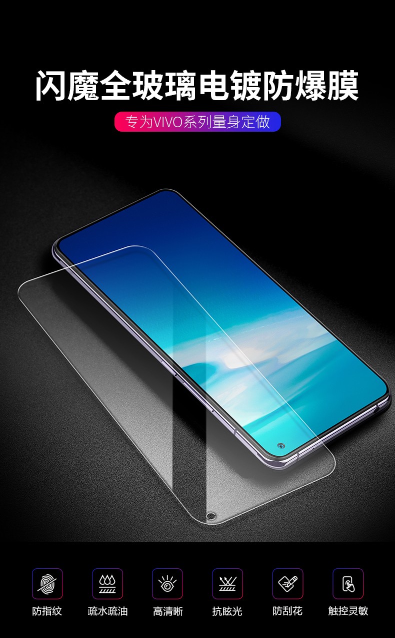 闪魔【甄选直发】 适用于VIVO X30/X30Pro钢化膜手机膜高清防爆防指纹防摔贴膜抗 X30/X30Pro【电镀版 抗指纹非全屏】2片装