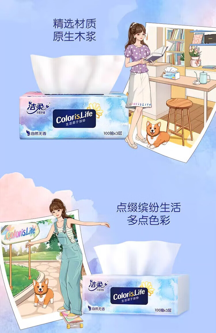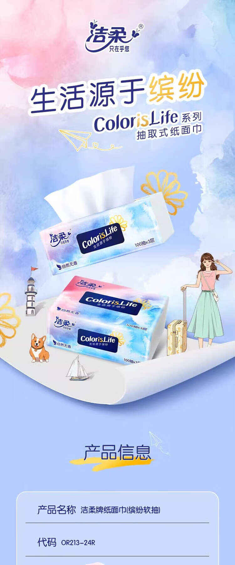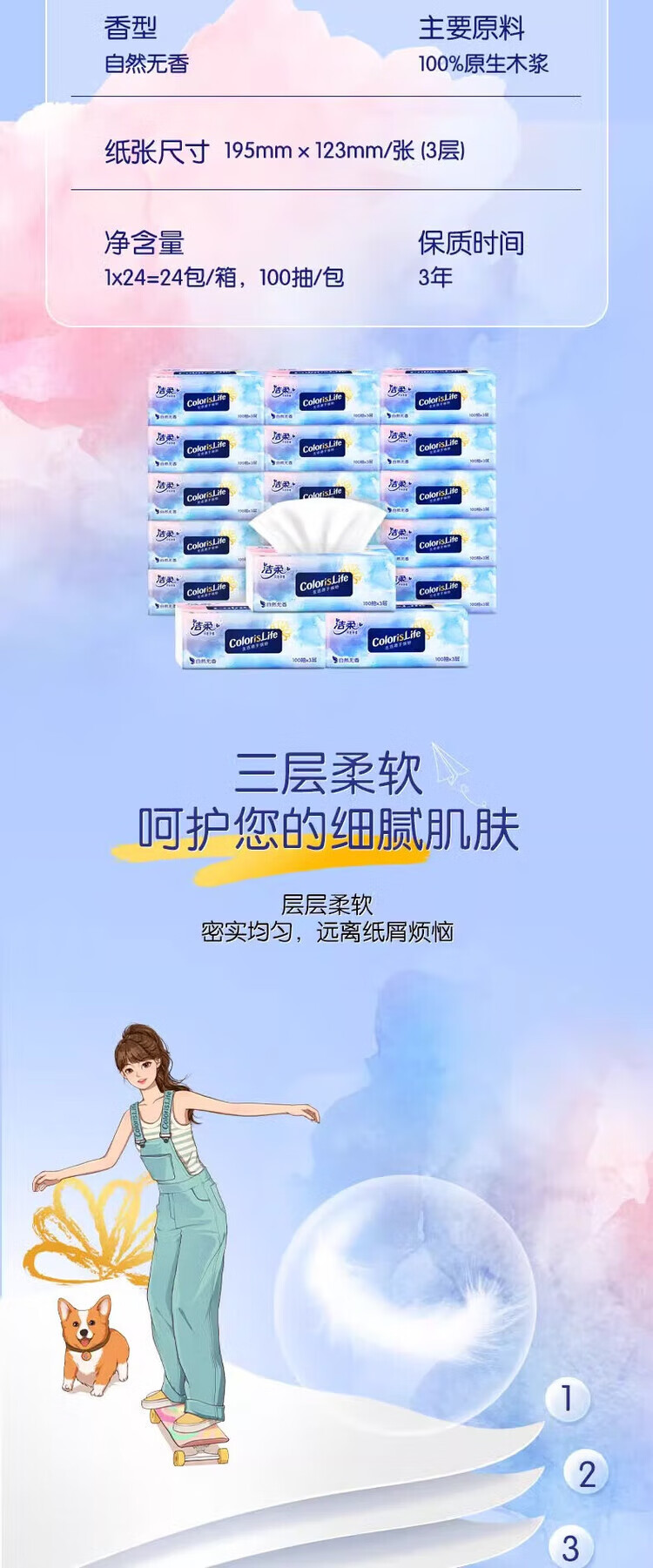 洁柔 C&S洁柔缤纷软抽无香3层100抽餐巾纸婴儿纸巾家用卫生纸 缤纷 3层 100抽*1包