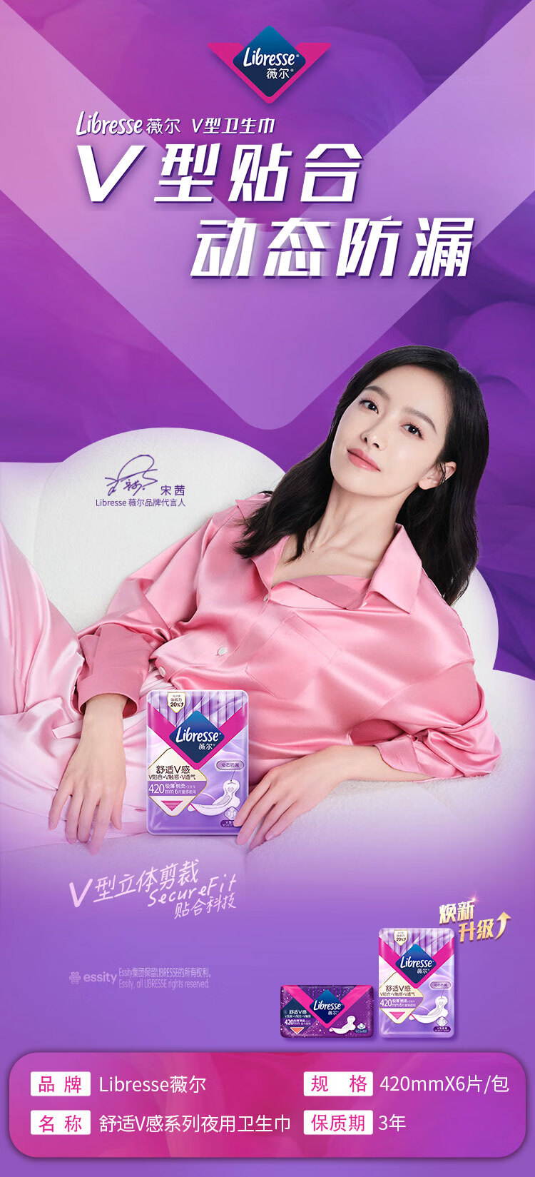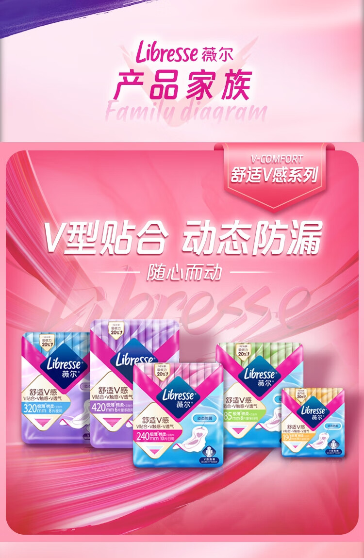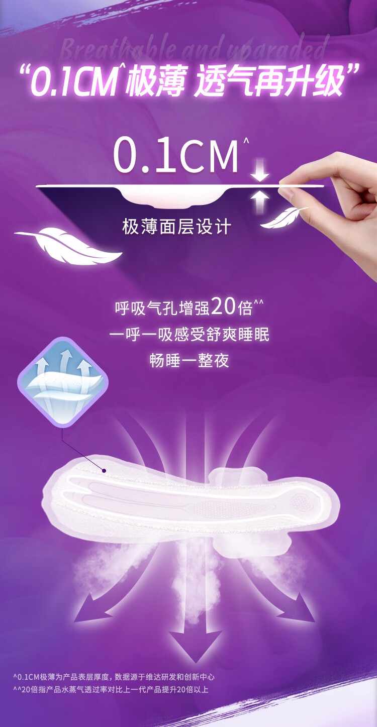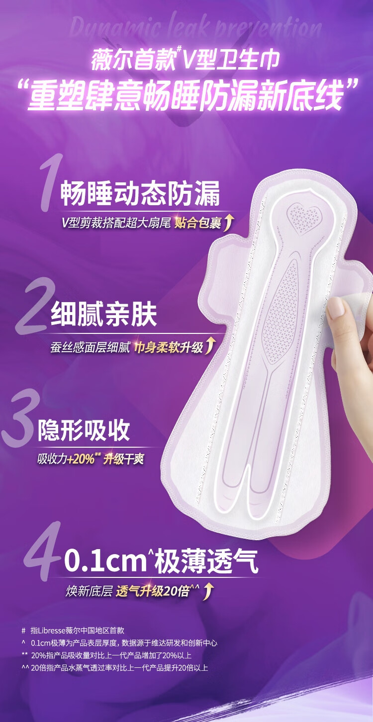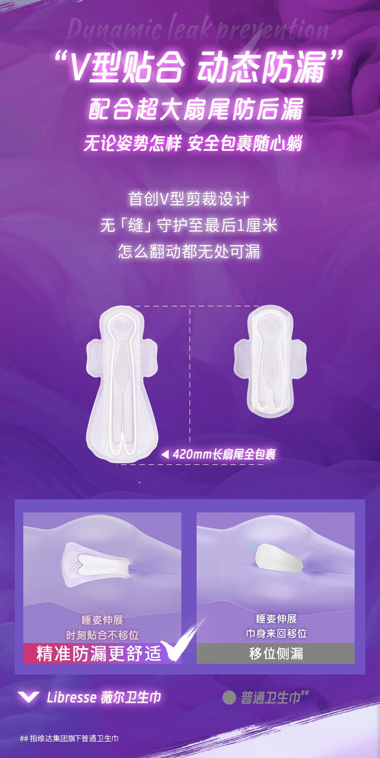薇尔V感超薄贴合透气防漏420mm*6片夜用卫生巾京东自营姨妈巾