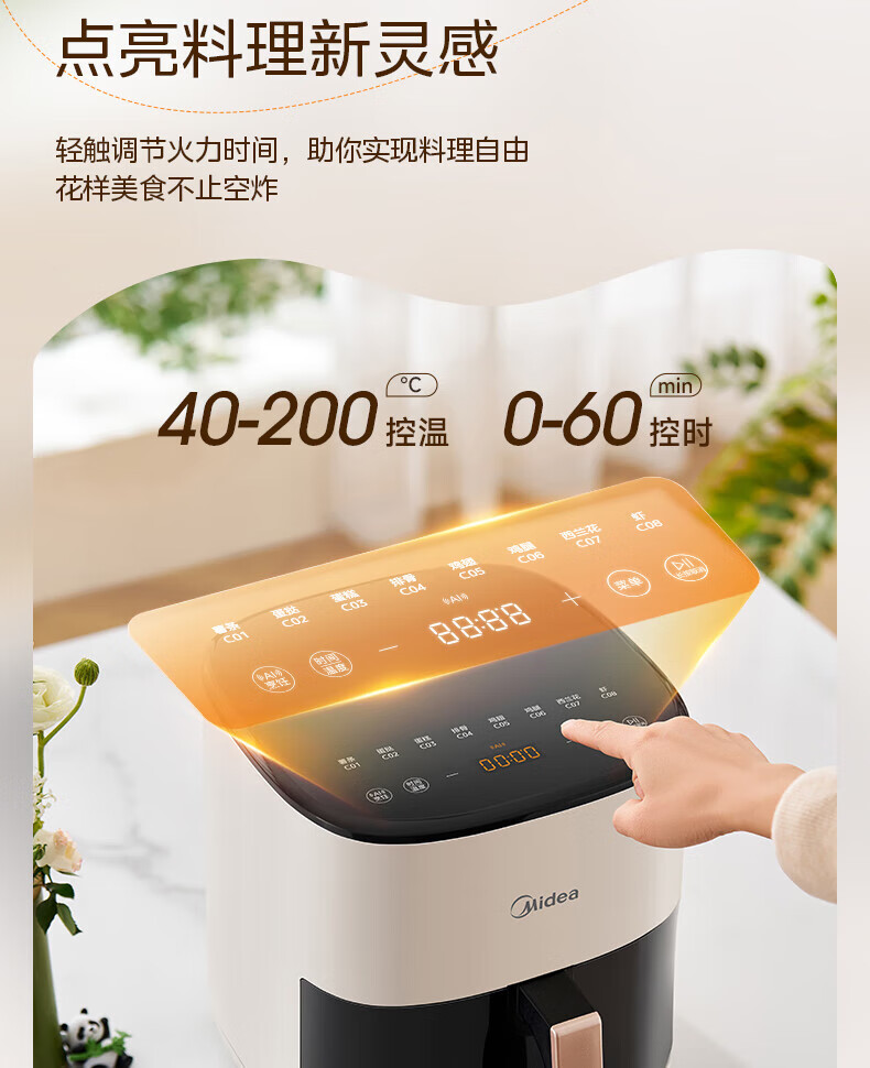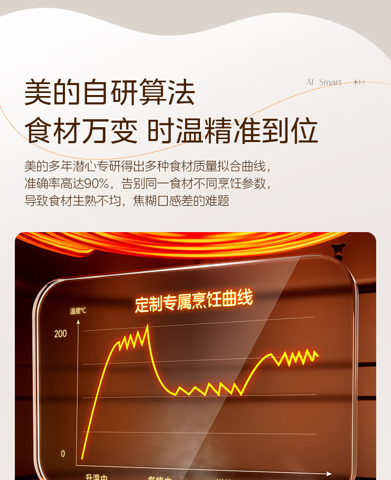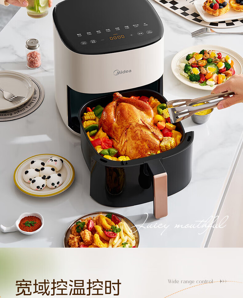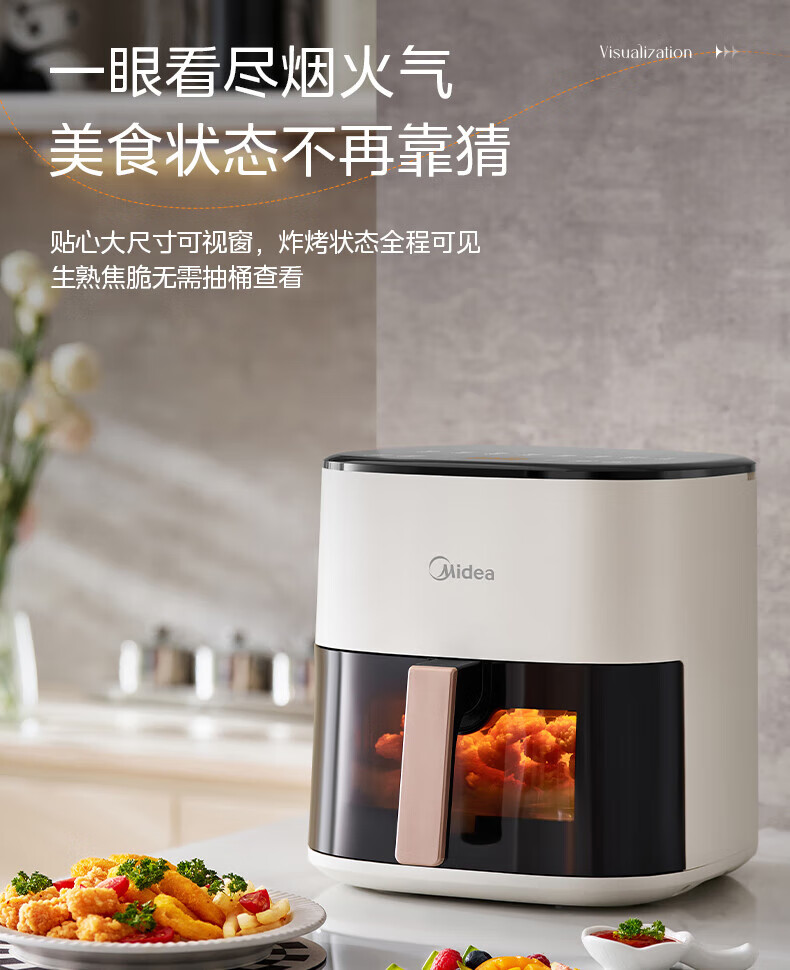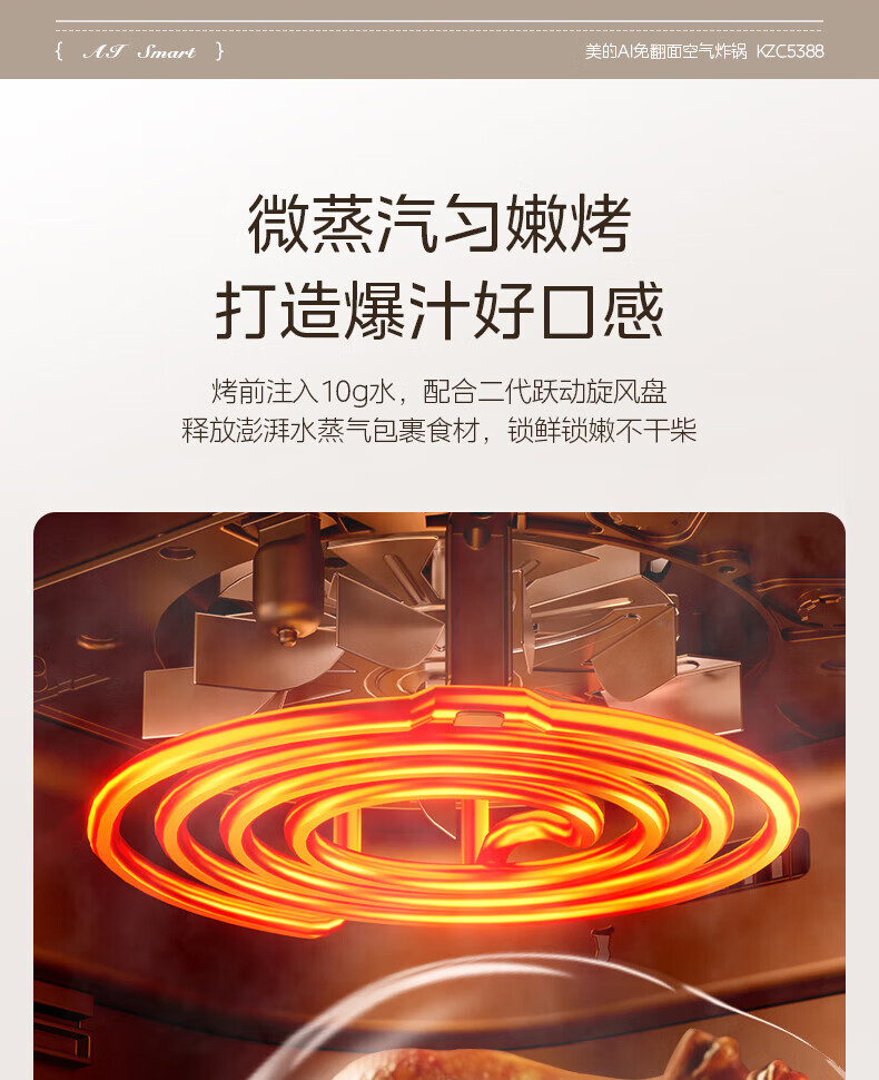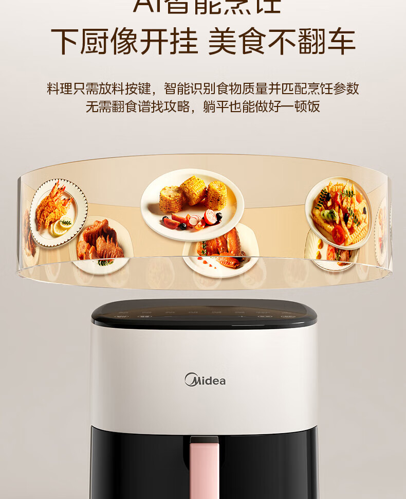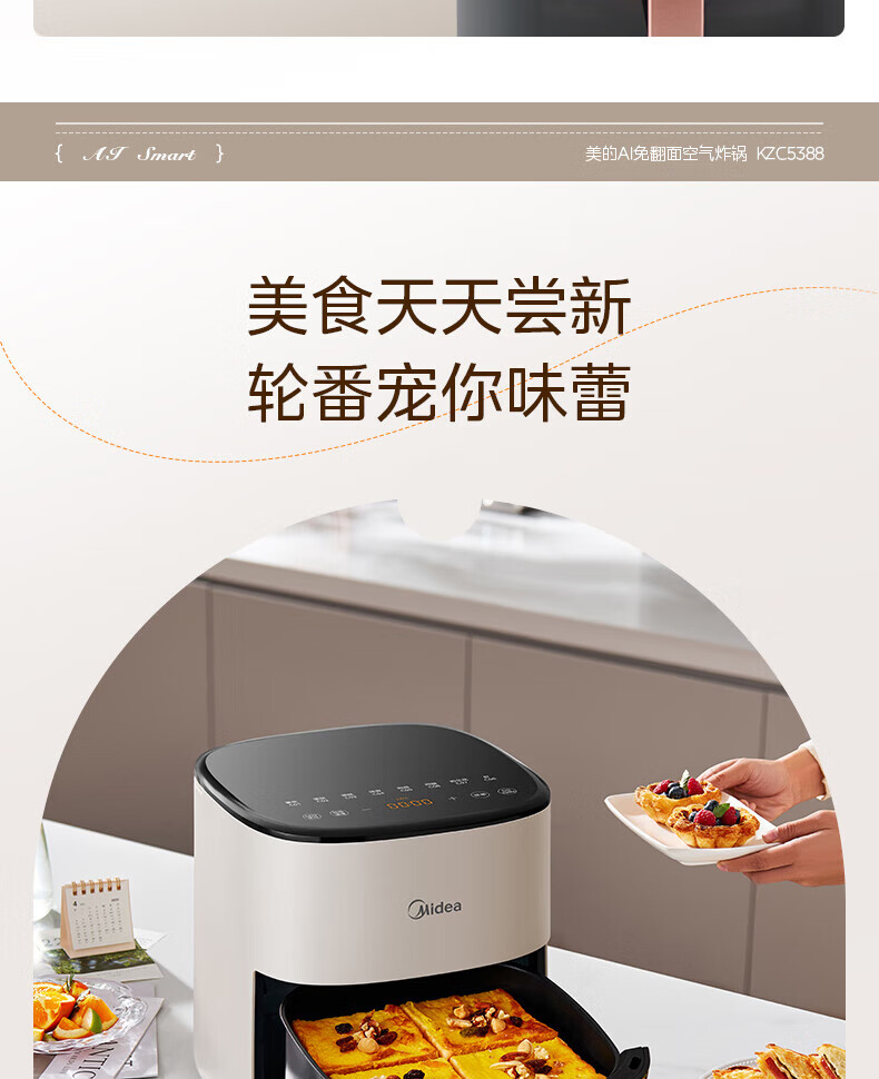 美的(Midea)空气炸锅免翻面 5.3LAI智能烹饪蒸汽嫩 烤炸一体 可视大视窗 家用多功能精准控温大容量全金属内腔 KZC5388【AI智能】 5.3L