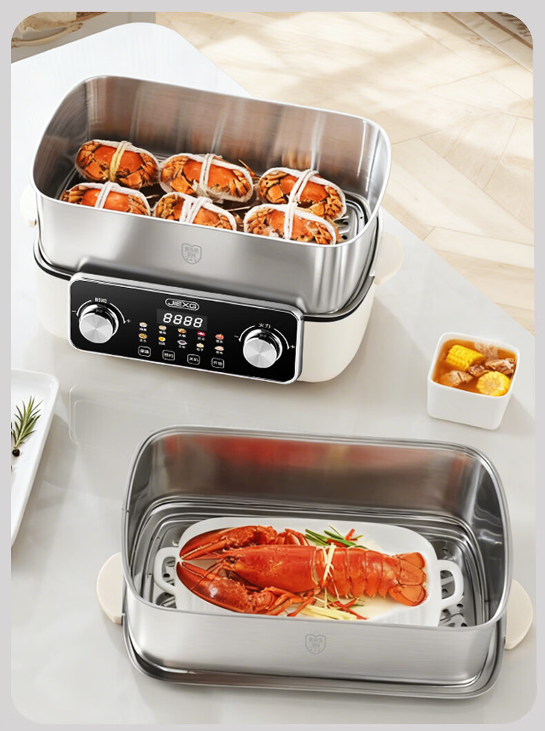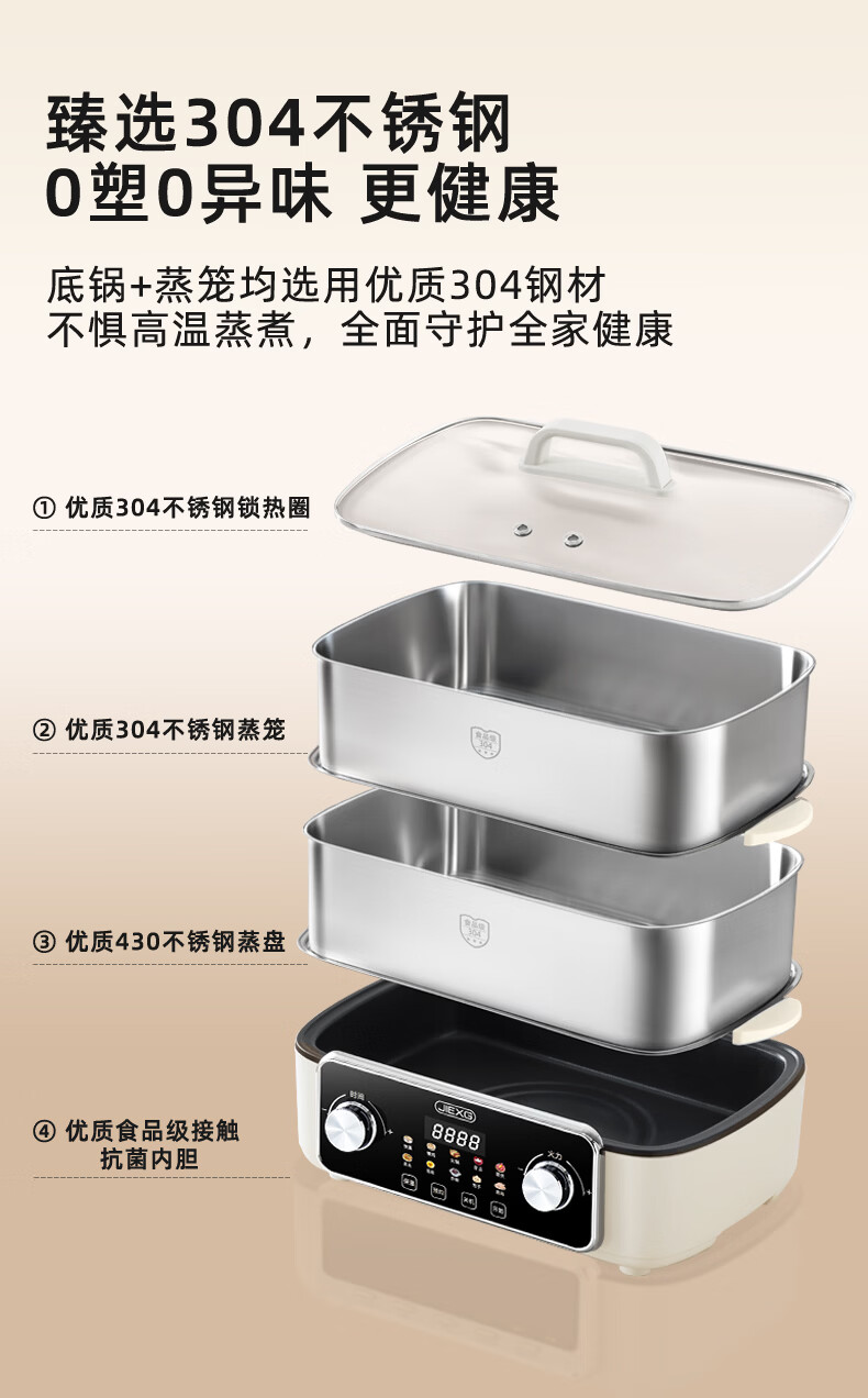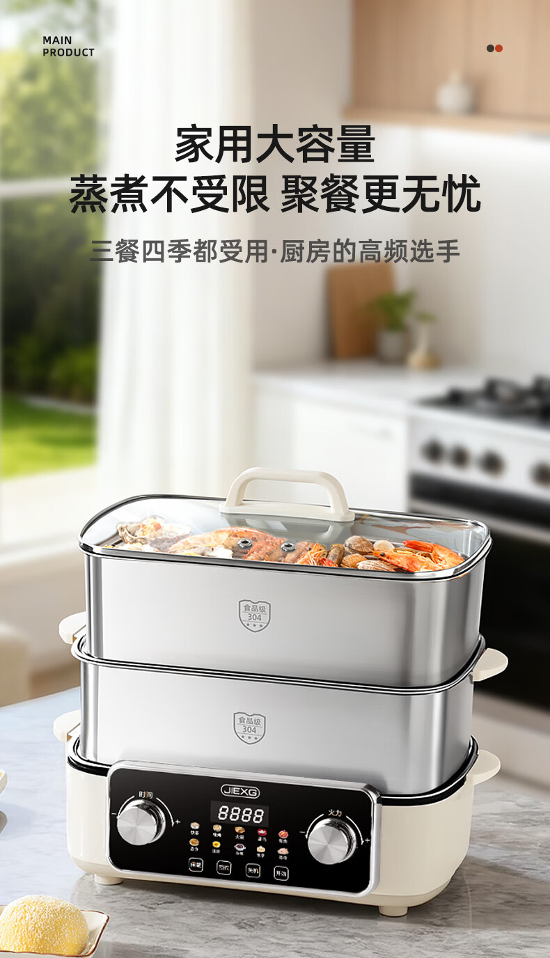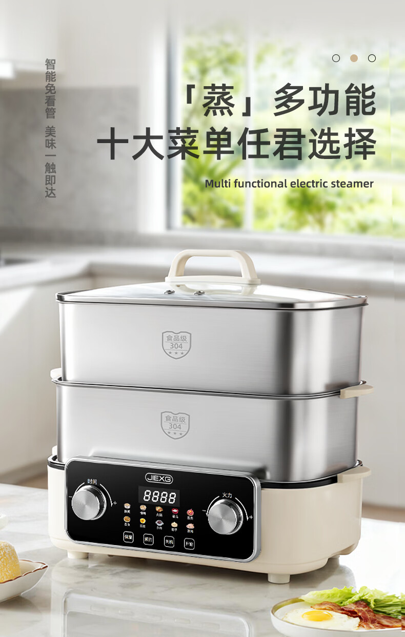 JIEXG电蒸锅炖蒸煮一体分体式不锈钢0涂层0塑大容量多功能家用电煮锅电火锅预约定时大功率 34L 三层【1500W】可预约