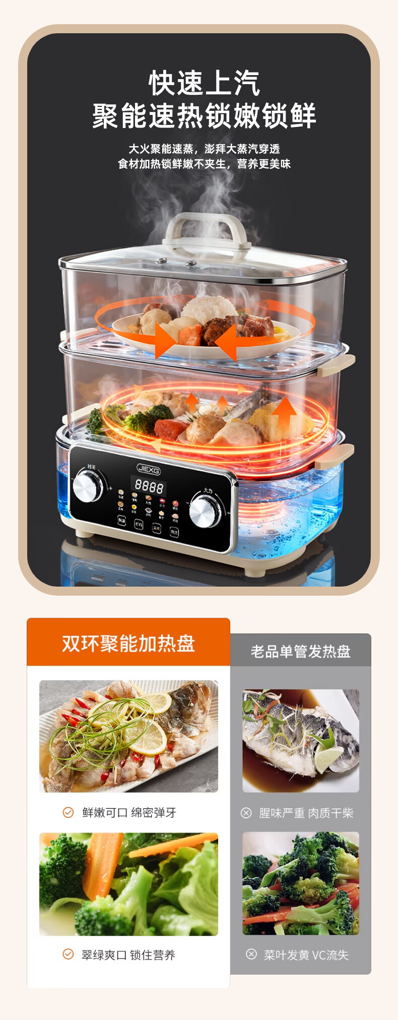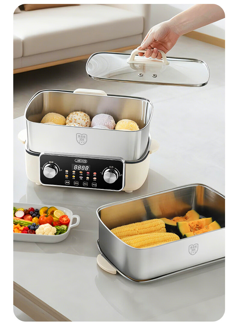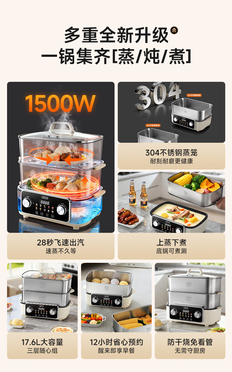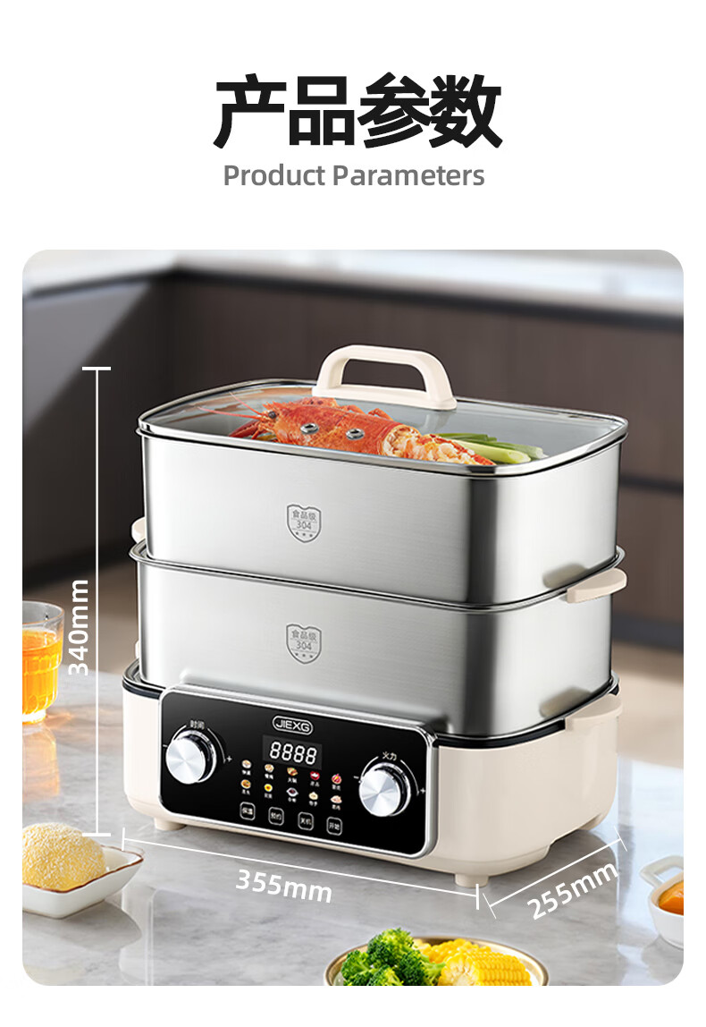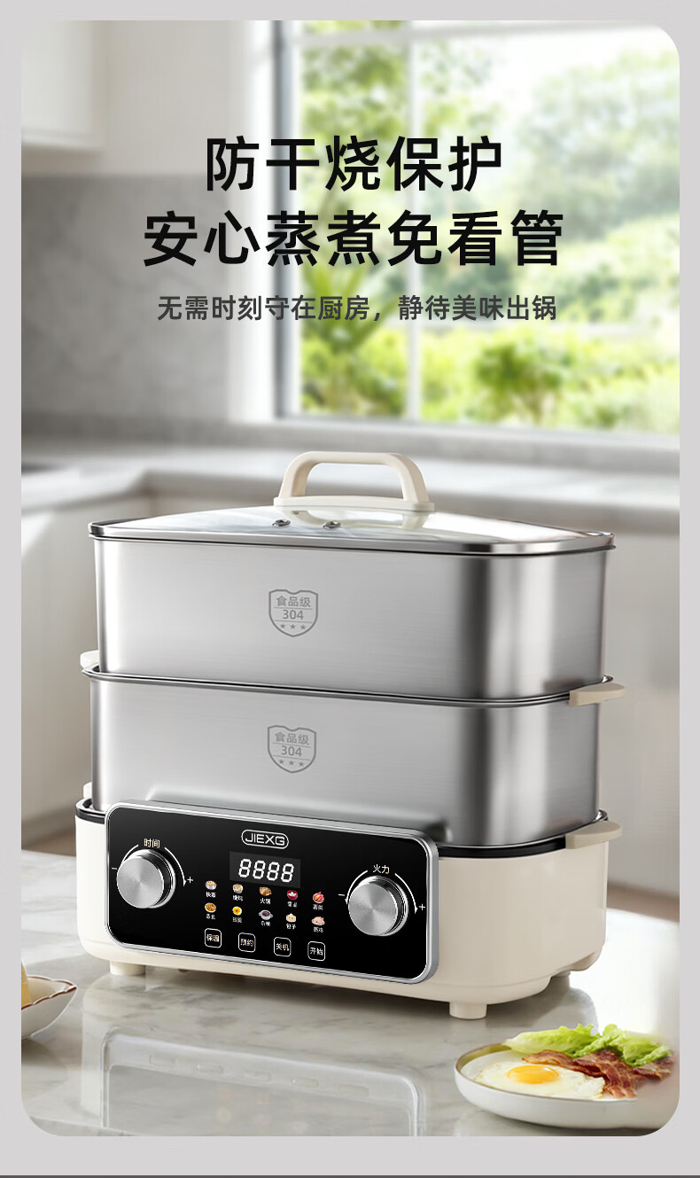 JIEXG电蒸锅炖蒸煮一体分体式不锈钢0涂层0塑大容量多功能家用电煮锅电火锅预约定时大功率 34L 三层【1500W】可预约