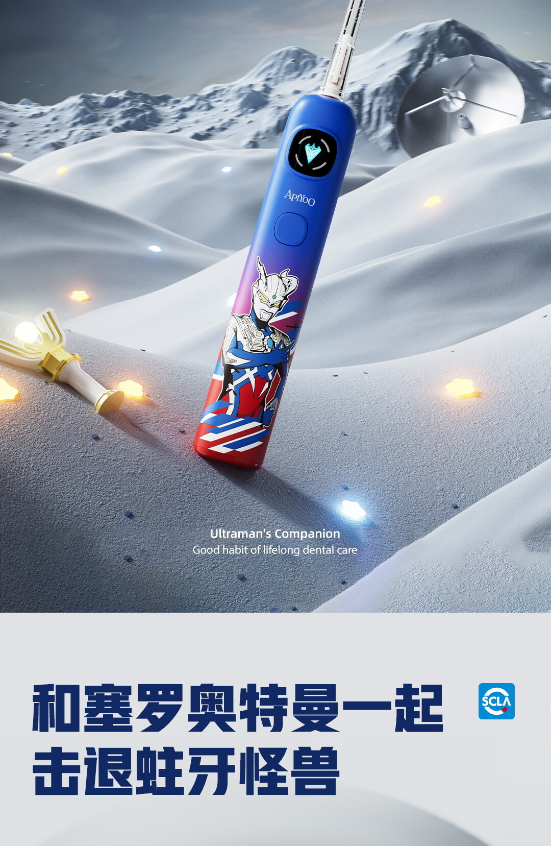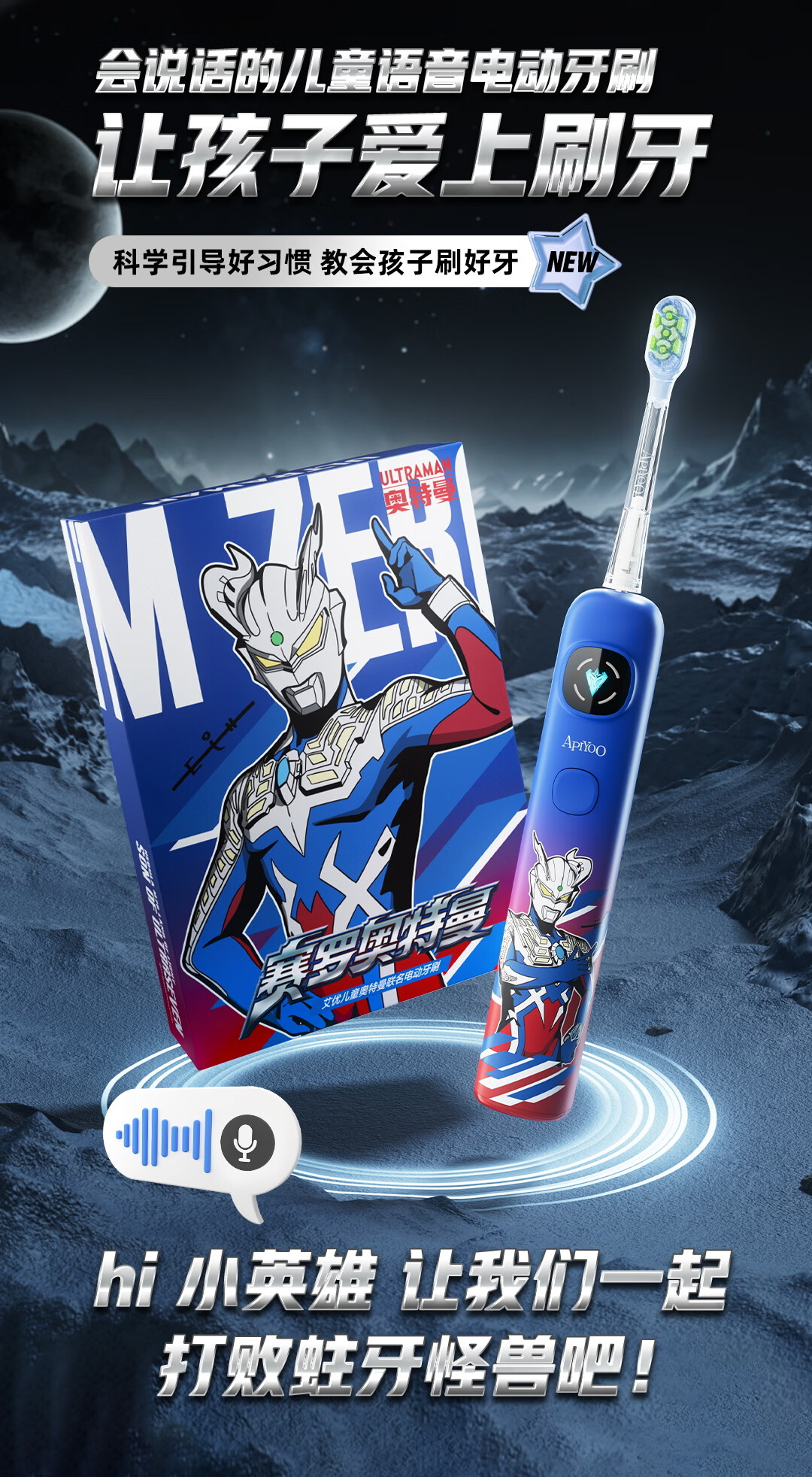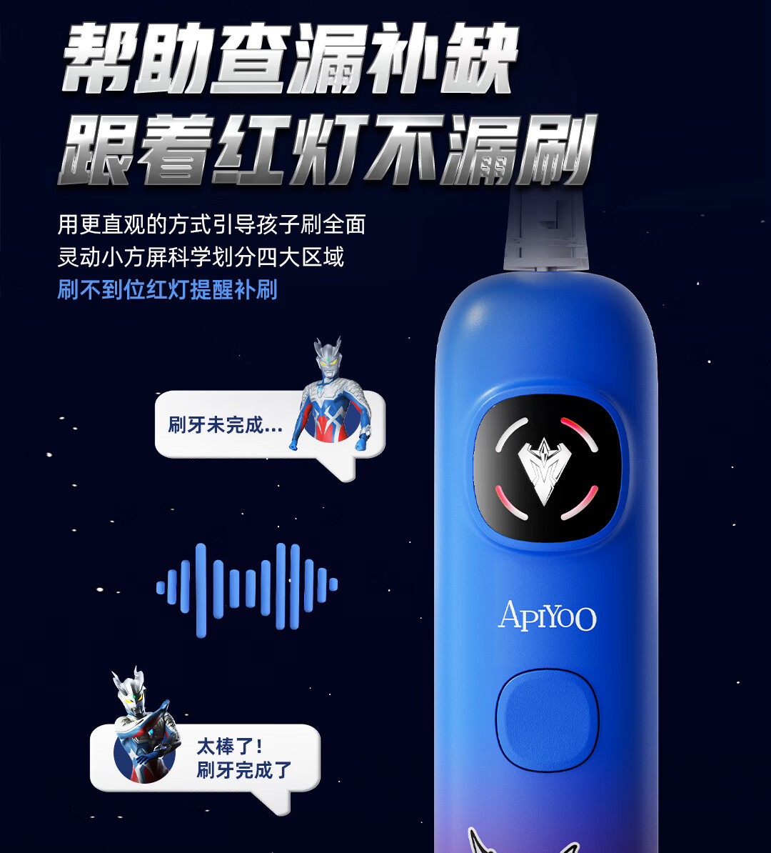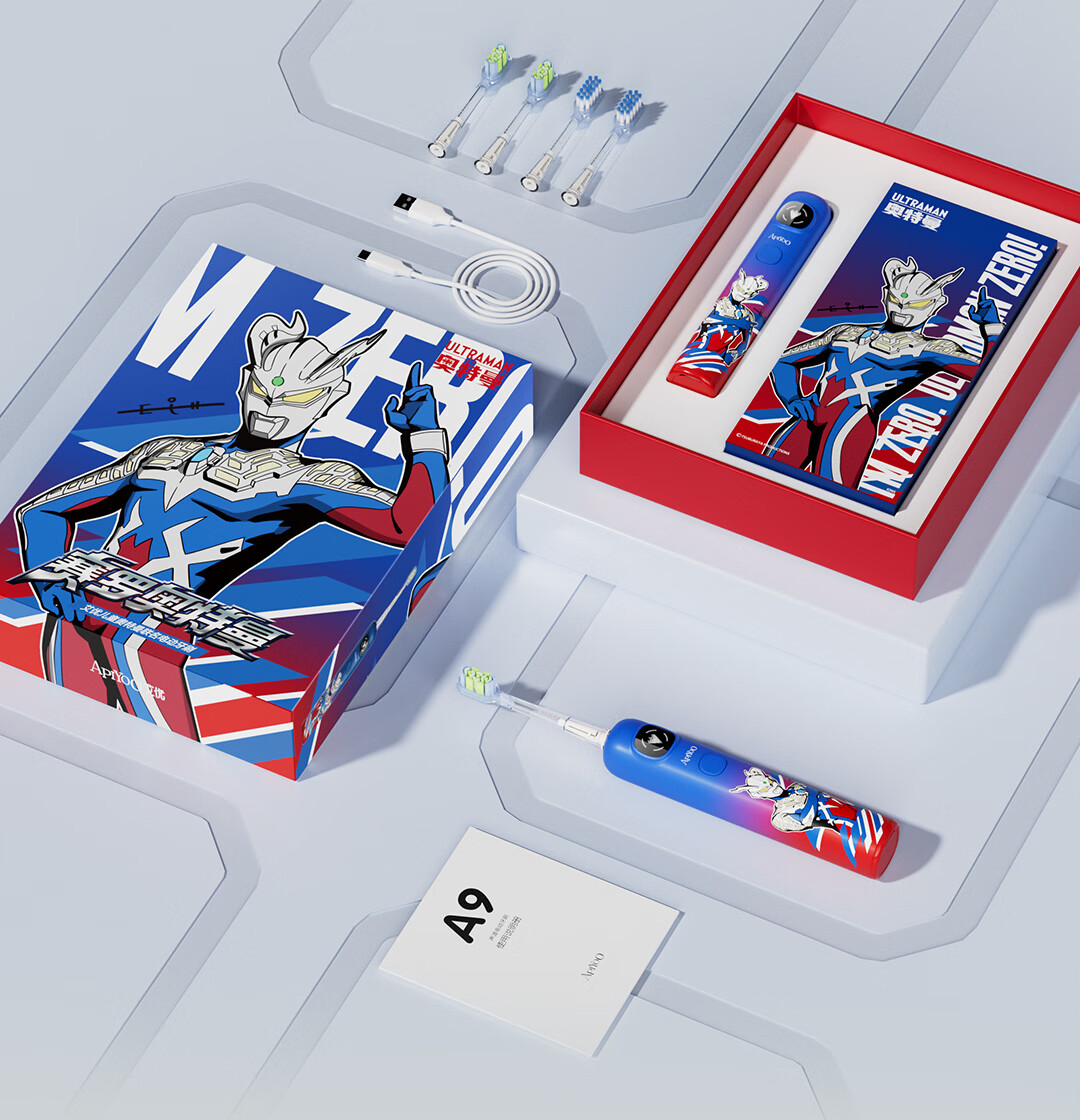 ApiYoo艾优A9pro-F奥特曼儿童电动牙刷蓝色消毒套装 语音漏刷提醒3-15岁男孩儿童节日礼物青少年12岁以上