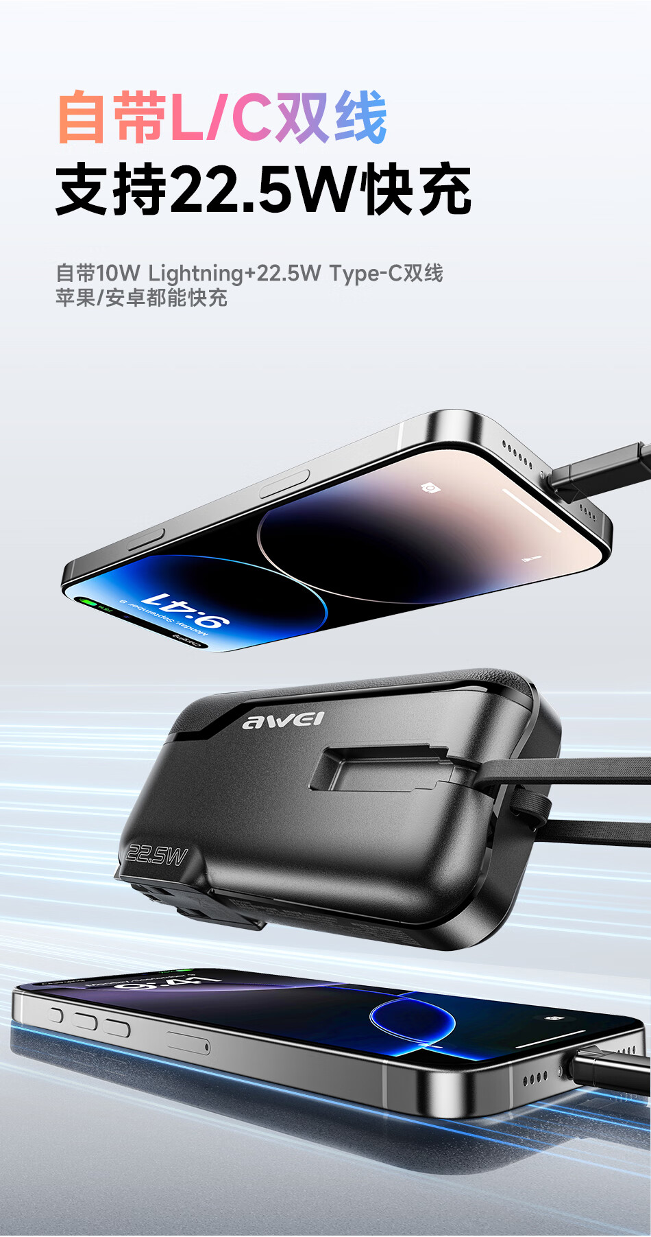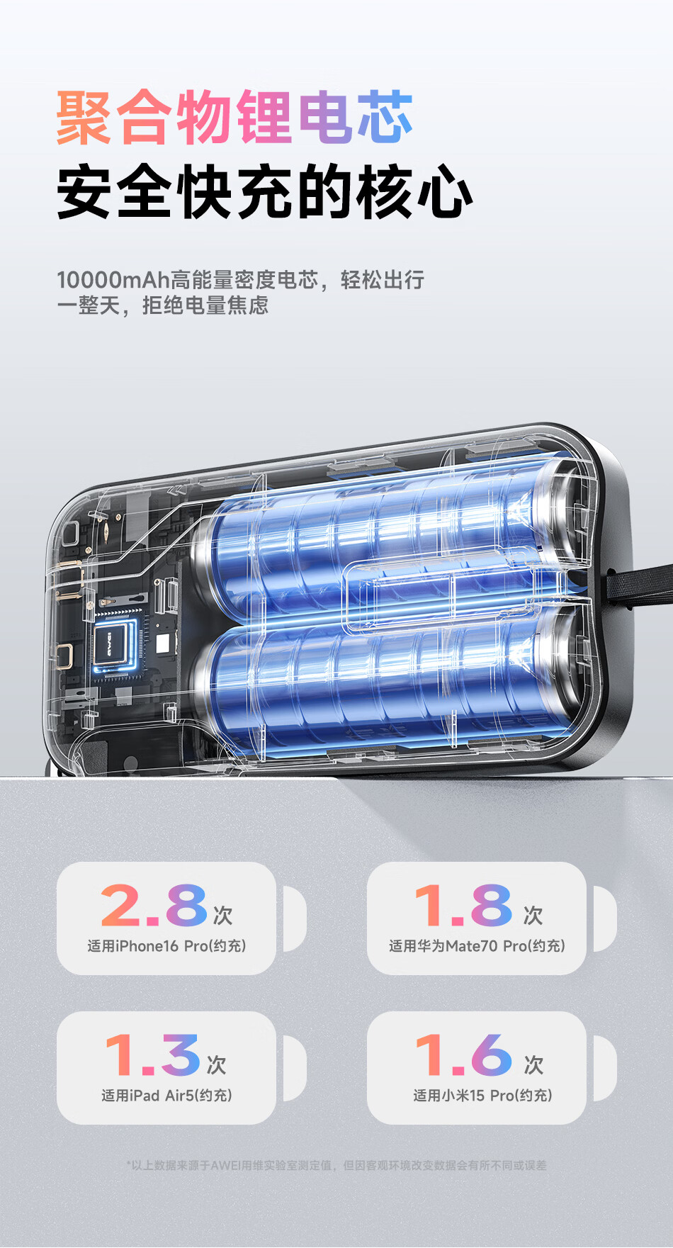 用维(AWEI)充电宝10000毫安容量自带双线22.5W快充移动电源迷你超薄小巧便携适用苹果17【3C认证可上飞机】 紫色丨电量数显丨自带苹果+Type-C双线 10000mAh