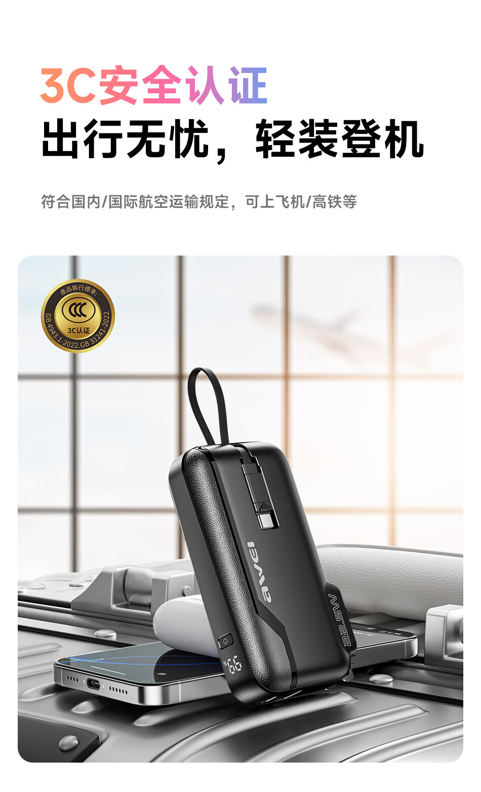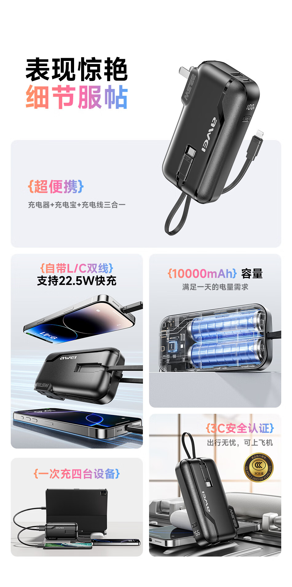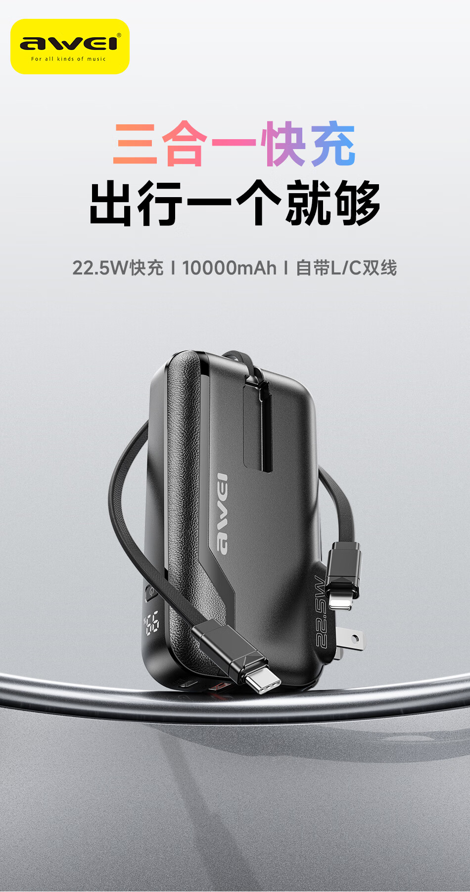 用维(AWEI)充电宝三合一10000毫安自带折叠插头充电器自带双线快充小巧移动电源适用苹果【3C认证可上飞机】 三合一【黑色-22.5W闪充】C+L双线丨折叠插头 10000mAh