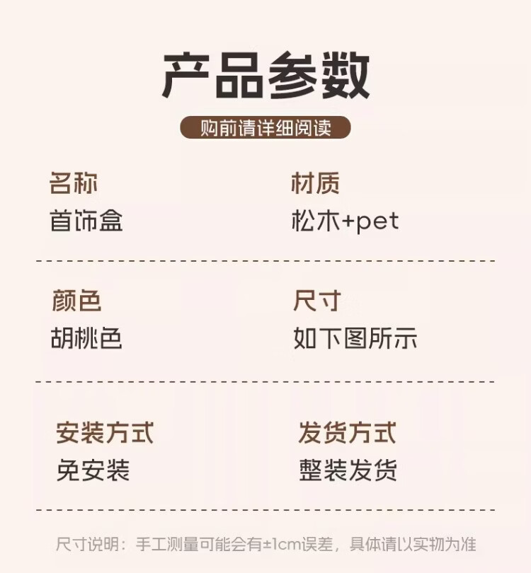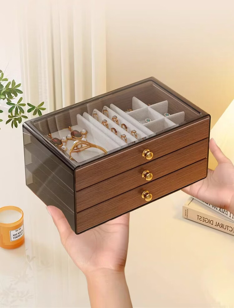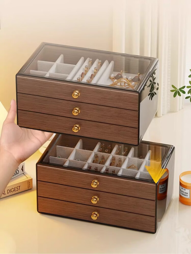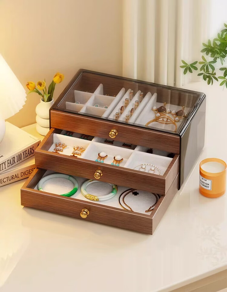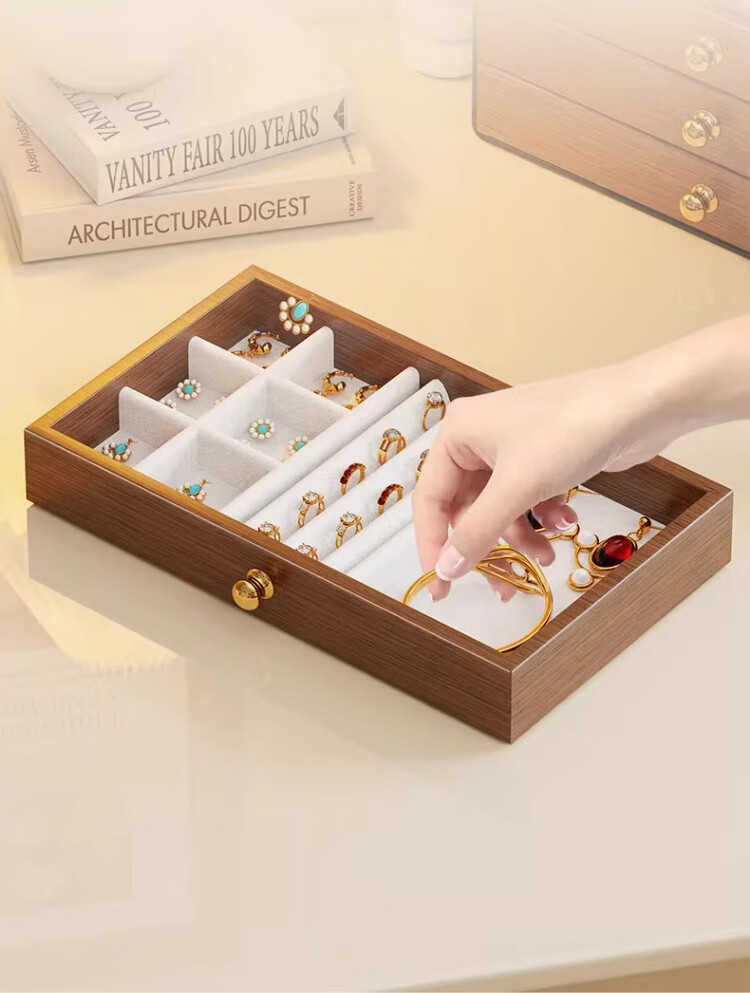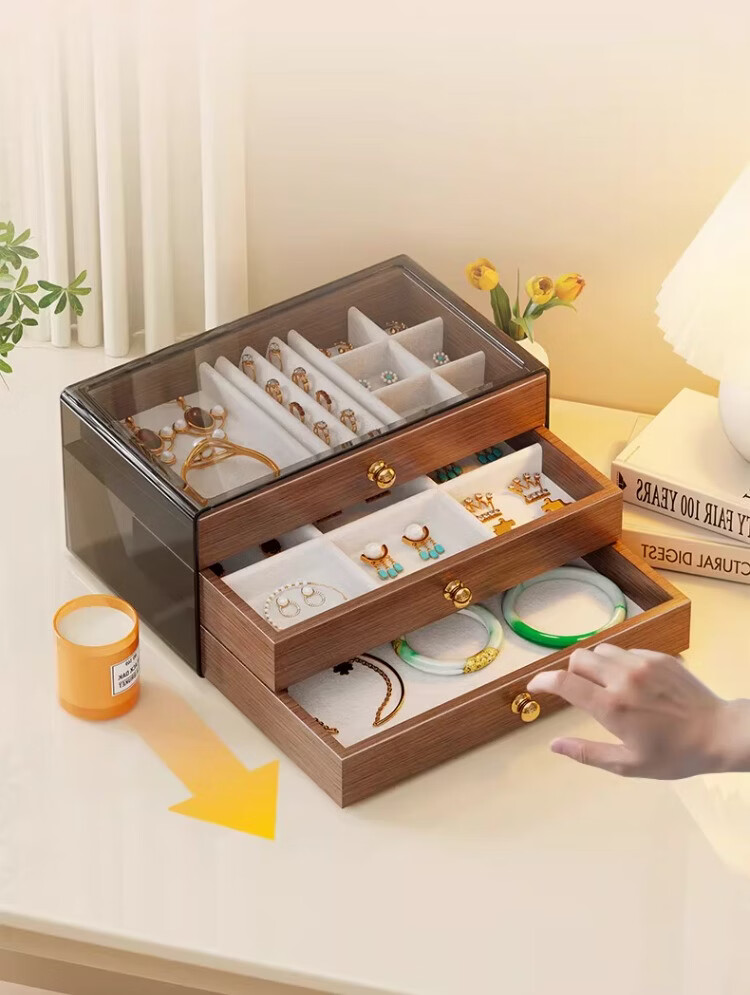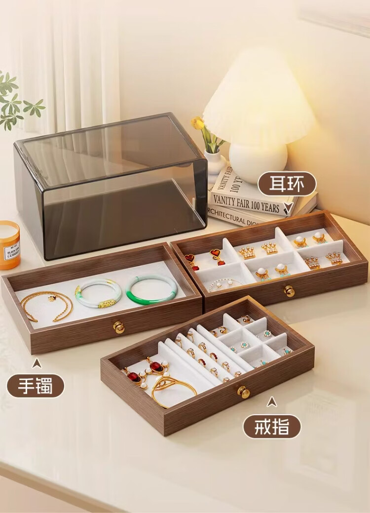 尔思家首饰收纳盒带抽屉防尘饰品胡桃木多层大容量五金珠宝手串展示架 胡桃木-三合一