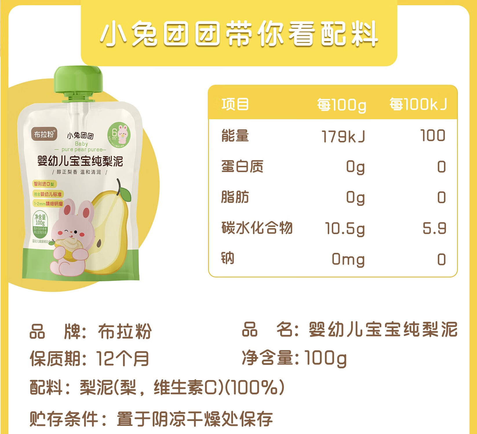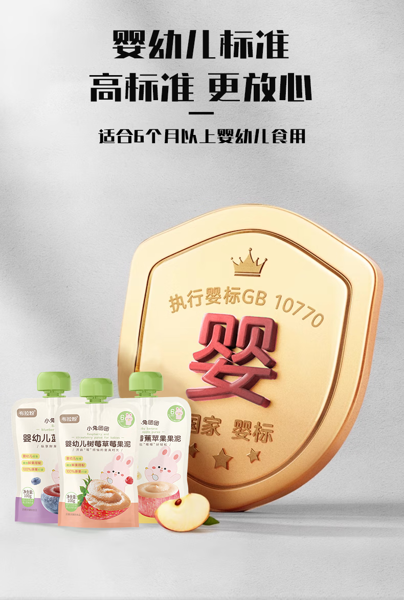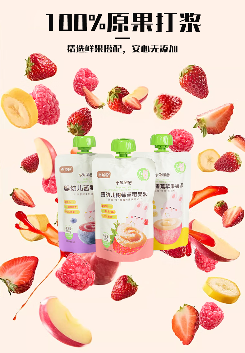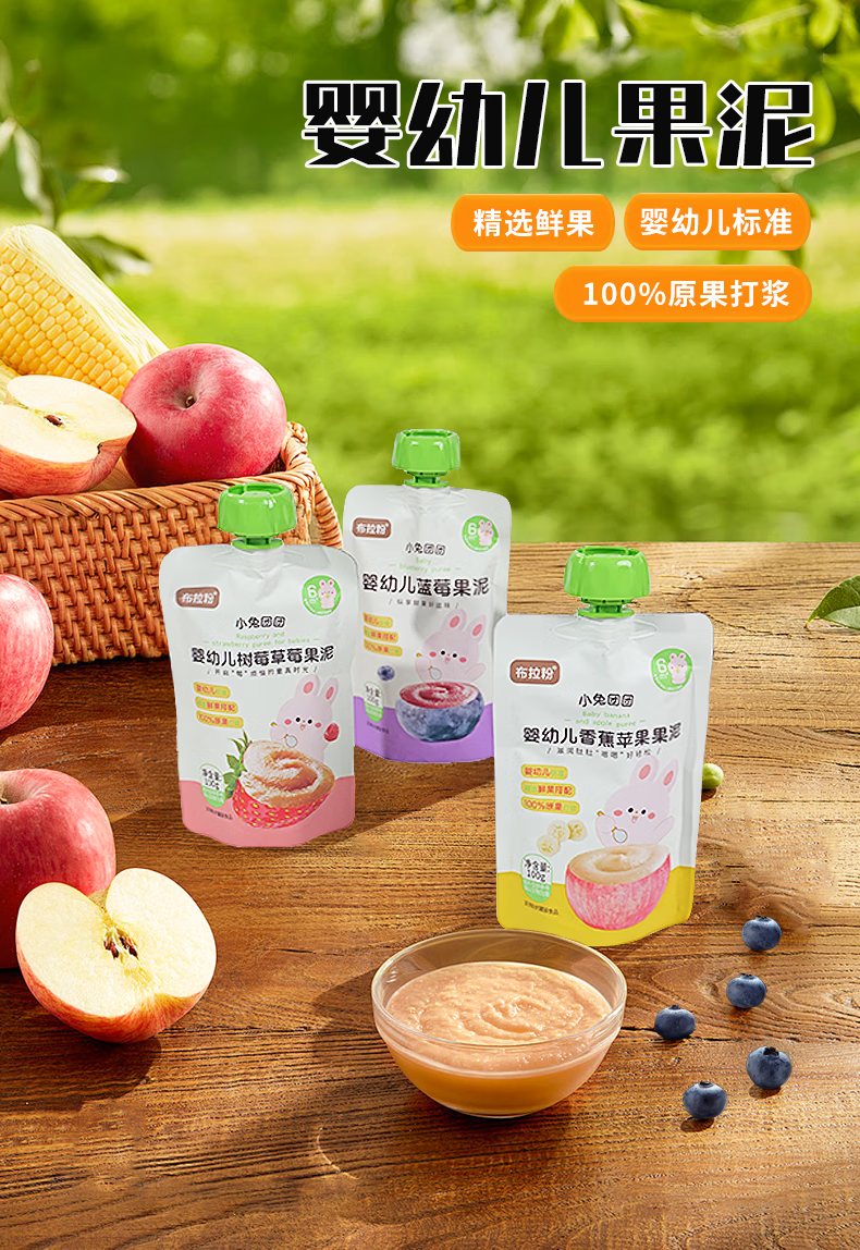 布拉粉小兔团团婴幼儿果泥树莓苹果香蕉多口味宝宝辅食儿童零食 婴幼儿蓝莓果泥 100g*5袋