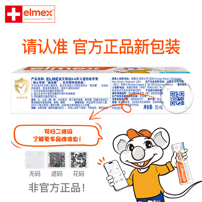 ELMEX艾美适宝宝儿童牙膏0-3-6岁婴儿奥拉氟防蛀含氟固齿牙龈护理50ml