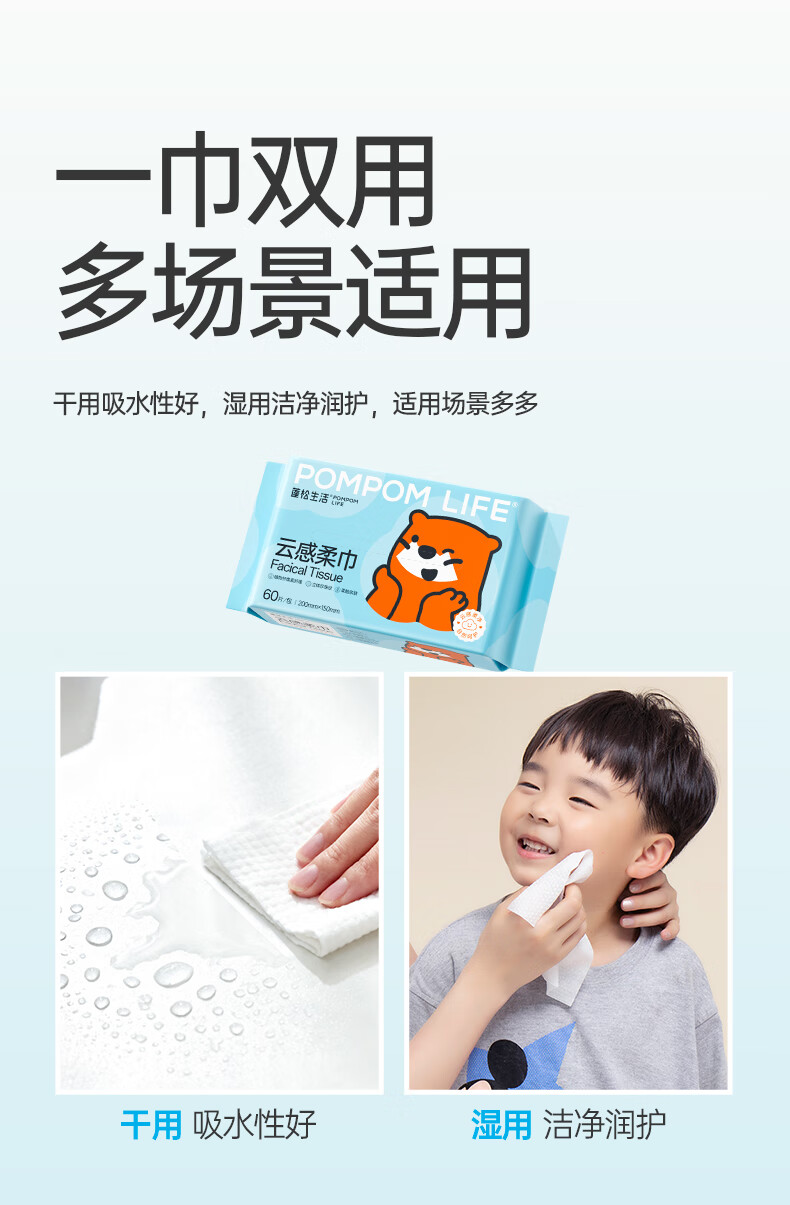 蓬松生活绵柔巾新生婴儿宝宝一次性洗脸巾干湿两用洗面巾柔巾 60抽*5包