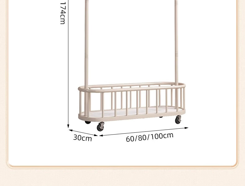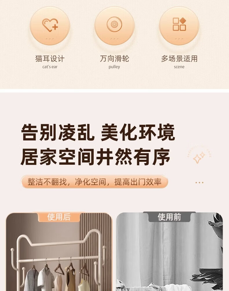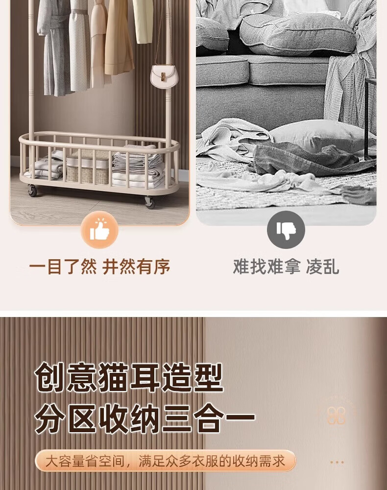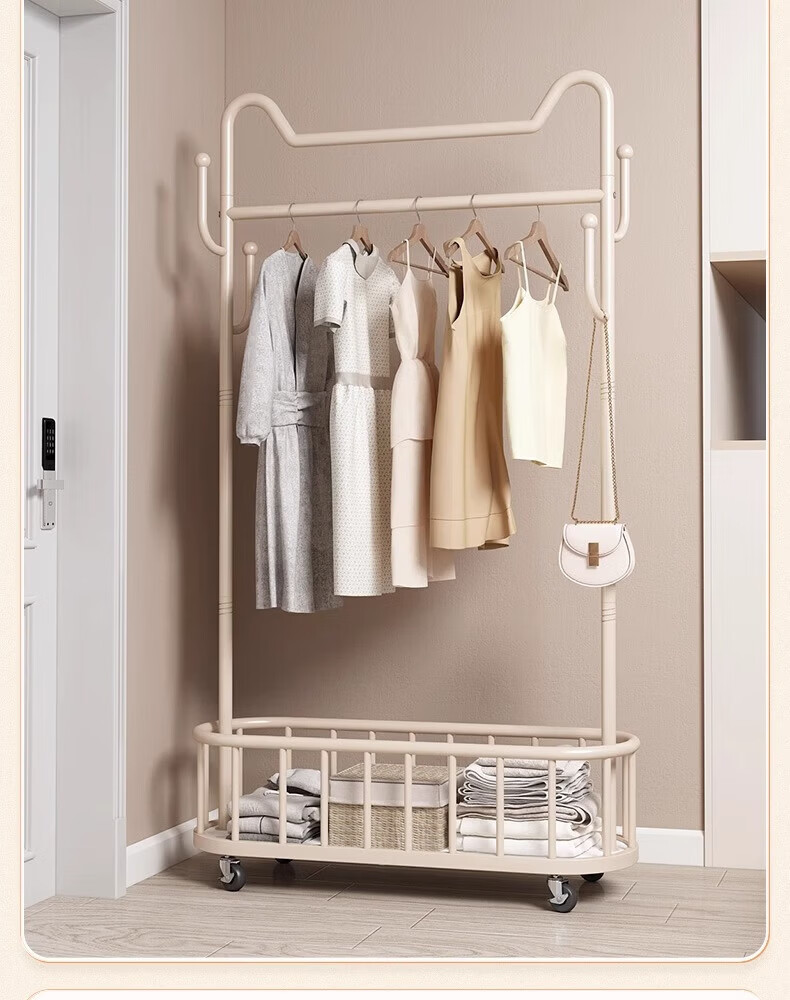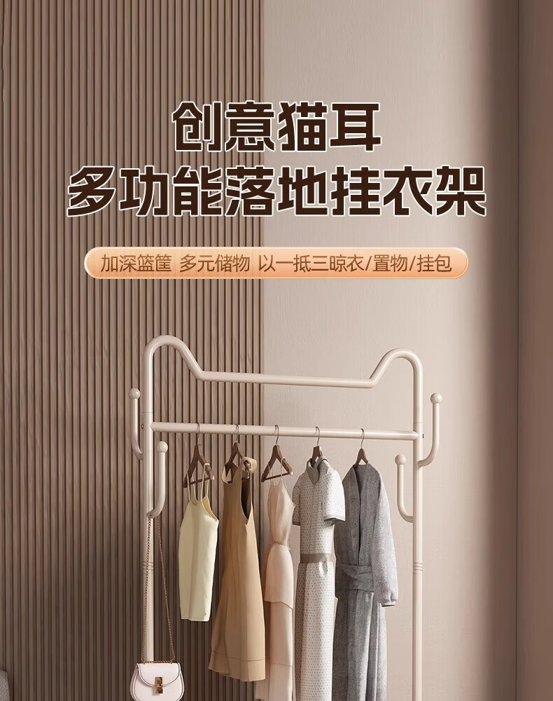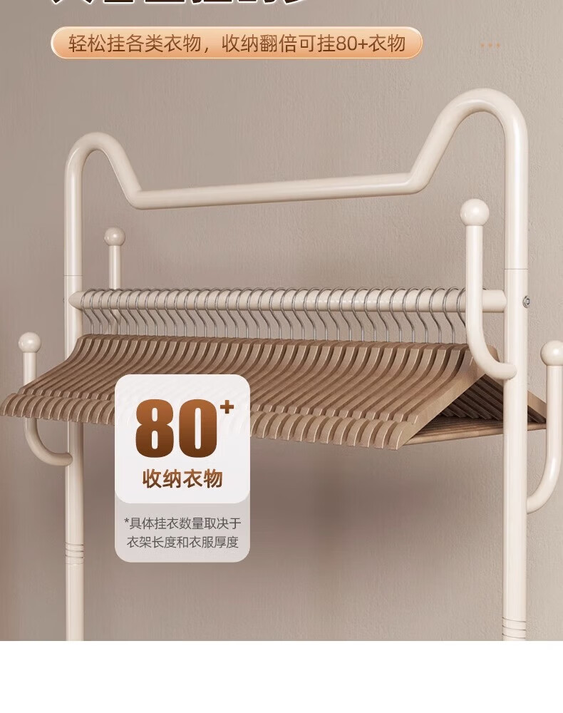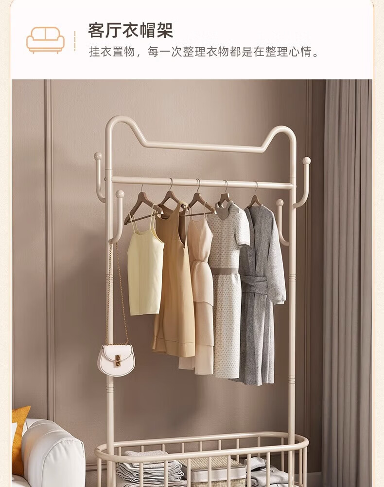 馨婺家加粗挂衣架落地卧室衣帽架多功能带轮移动晾衣服架房间收纳衣服架 猫耳朵 奶油白60cm