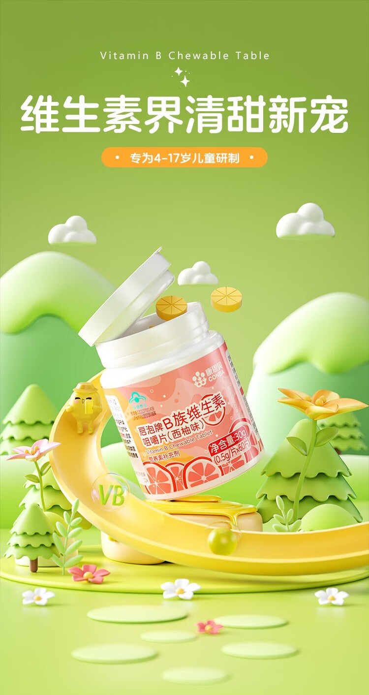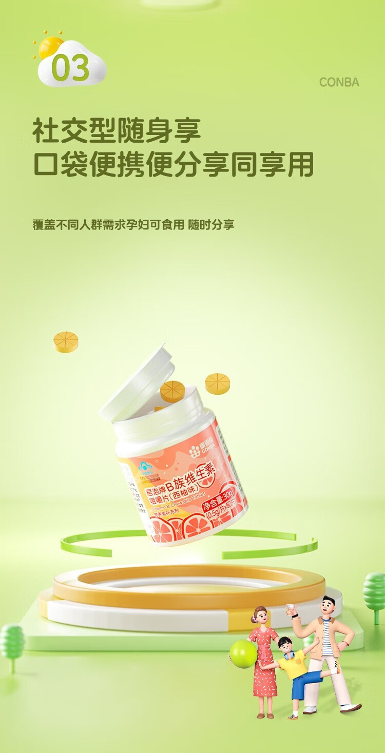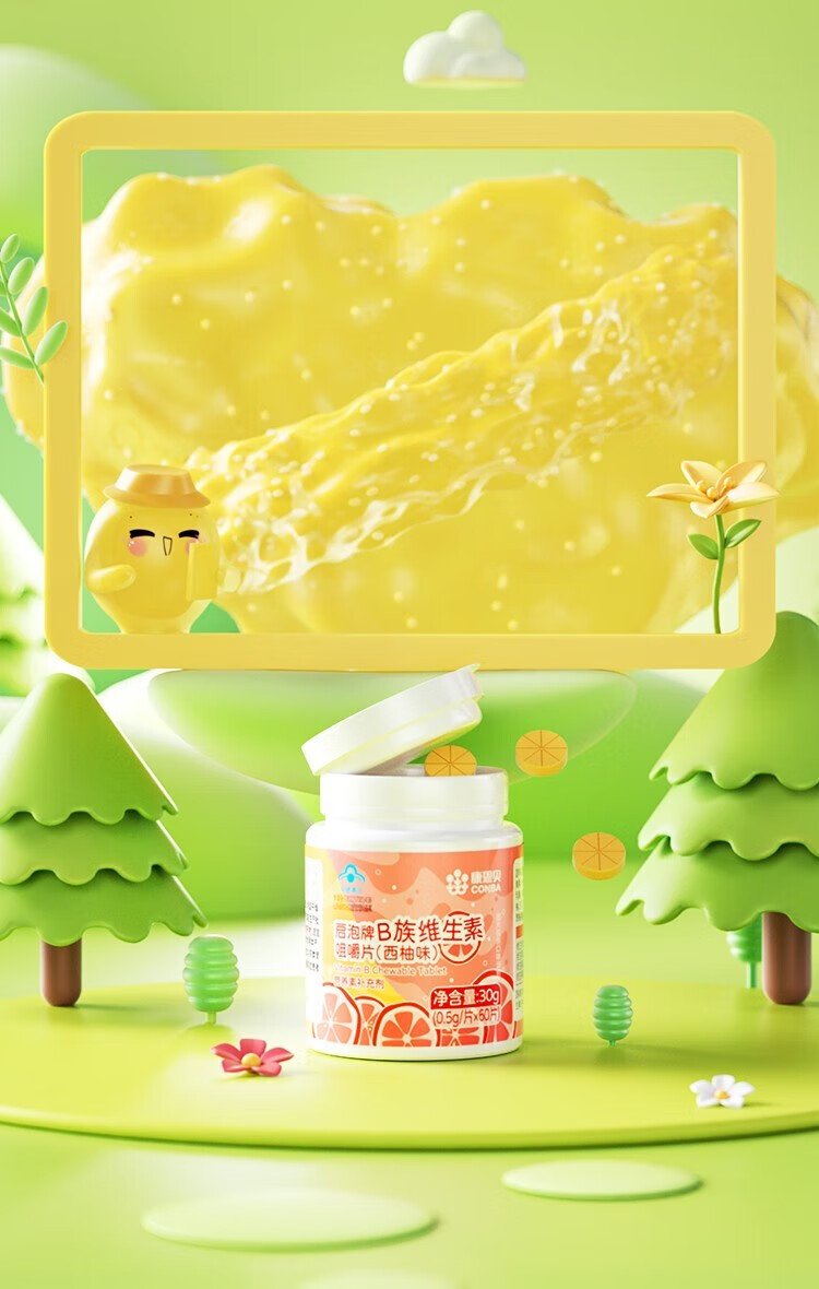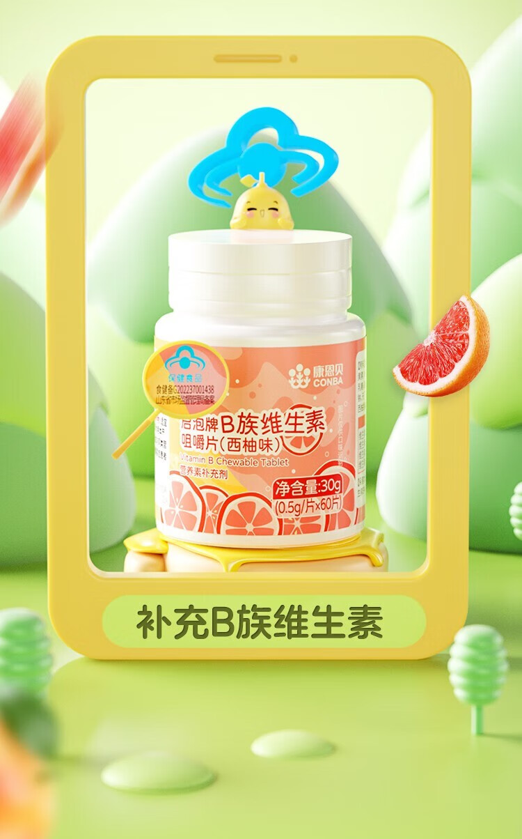 康恩贝儿童维生素b族多种复合维生素含B1B2B6b12可配儿童维C4-6岁6-13岁 B族泡腾咀嚼片60片【买2发3】