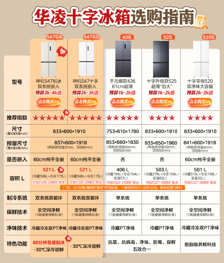 华凌美的出品406L十字双开门冰箱超薄风冷无霜一级能效双变频对开多门四门京东自营HR-426WSP国家补贴