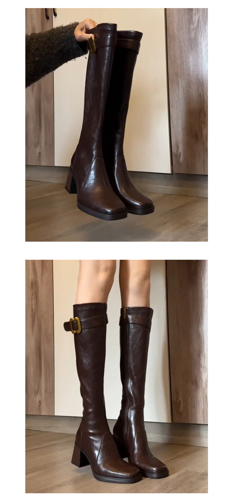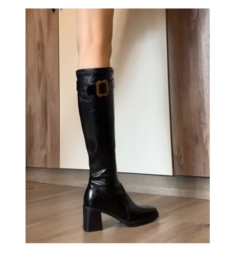 稻草人(MEXICAN)牛皮版真皮金属扣厚底不过膝长靴粗跟长筒靴女高筒瘦瘦靴骑士靴 棕色 35