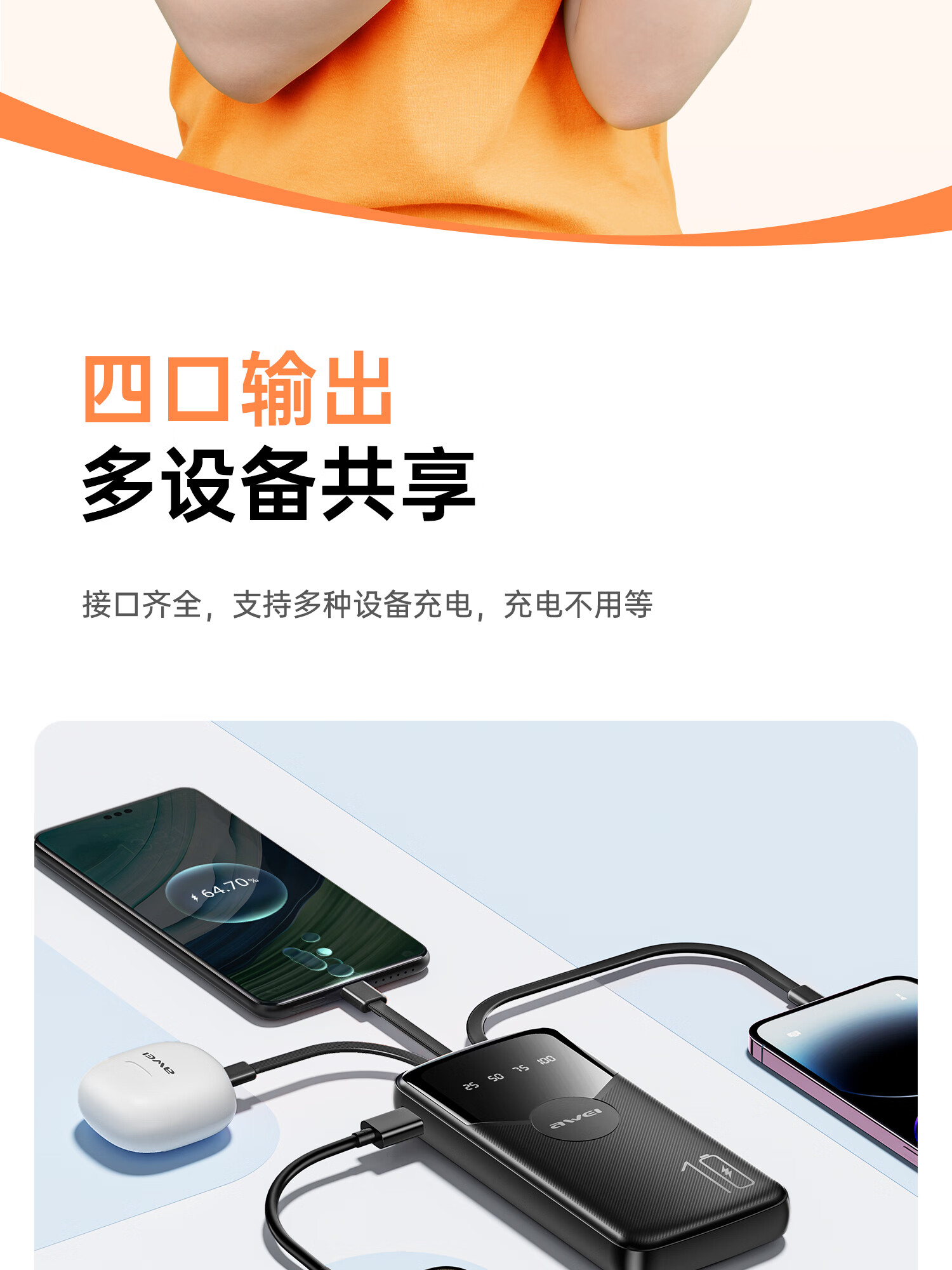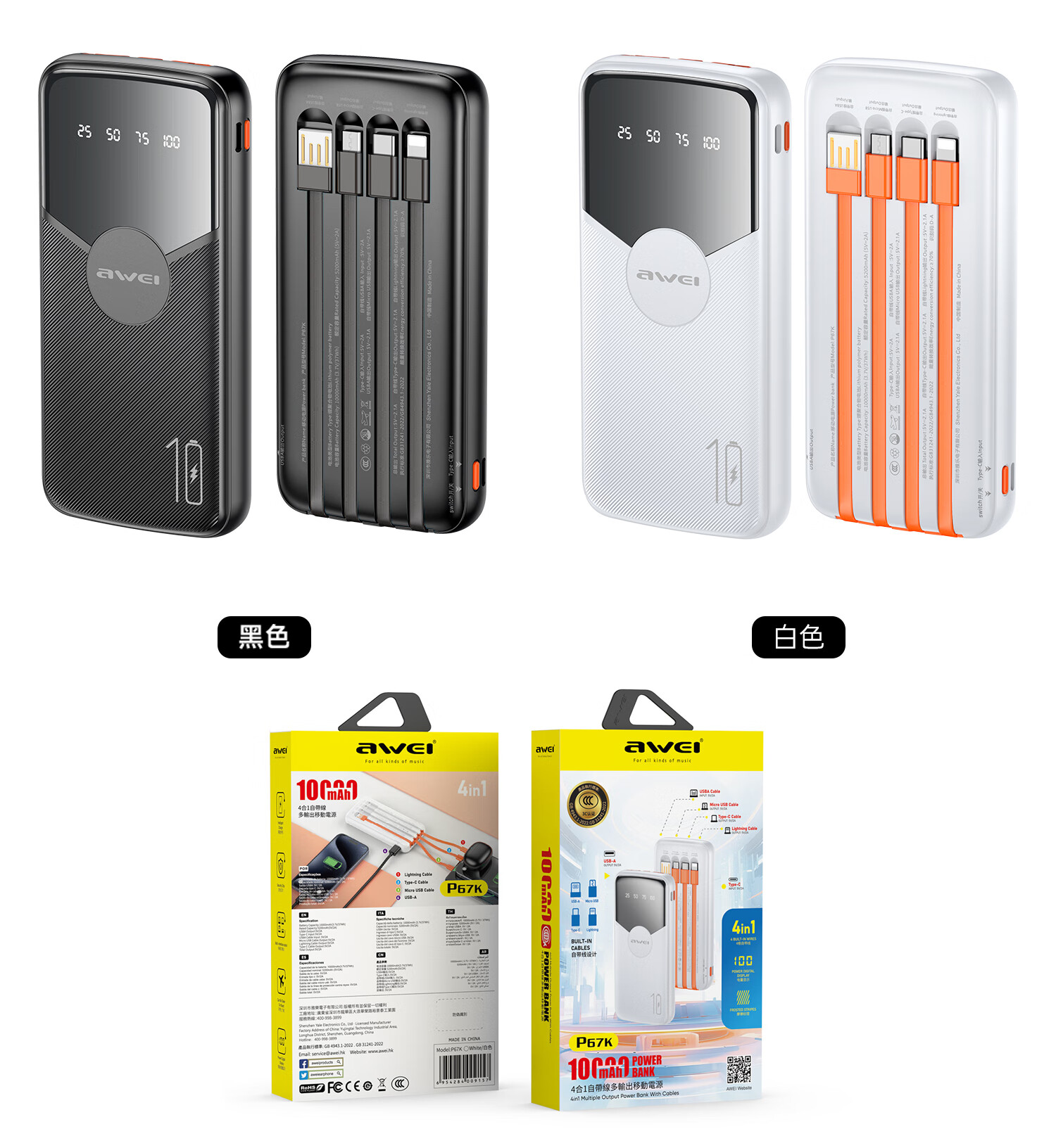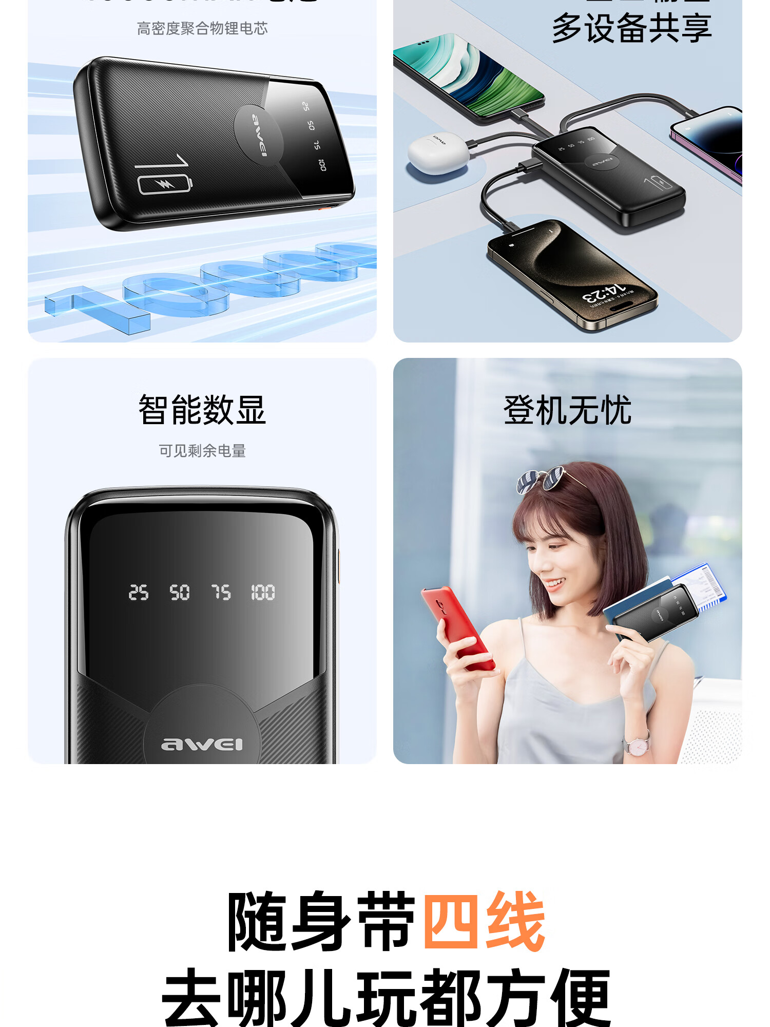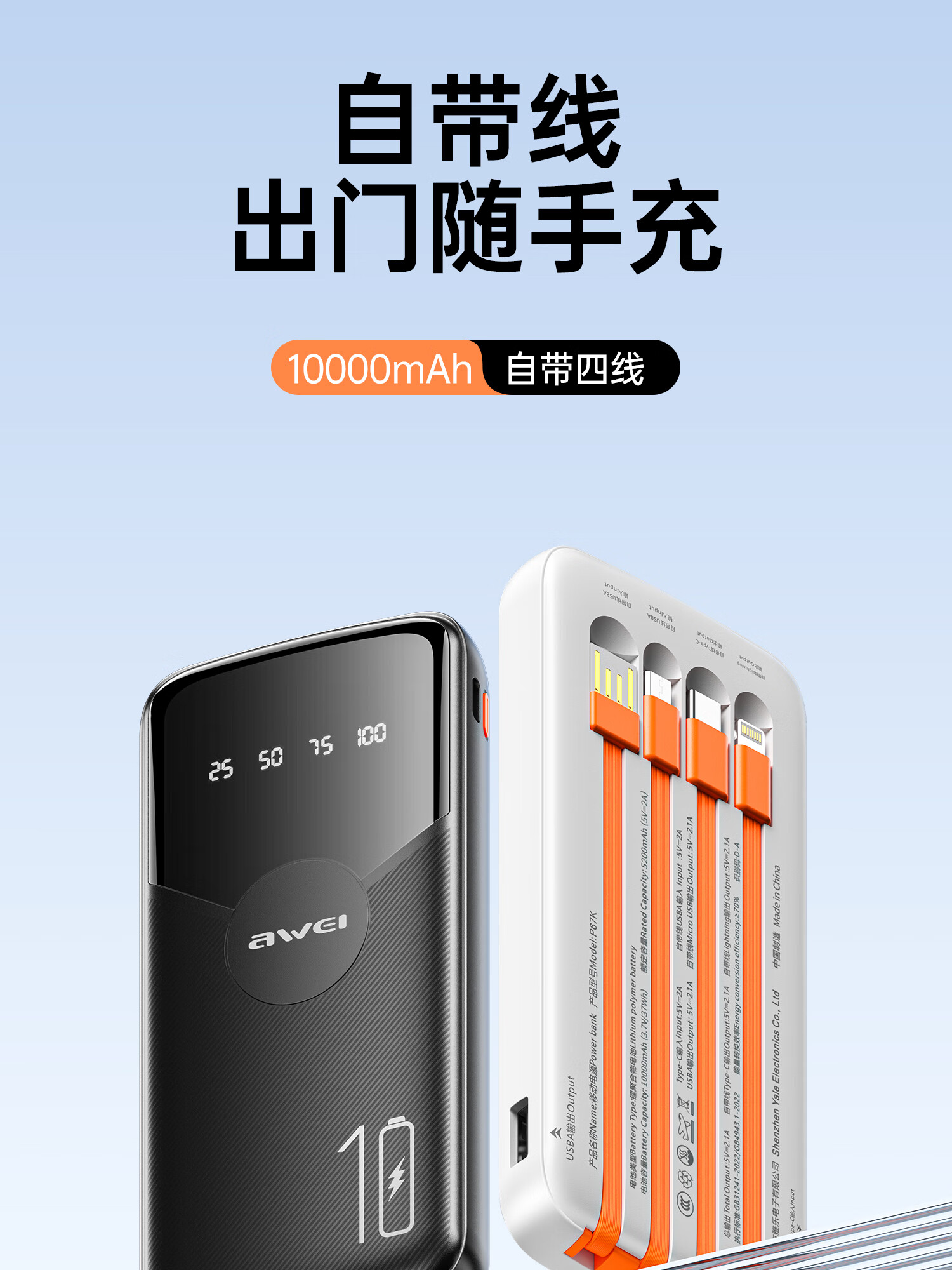 用维(AWEI)充电宝自带四线超大容量10000毫安超薄小巧移动电源快充适用苹果安卓【国家3C认证可上飞机】 黑色 10000mAh