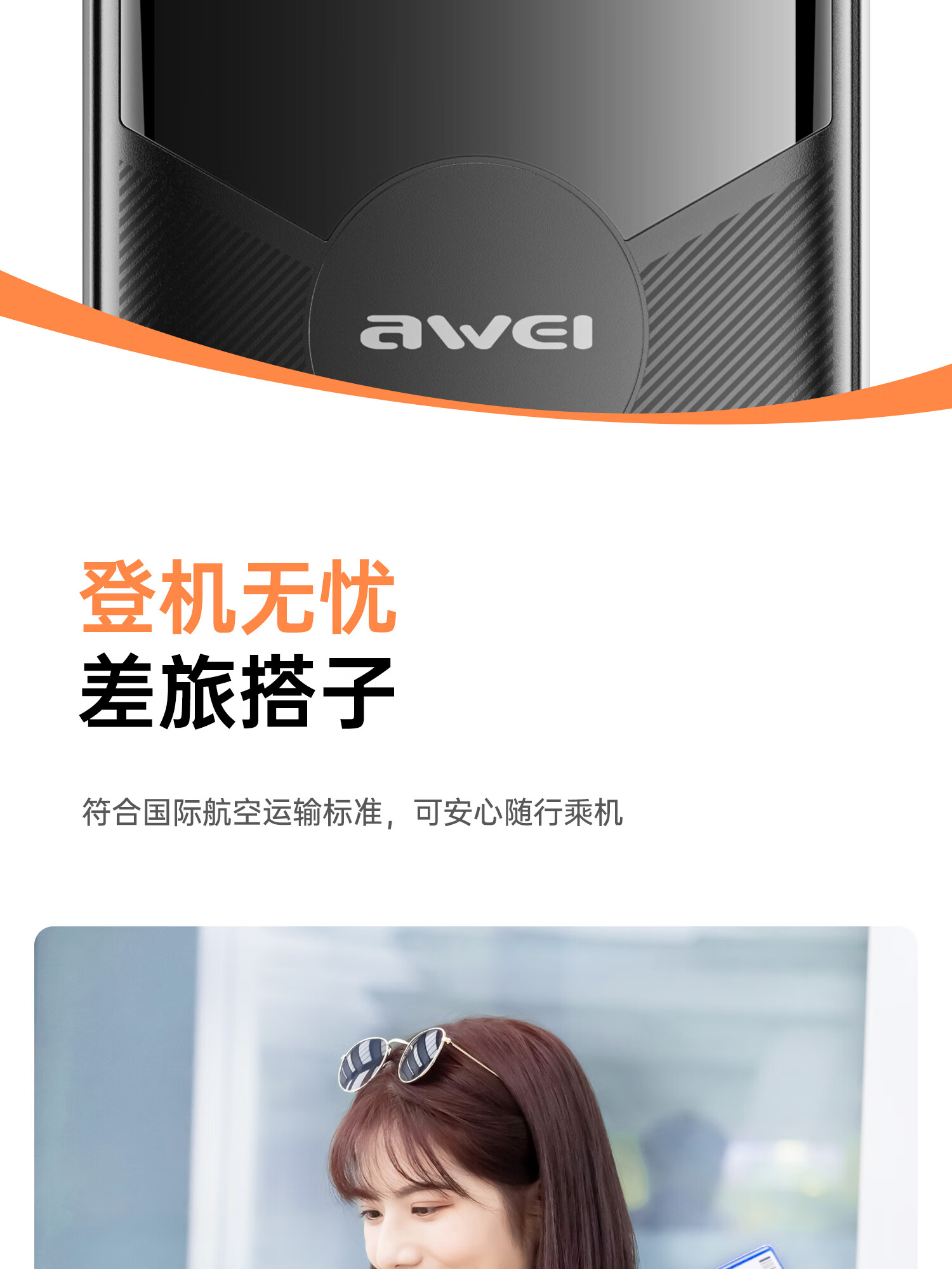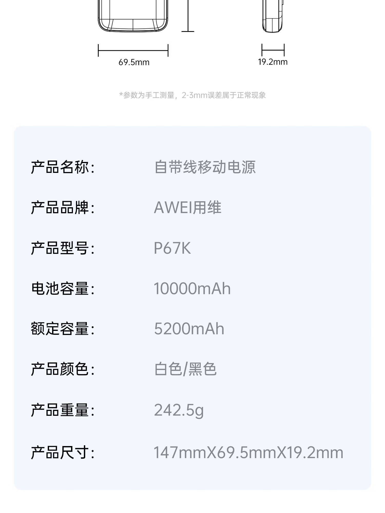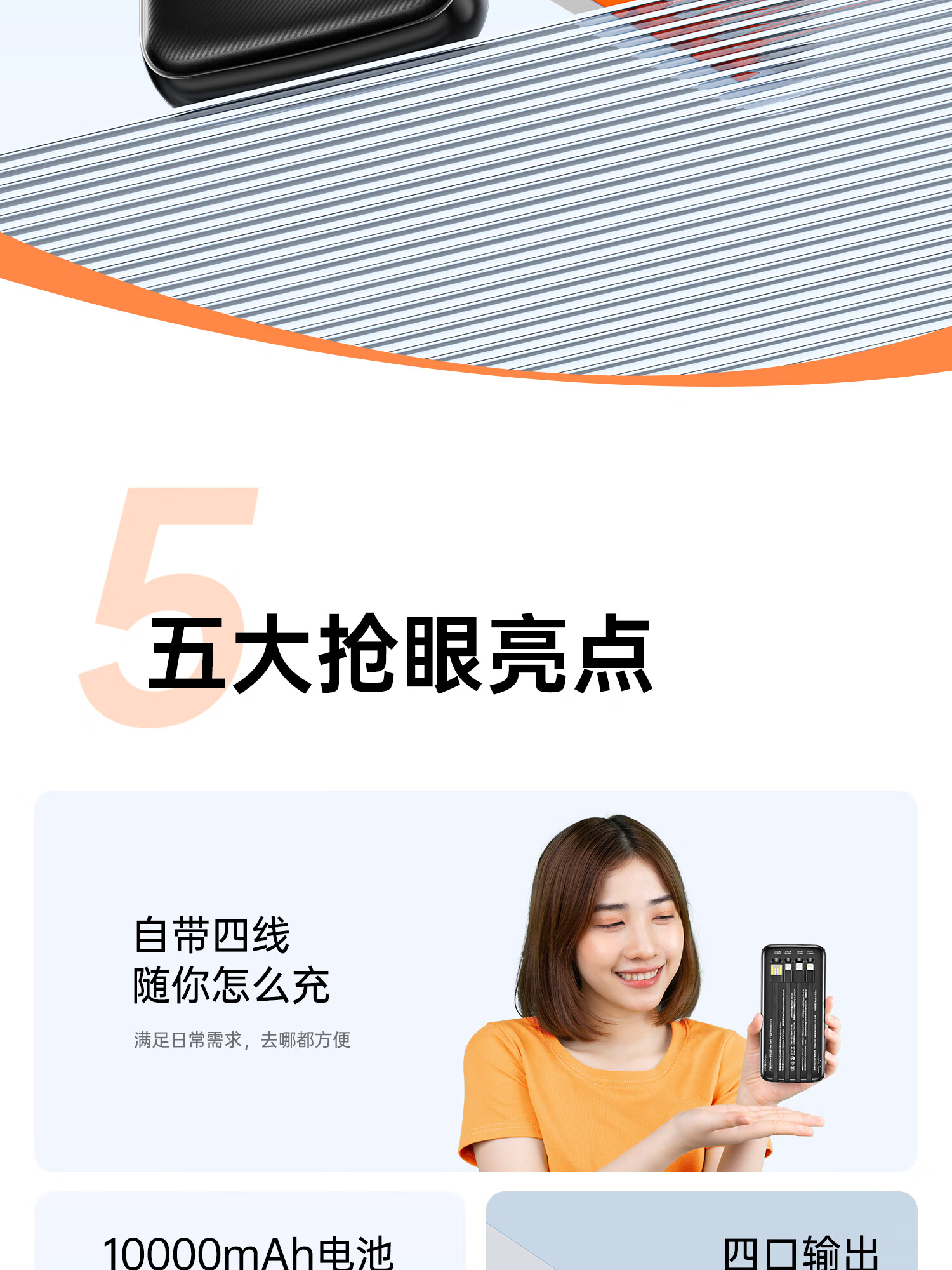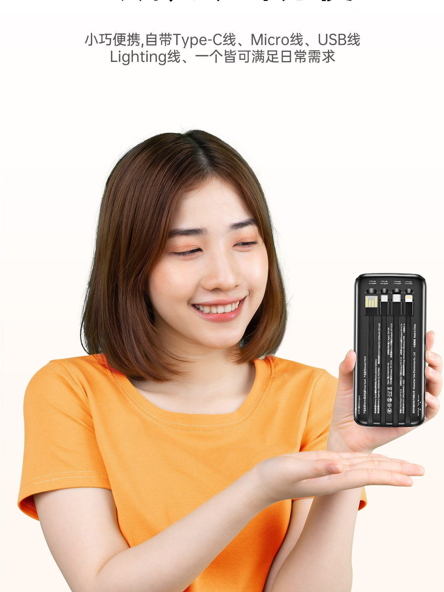 用维(AWEI)充电宝自带四线超大容量10000毫安超薄小巧移动电源快充适用苹果安卓【国家3C认证可上飞机】 黑色 10000mAh