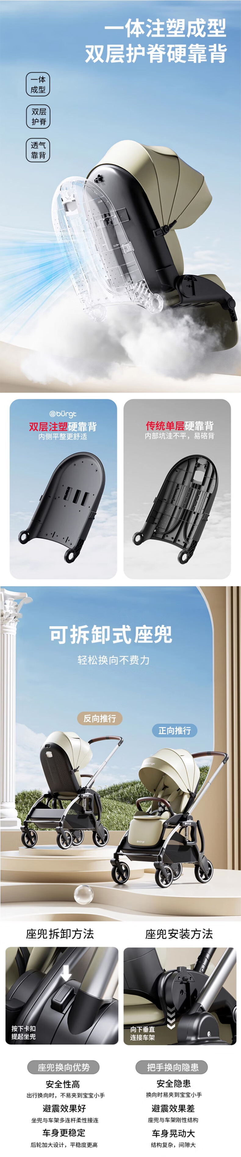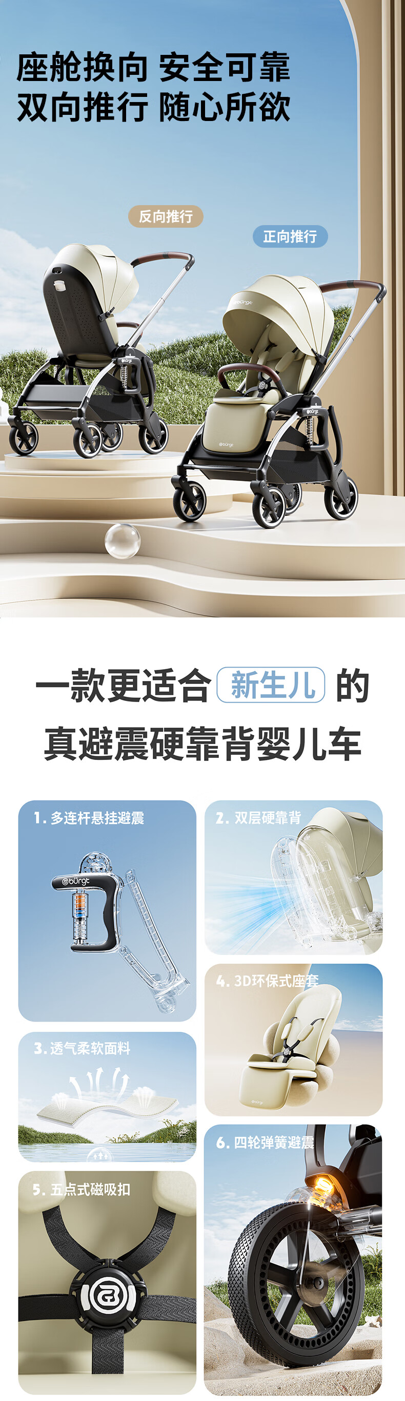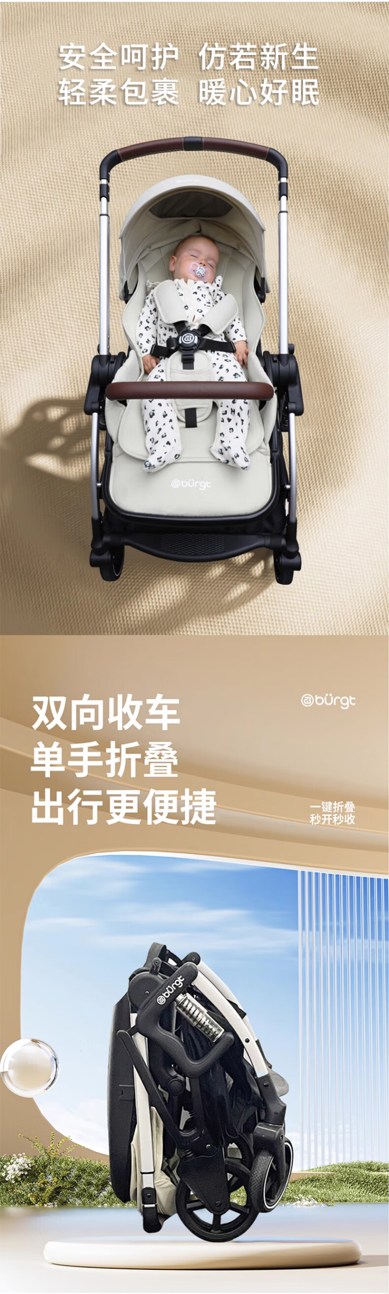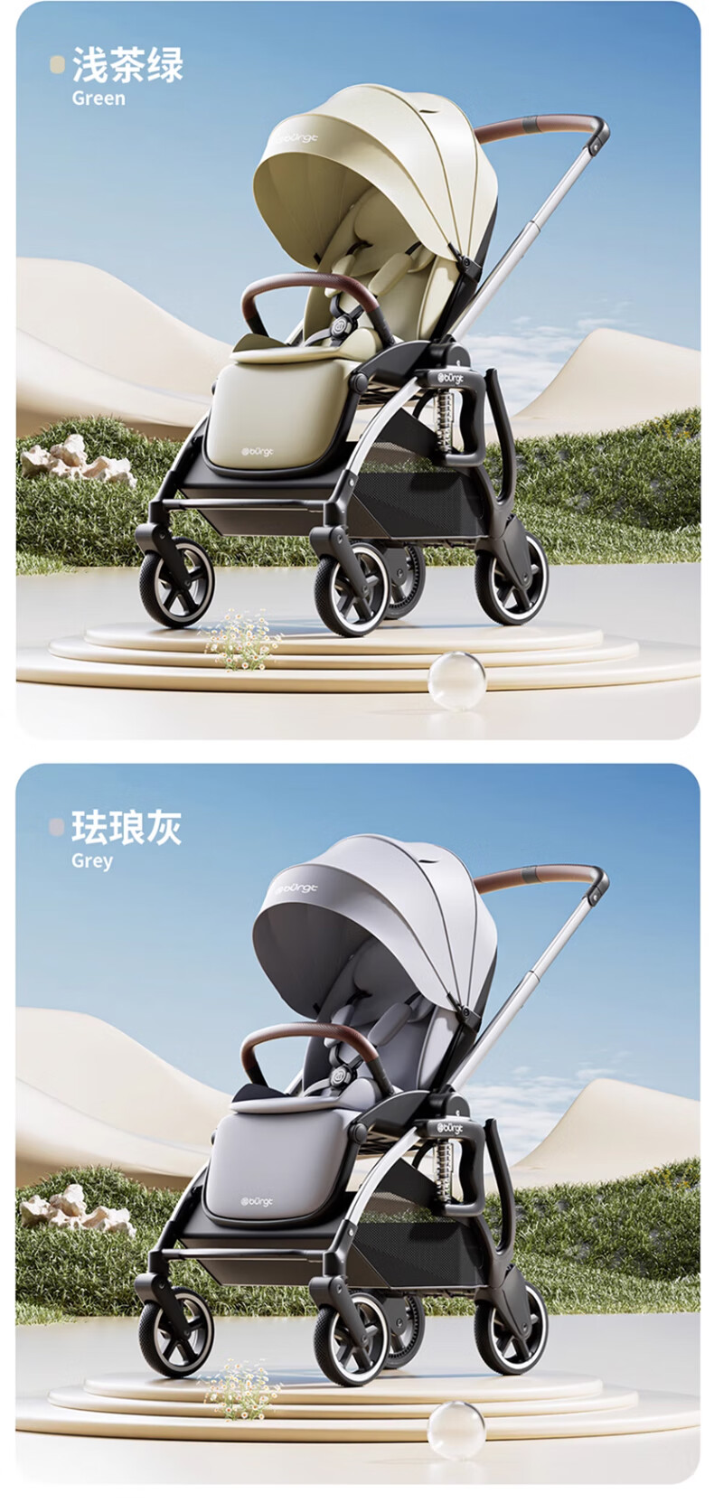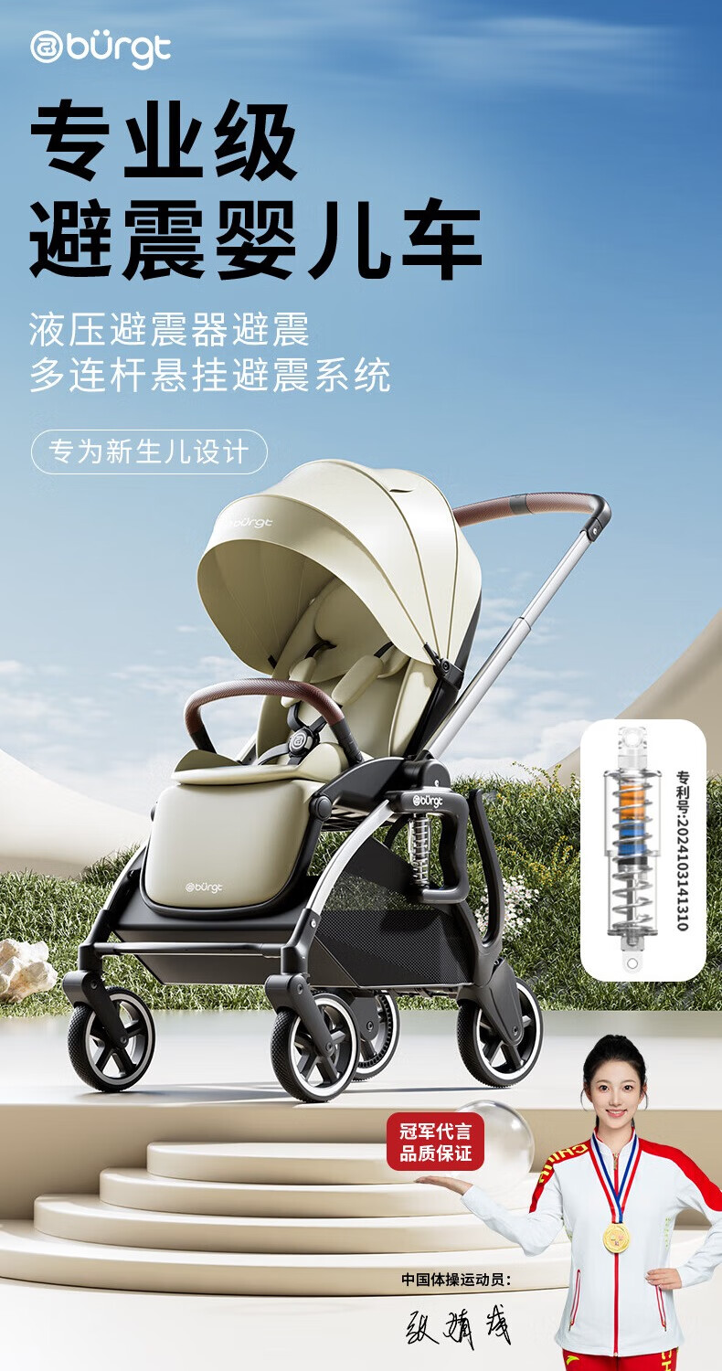布格特婴儿推车液压避震0-3岁可坐可躺可折叠护脊新生宝宝双向手推车 浅茶绿(真避震护脊)