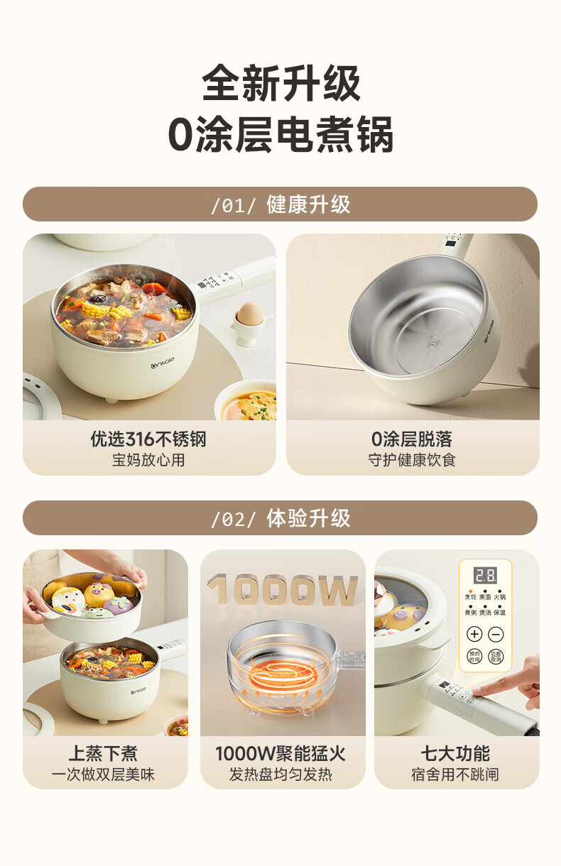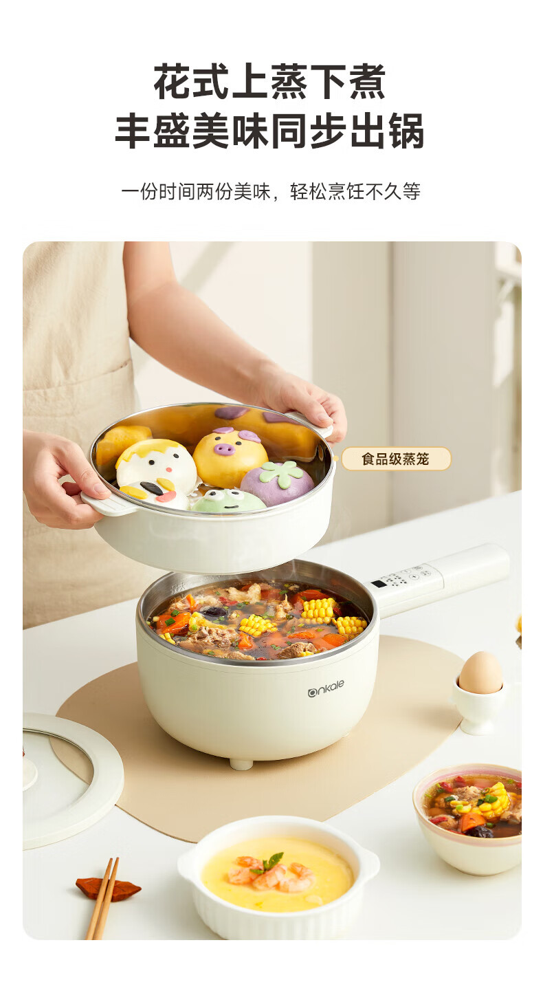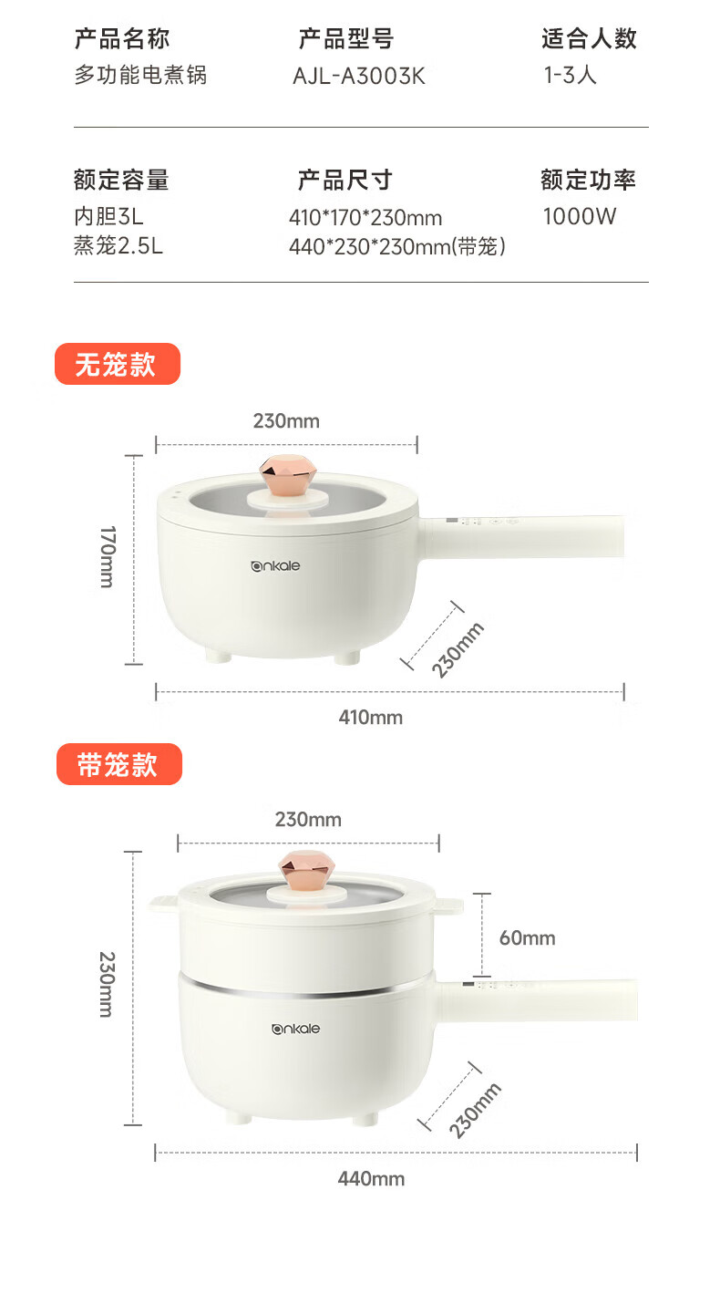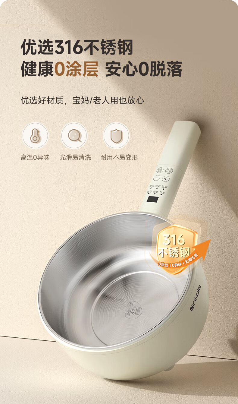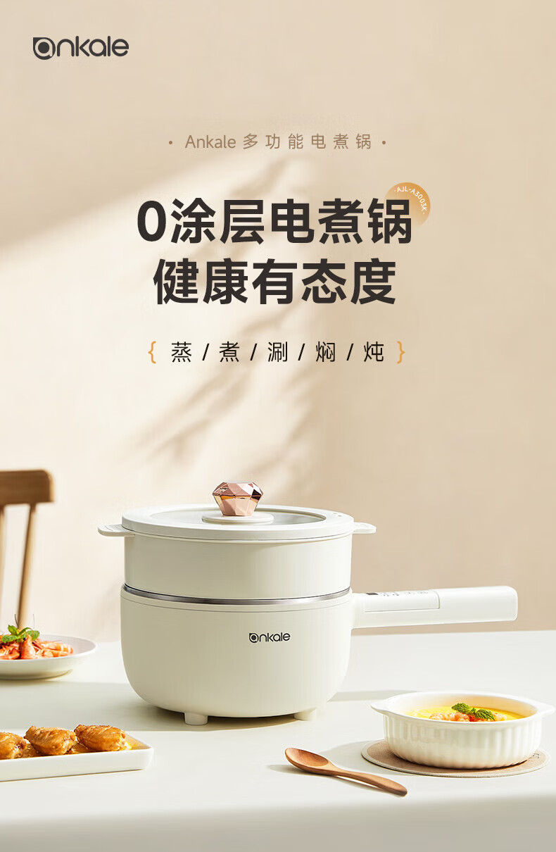 ankale不锈钢长柄电煮锅0氟0涂层 316全钢无缝一体胆+全钢蒸笼 上蒸下煮涮焖炖多功能一锅多用AJL-A3003K 3L 【长柄煮锅】316钢胆+304蒸笼
