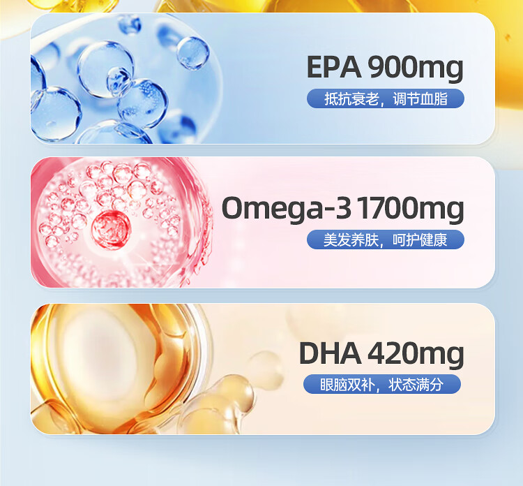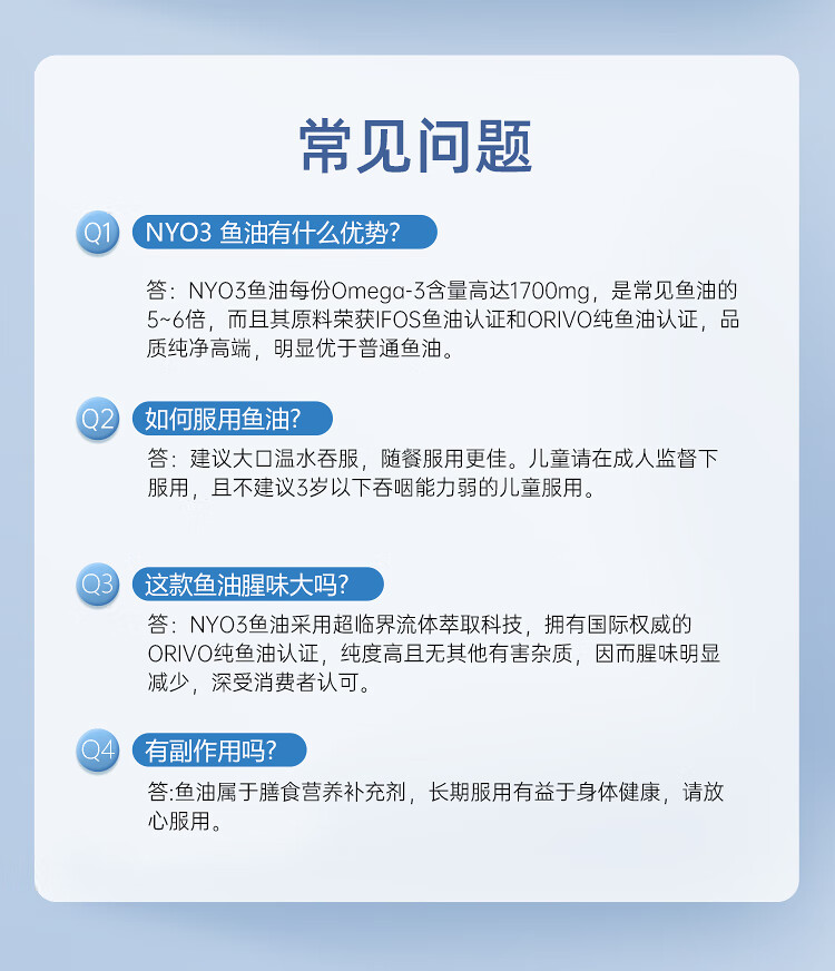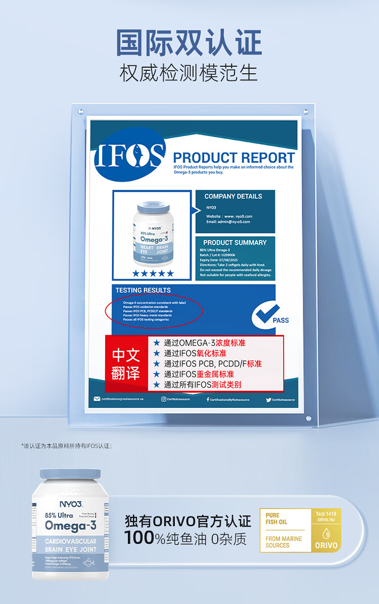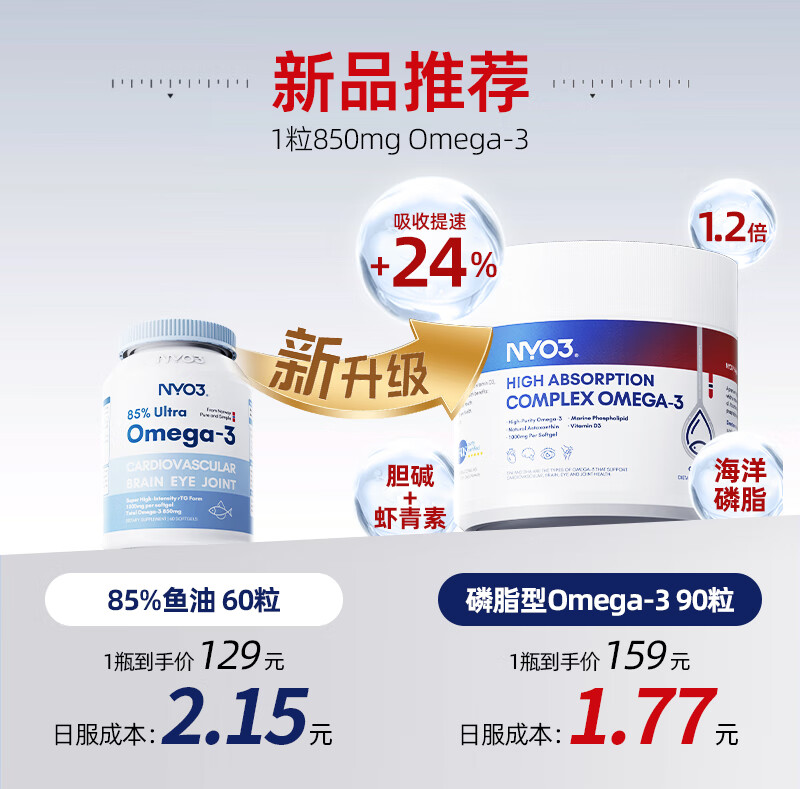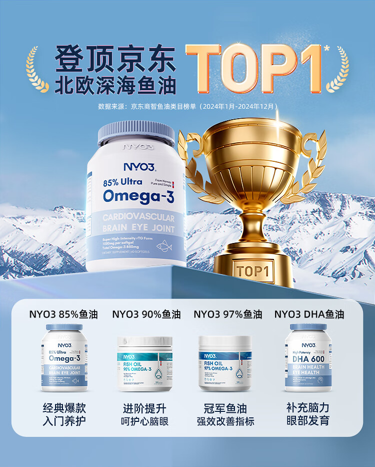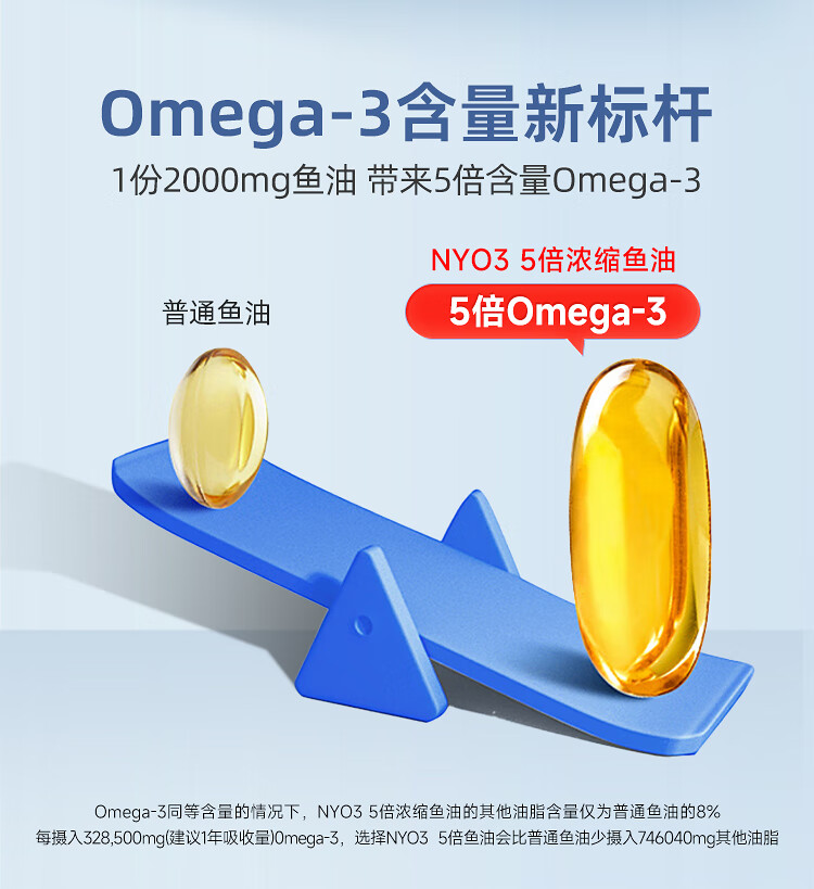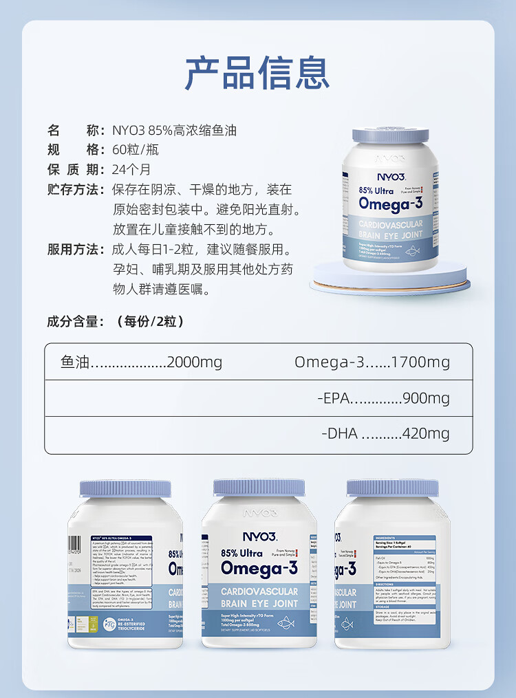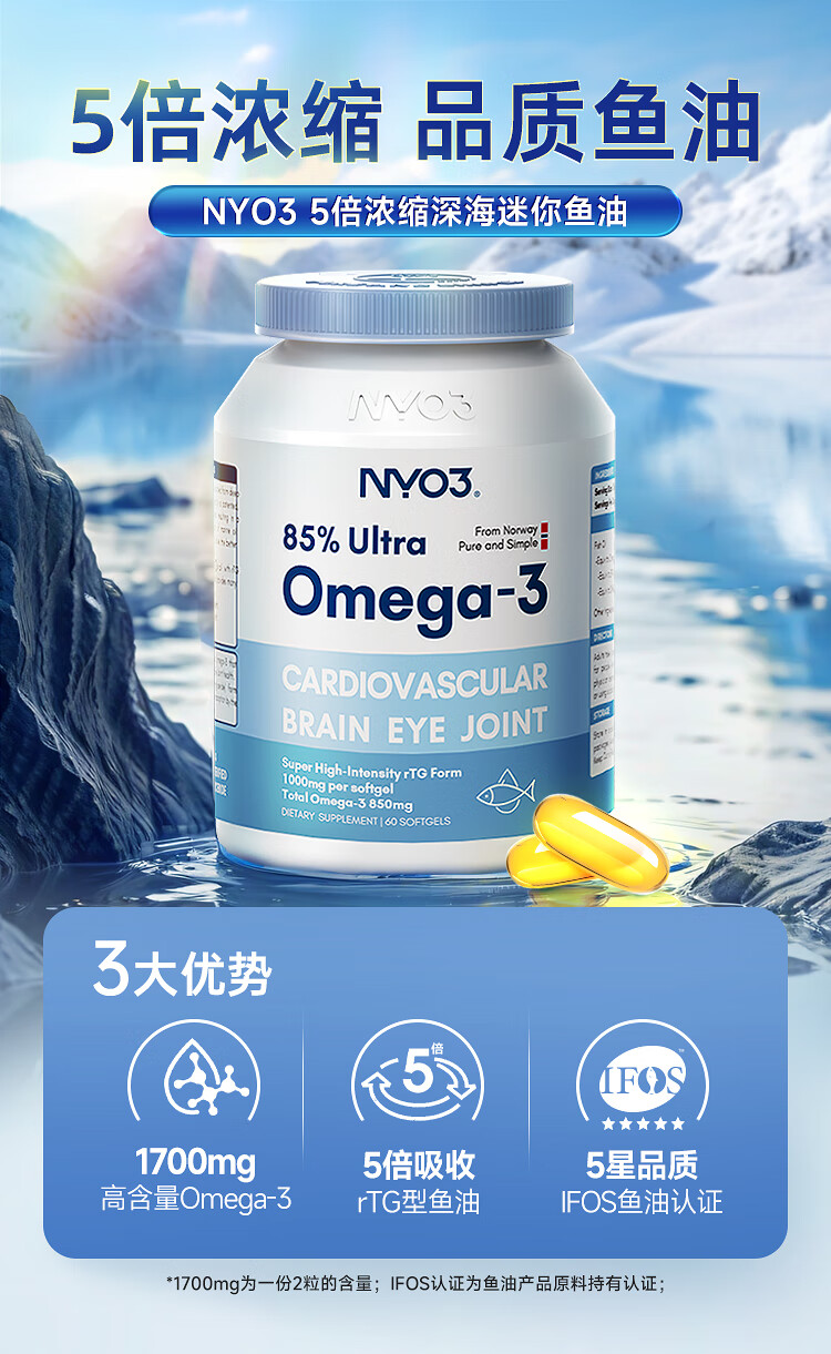 NYO3 85%高纯深海2000mg鱼油胶囊 Omega-3 rTG型60粒/瓶