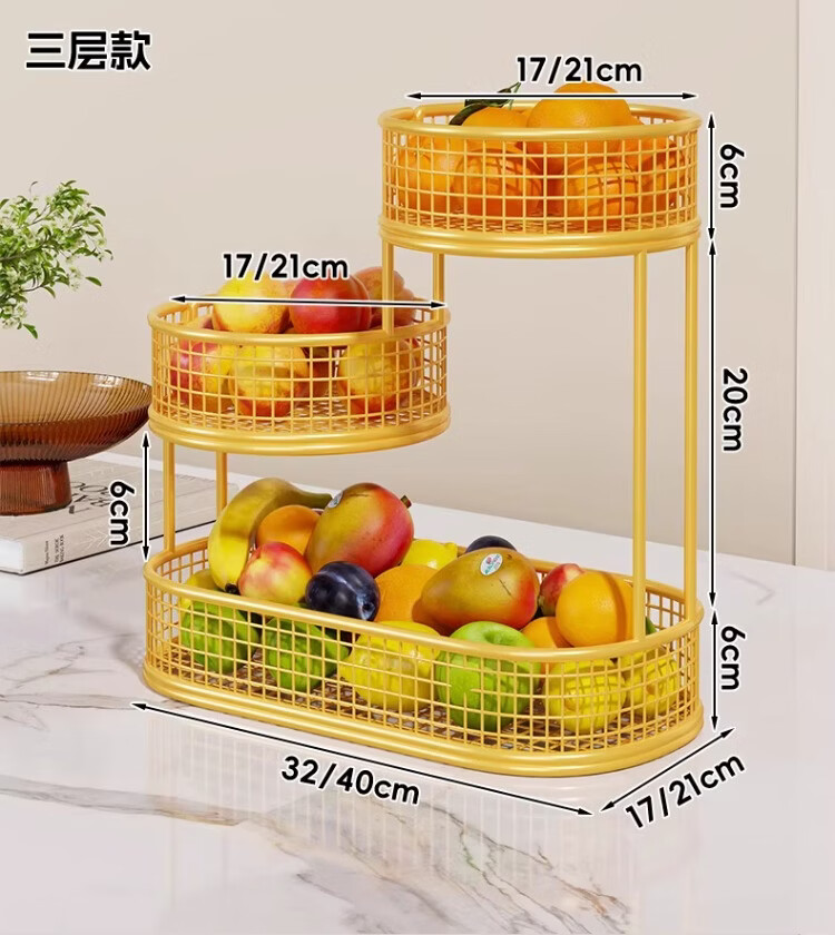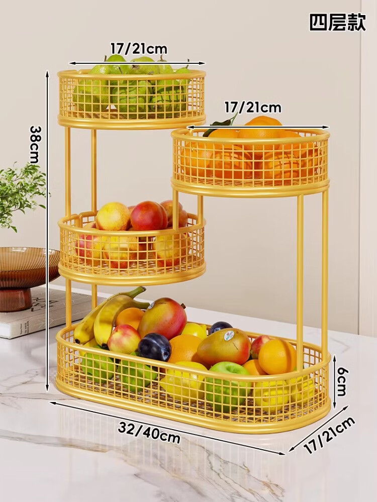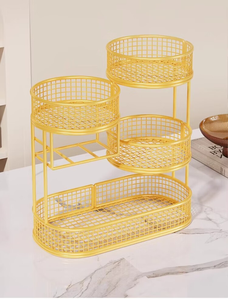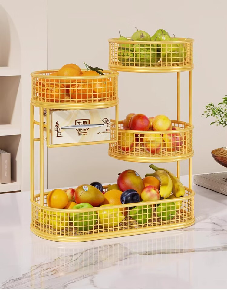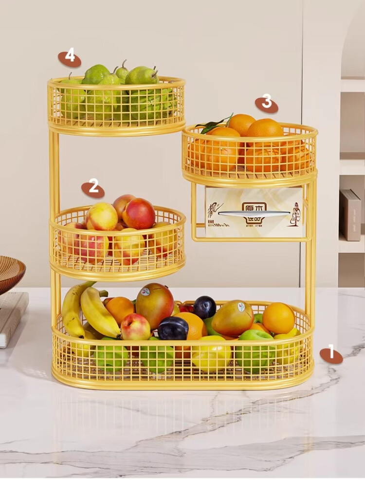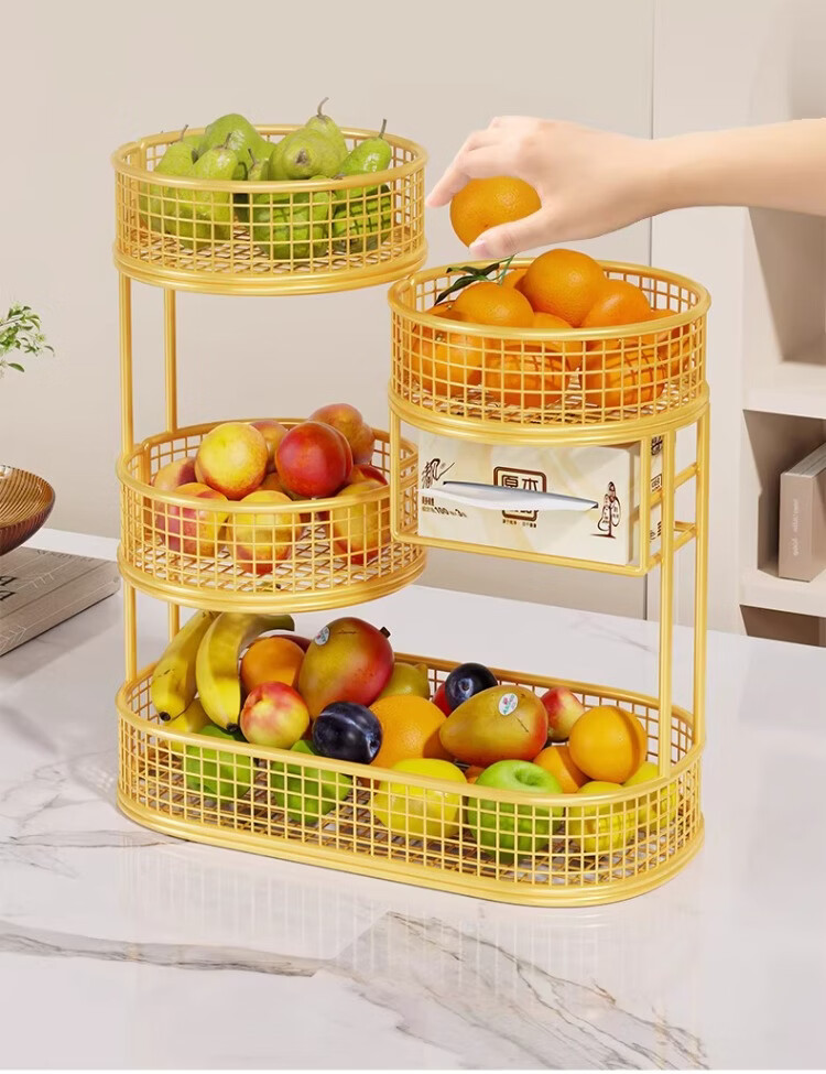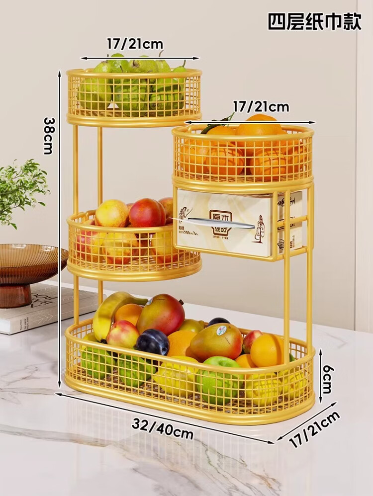 尔思家水果盘客厅家用高颜值桌面零食收纳盒洗水果沥水篮干果盒家用托盘 水果架四层大号 带纸巾盒-金