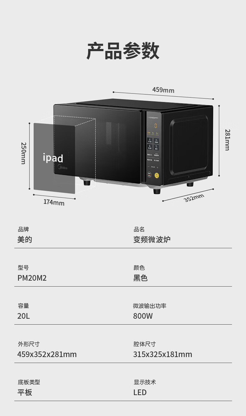 美的(Midea)家用变频微波炉平板式易清洁 800W微波速热 一键智能菜单 钻石背板 微晶面板加热20L(PM20M2)