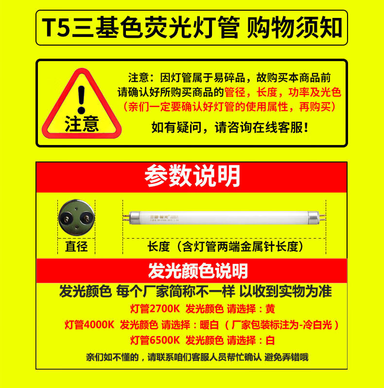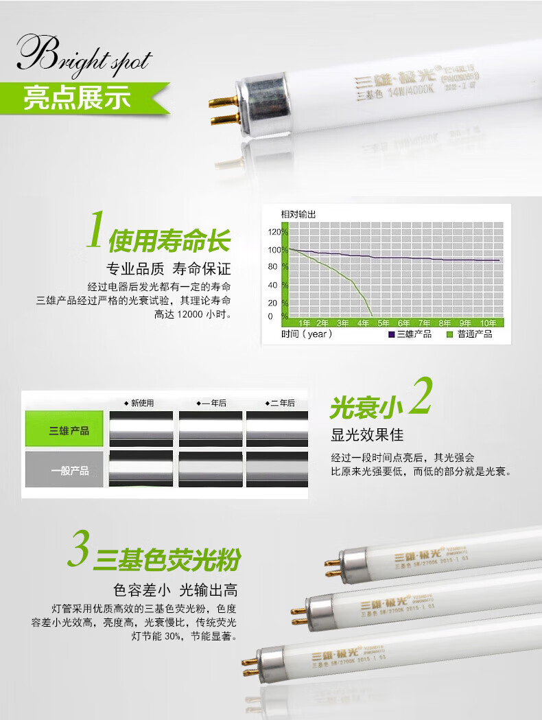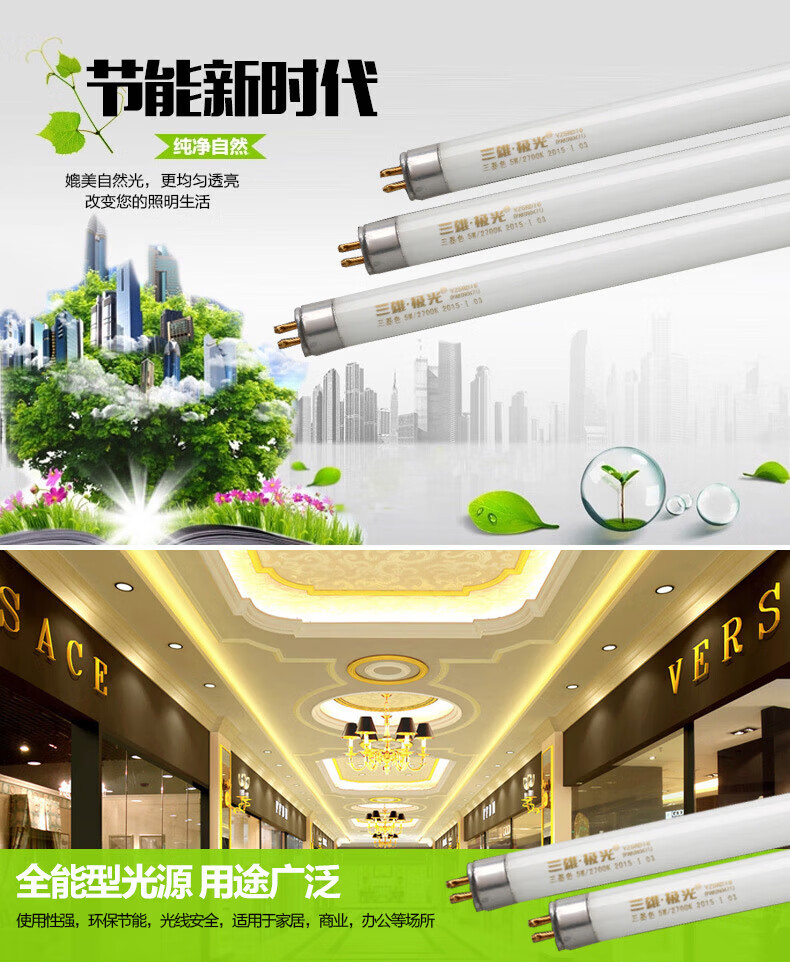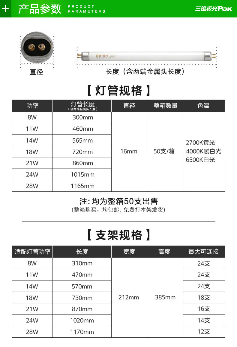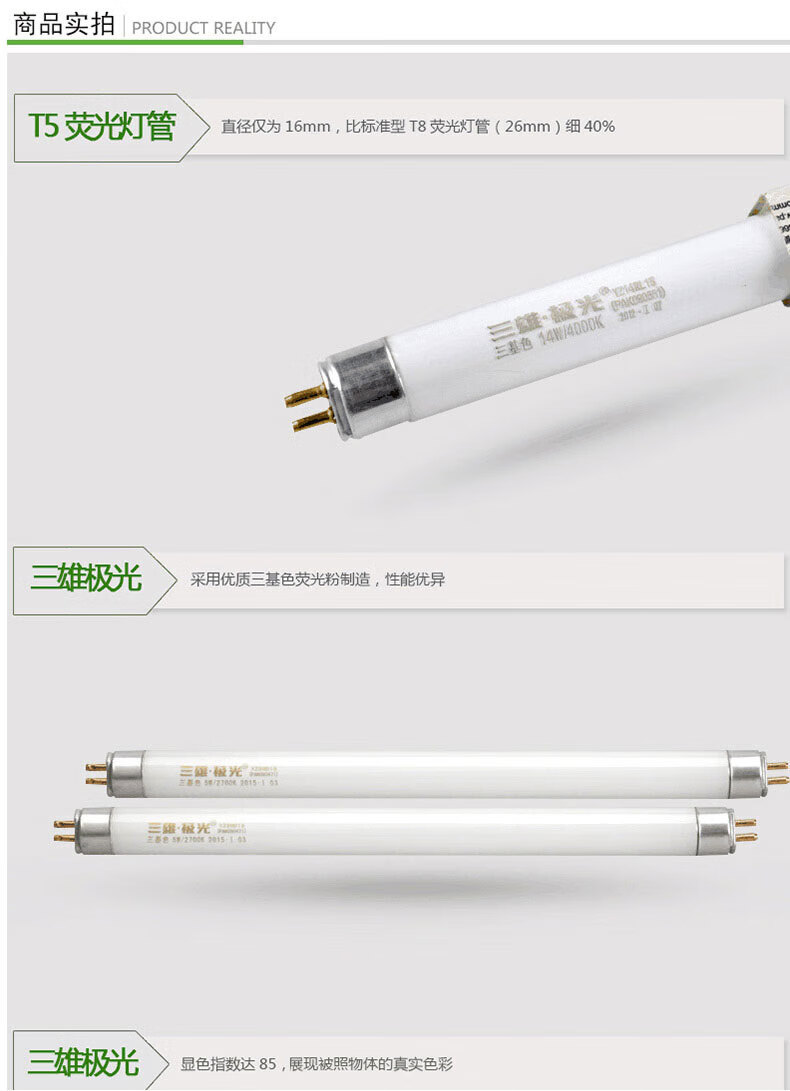三雄极光(PAK)T5日光灯管14W28W三基色格栅灯管 玻璃直管荧光灯管镜前灯 T5荧光灯管 28W 1165mm 黄光 【5支装】
