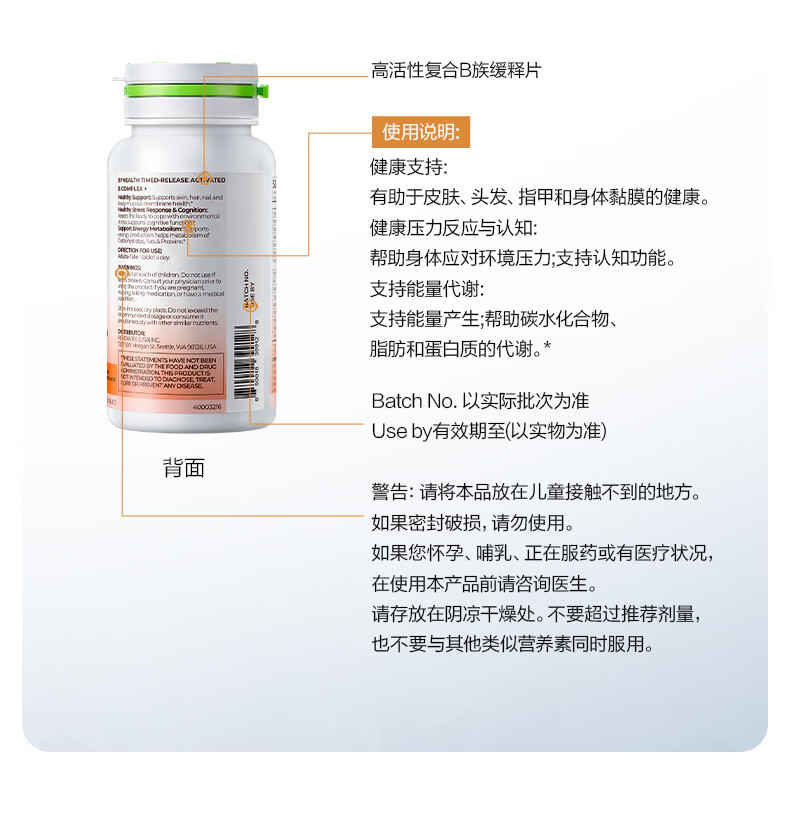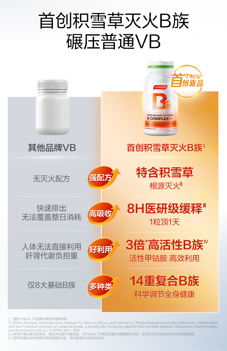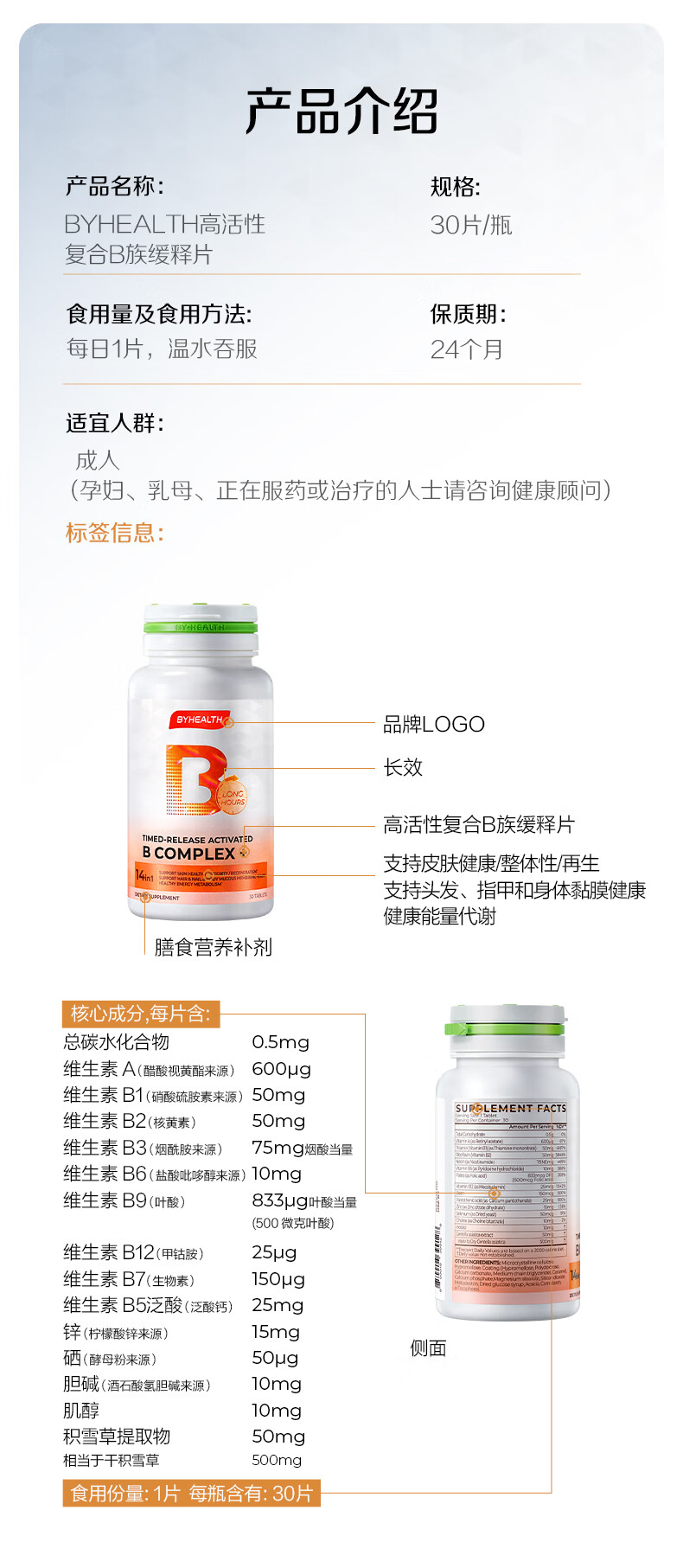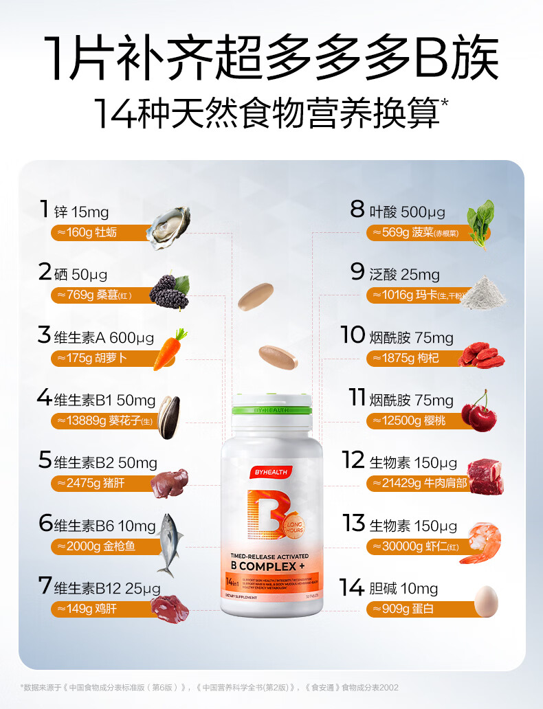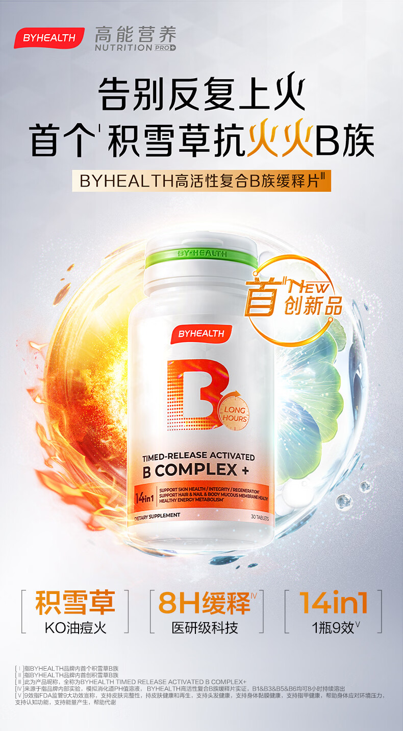 BYHEALTH复合维生素b族积雪草缓释修红vb高活性叶酸烟酰胺男女b2b12生物素 【30天改善 内调抗火】B族 30片*1瓶