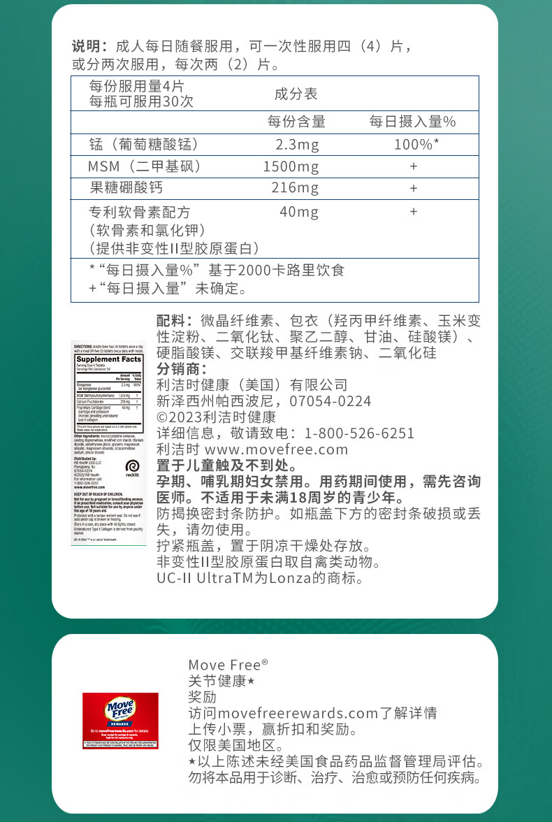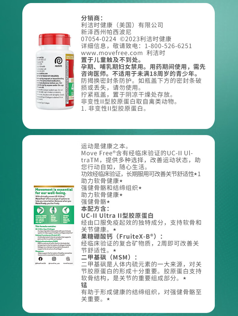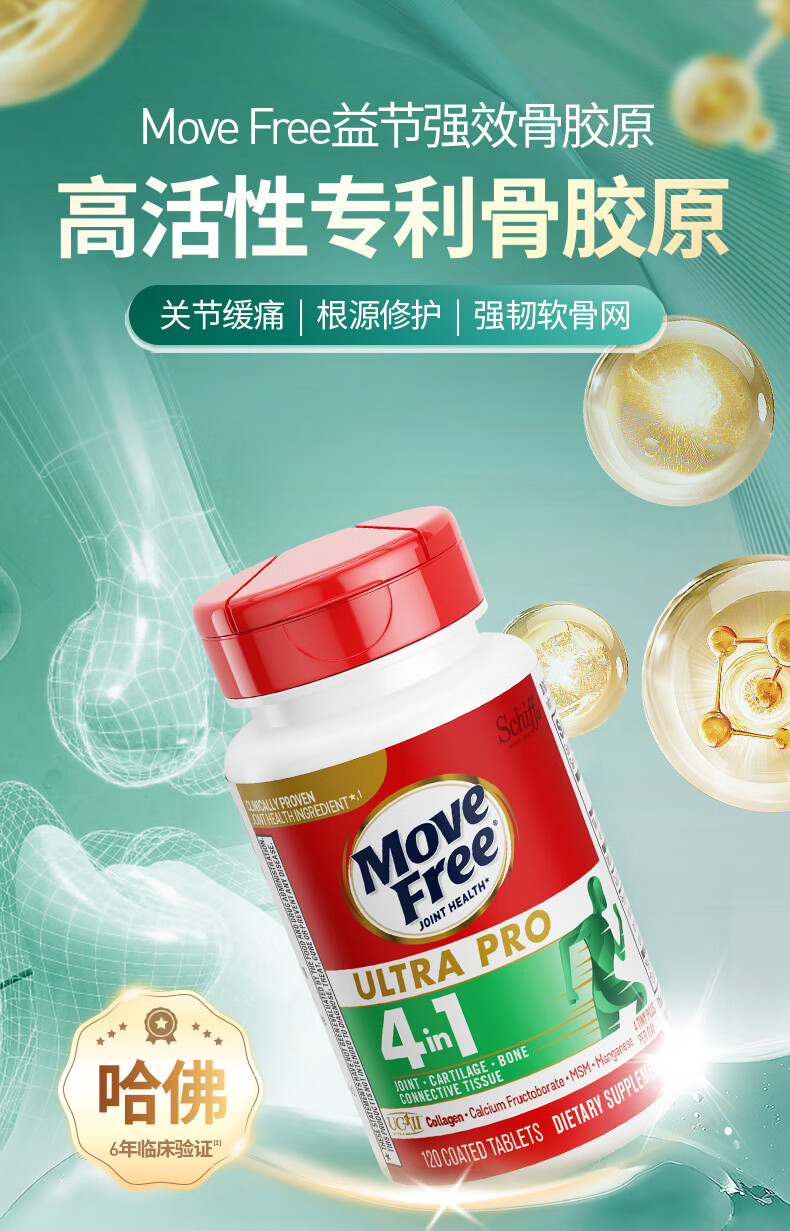 益节Move Free 升级版骨胶原蛋白UC2 维骨力MSM锰 成人中老年护关节 【升级版】舒缓修护骨胶原 120粒*1瓶