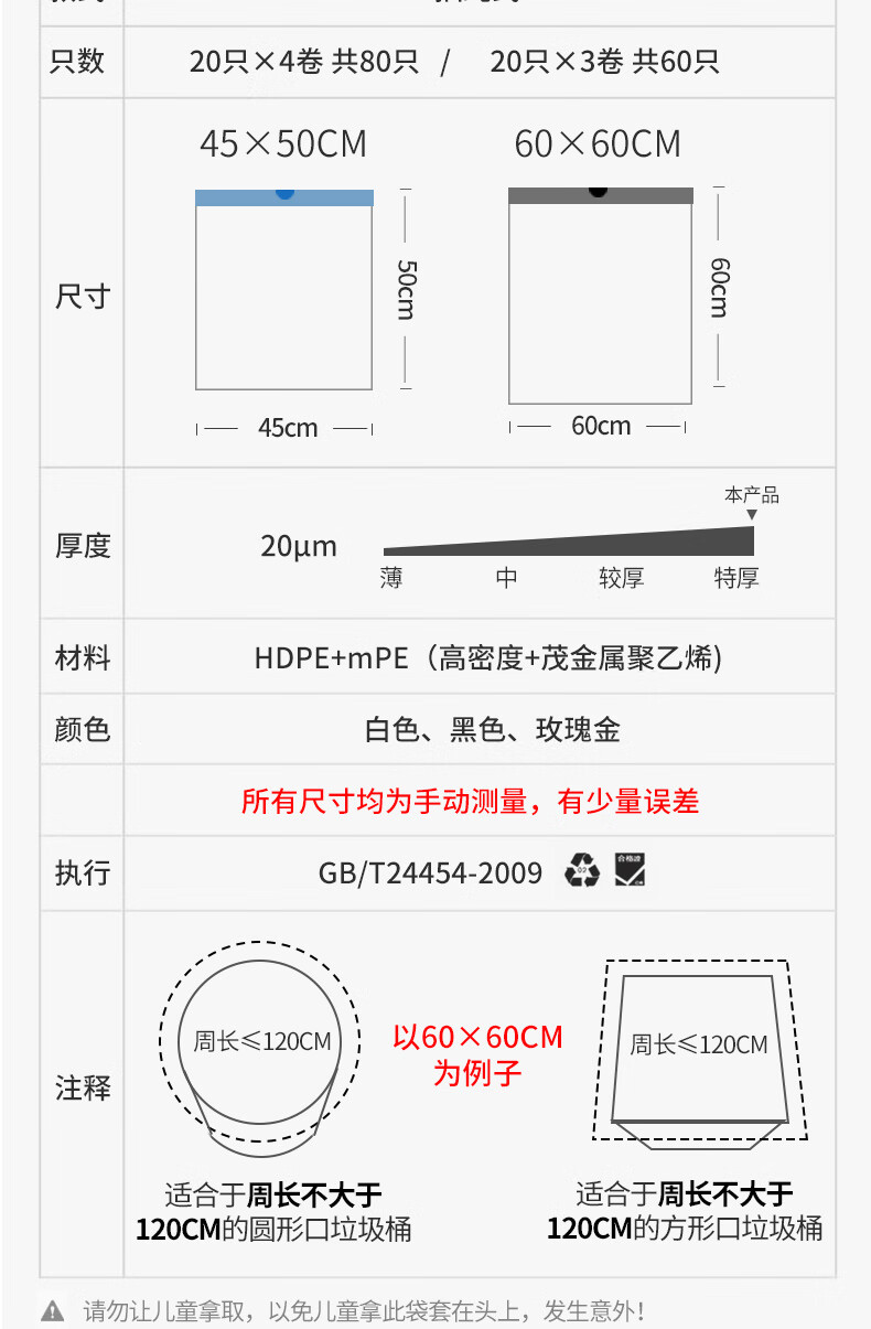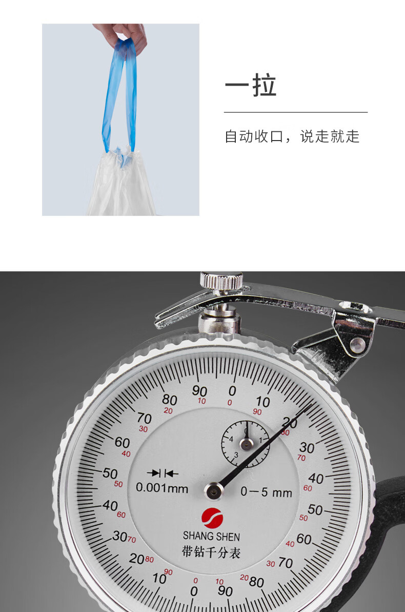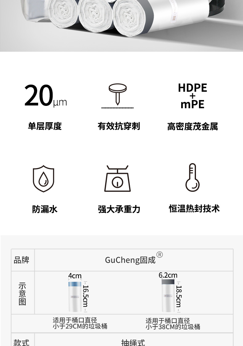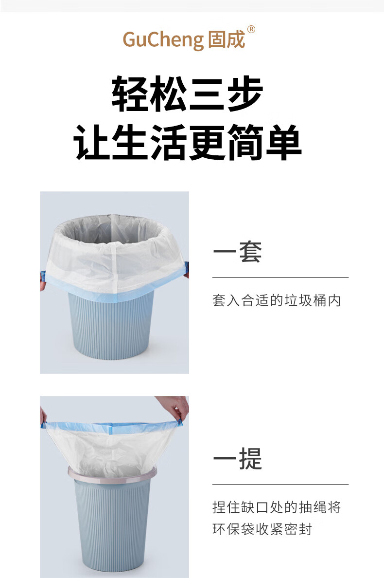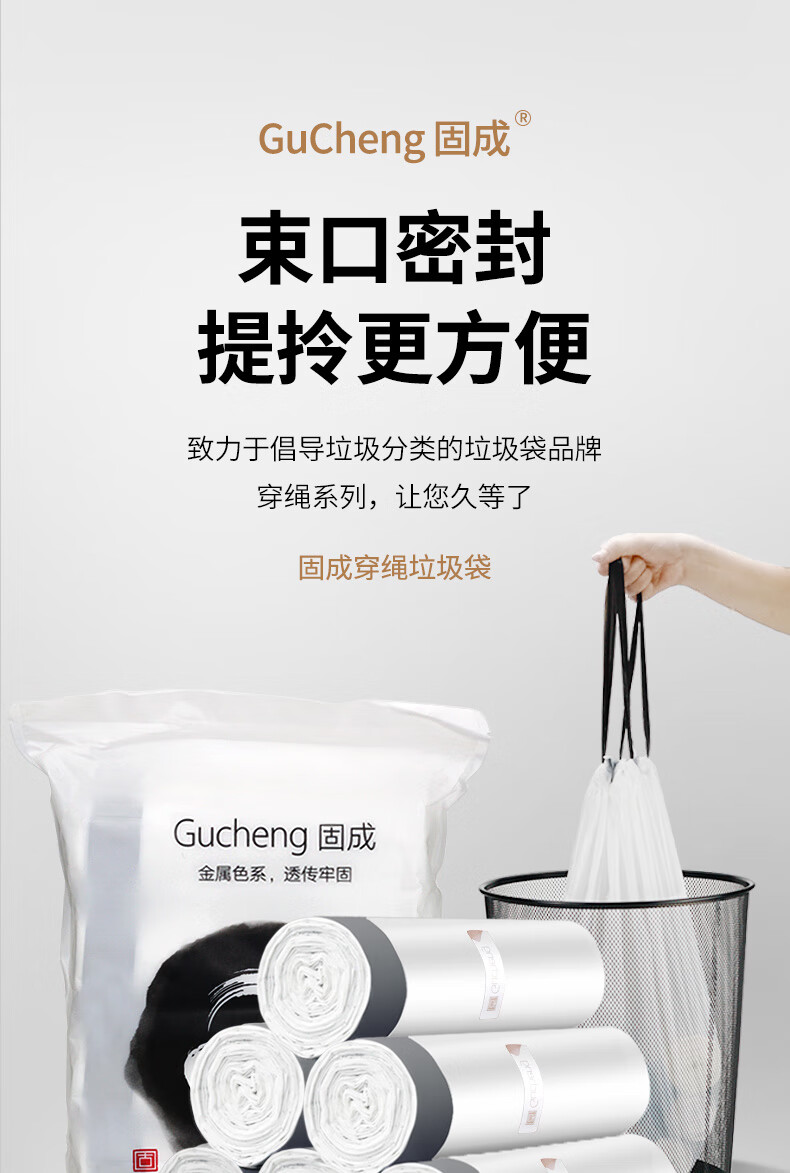 固成(GUCHENG)抽绳垃圾袋双面3.6丝 加厚超厚家用手提式厨房水桶一次性塑料袋 【60*60cm】超大号3卷共60只-雅典白