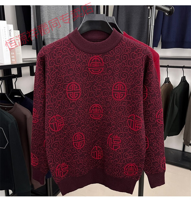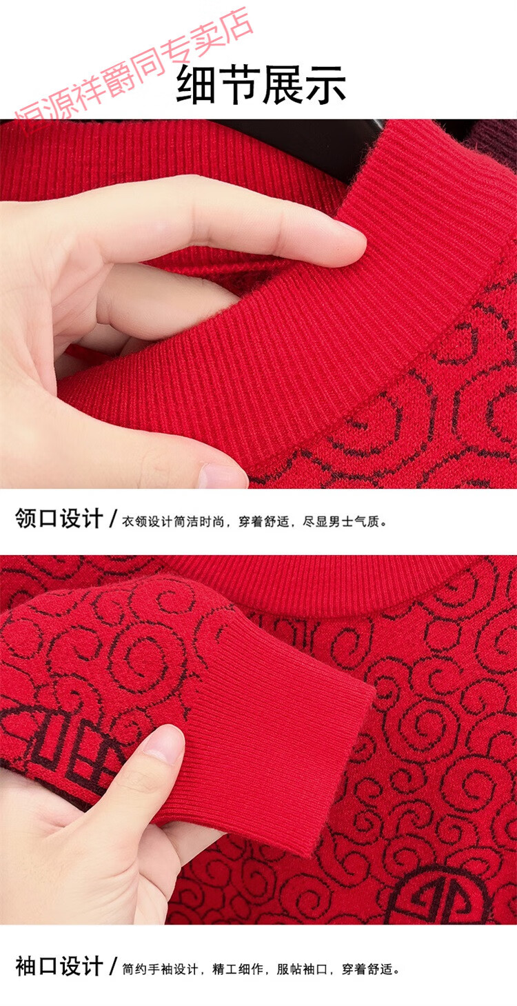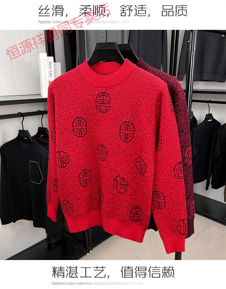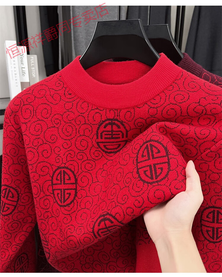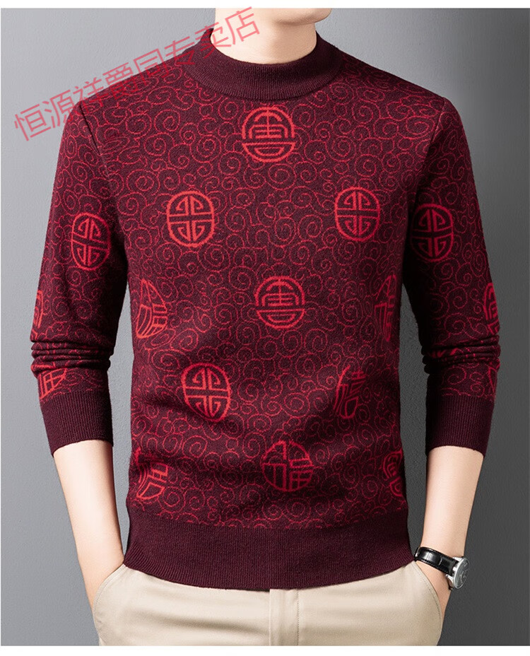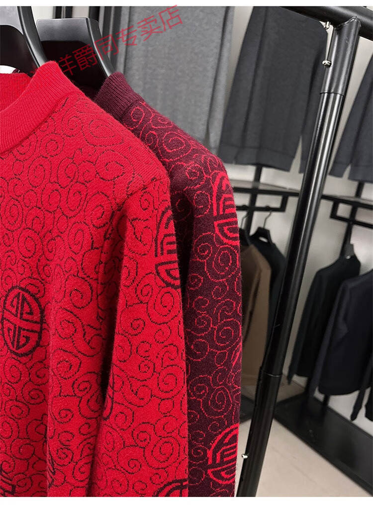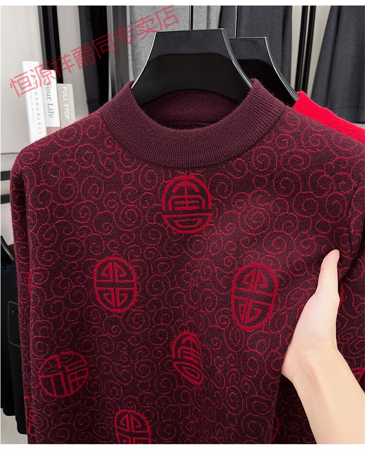 恒源祥2025新款羊毛衫男士红色毛衣加绒加厚保暖针织衫春秋羊毛衫上衣 紫红96863 2XL 180