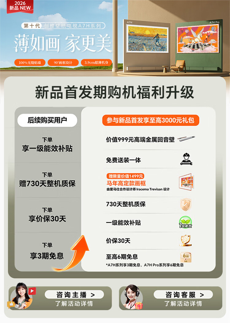 创维壁纸电视A7H 65英寸 2026款客厅美学电视机 3.9cm 超薄贴墙 打造家庭治愈系艺术画廊 格调之选