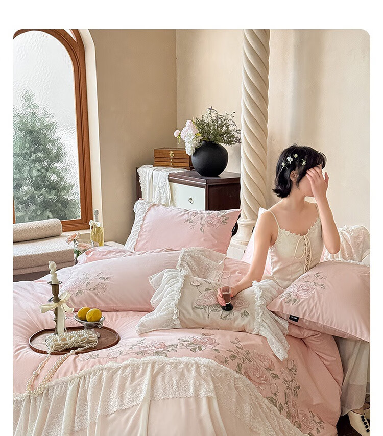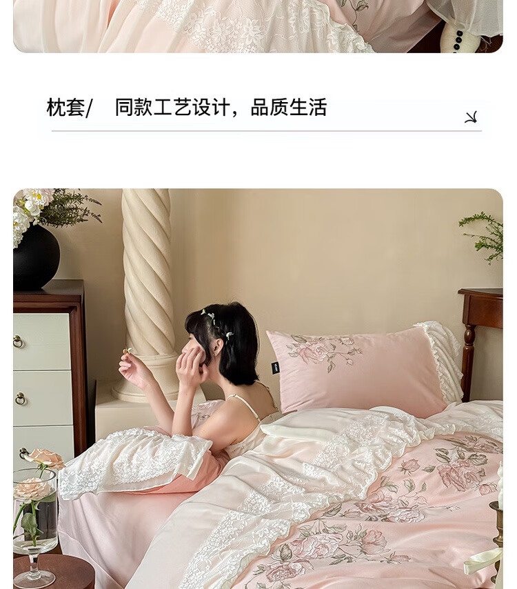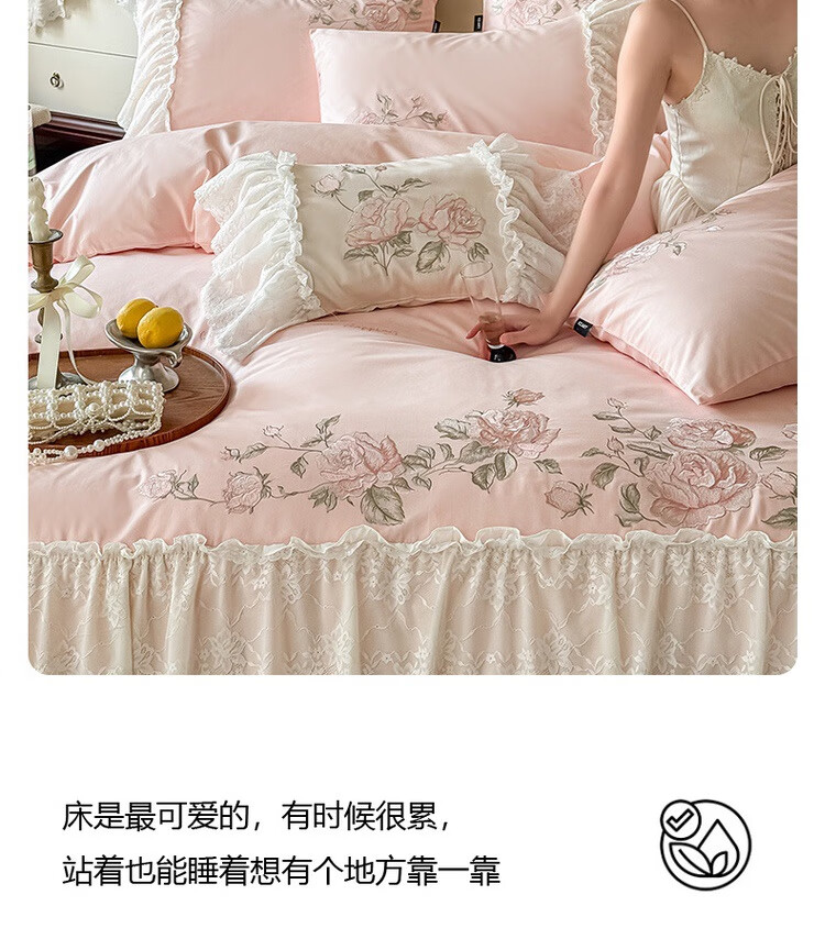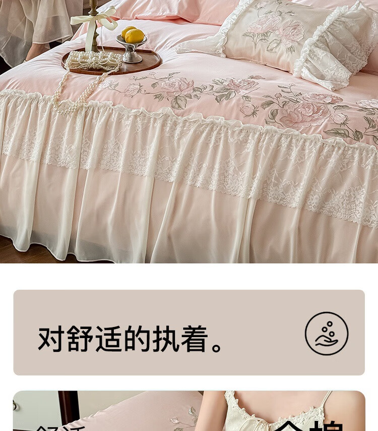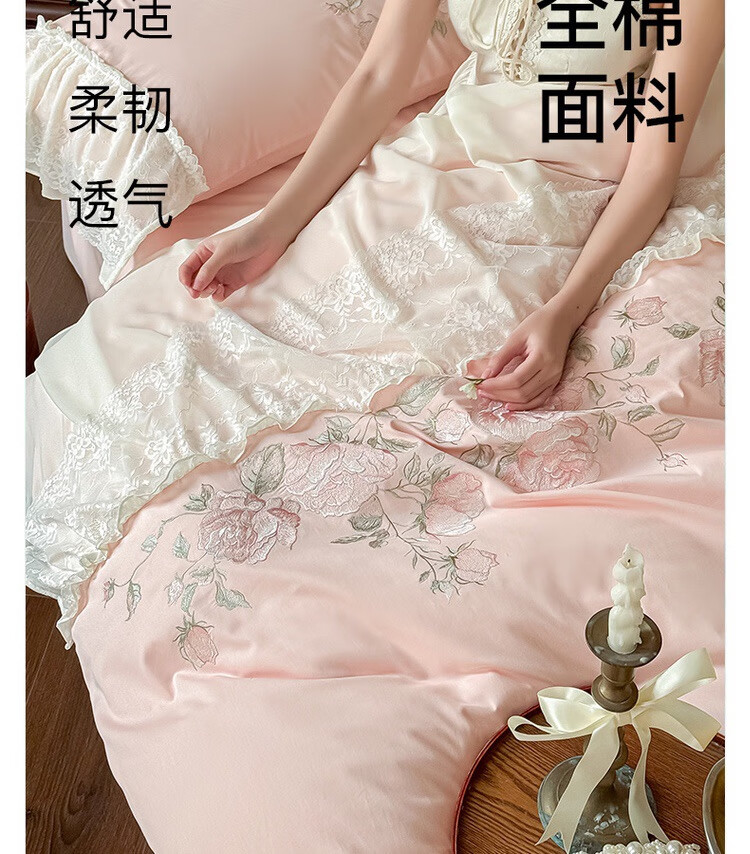水星系列家纺高级蕾丝少女120S长绒棉轻奢全棉四件套纯棉花边被套床单床上用品 茉柔-紫 120支 全棉刺绣 1.8米床 床笠款 (被套200*230cm)