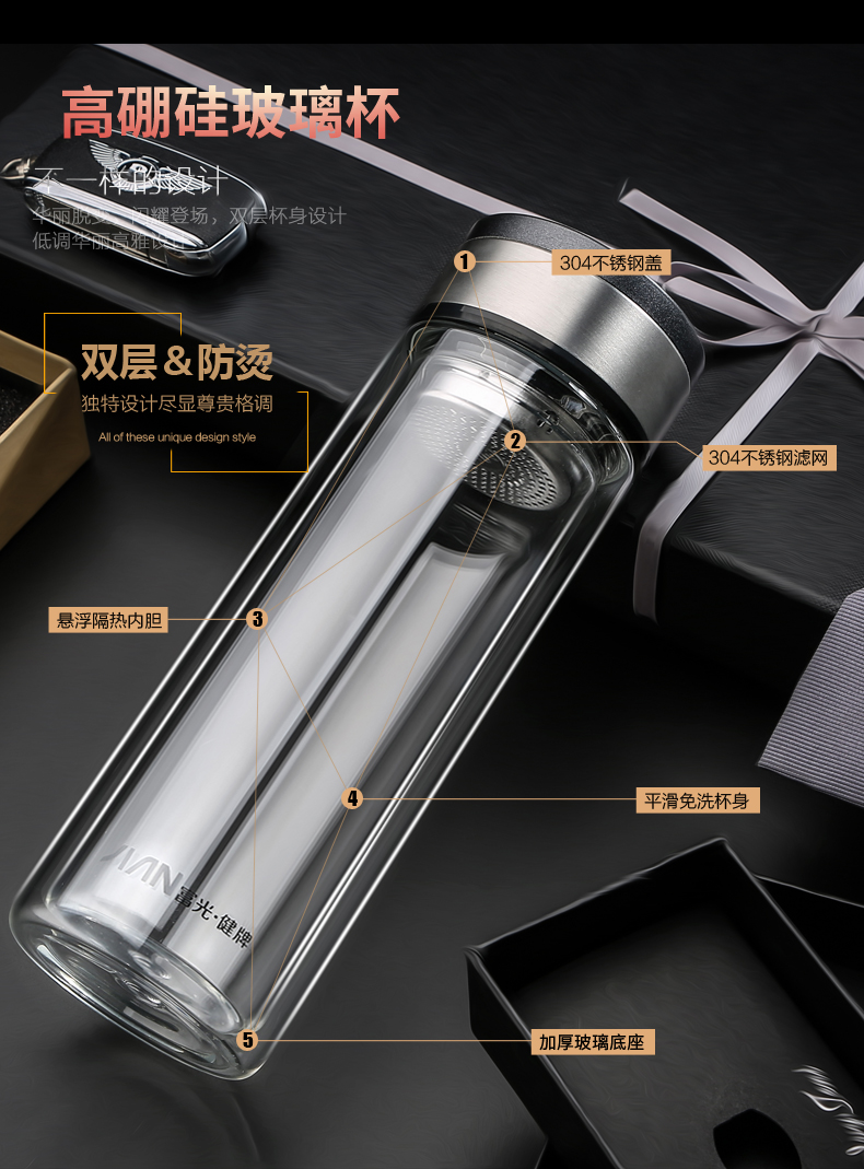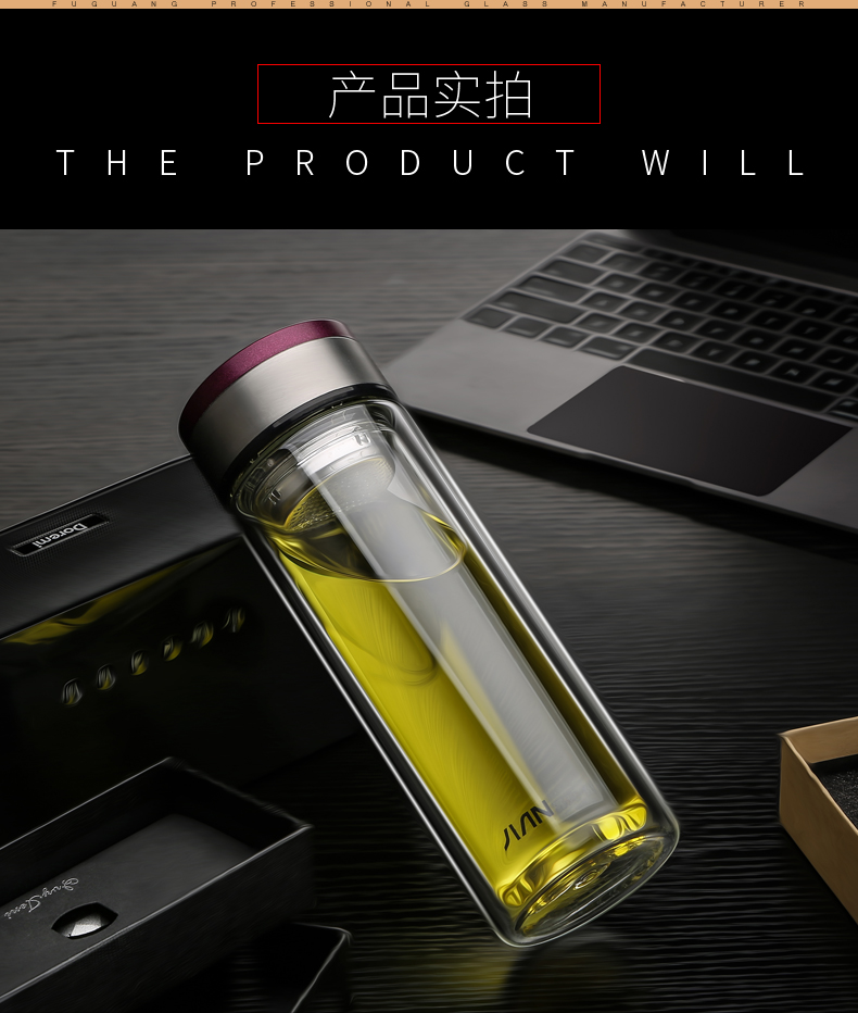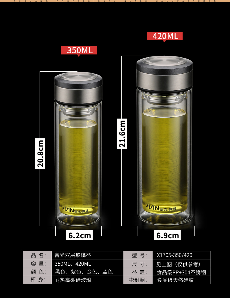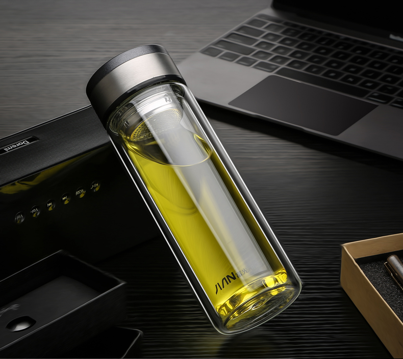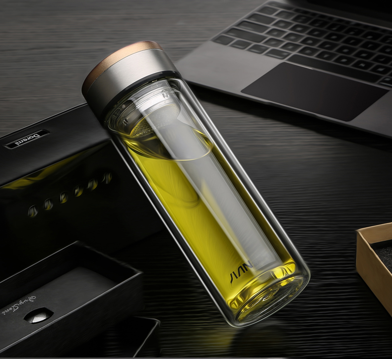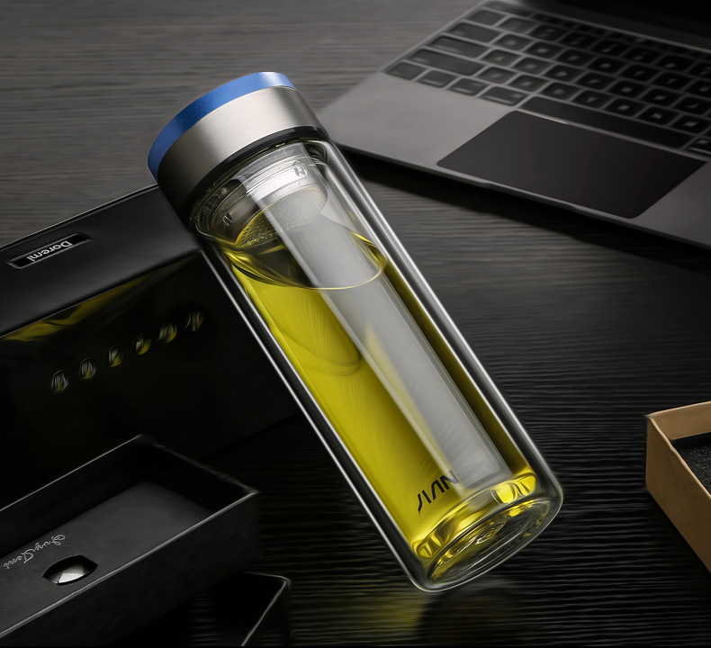 富光 玻璃杯 双层玻璃泡茶杯子 带过滤网水杯 男女士车载办公便携水杯 400ml蓝色【不锈钢回流盖】