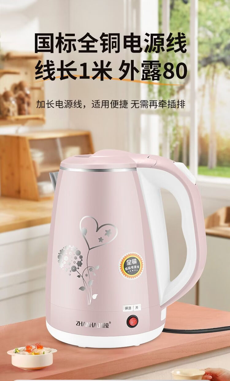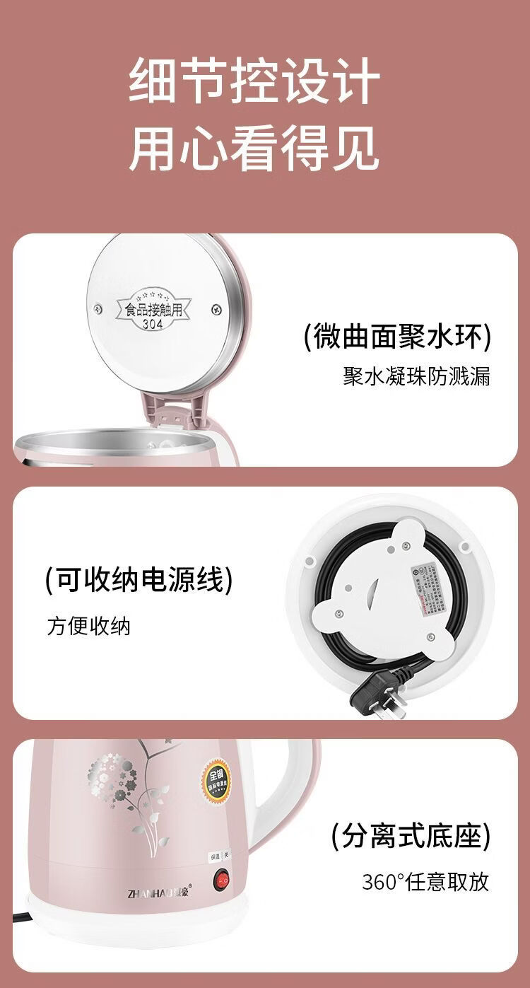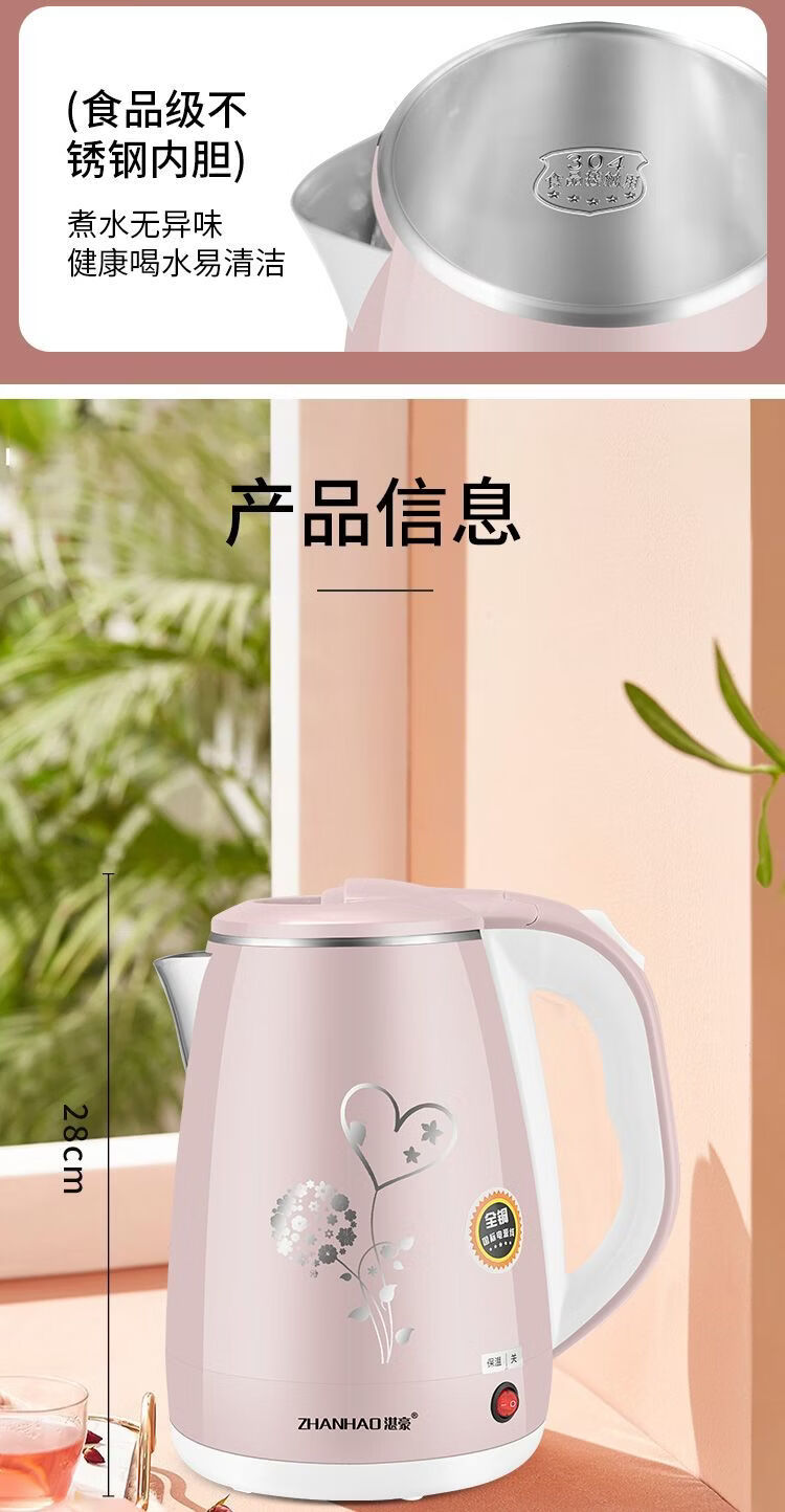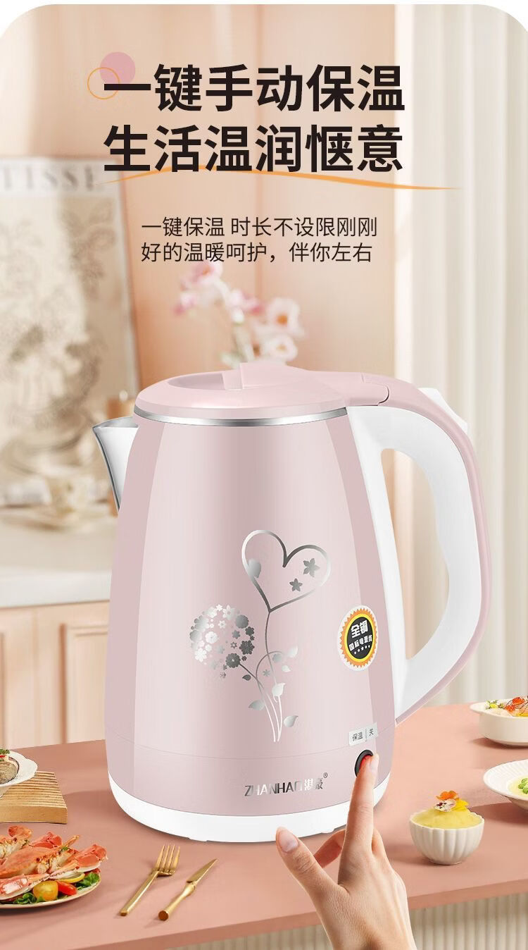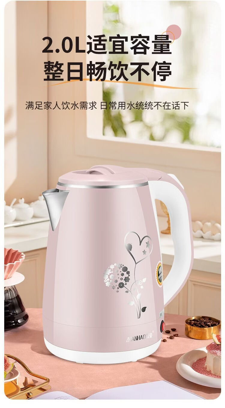 湛豪电热水壶家用保温烧水壶304不锈钢防烫大容量自动断电开水壶 2L 印花-粉色-304不锈钢-2.0L-不保温