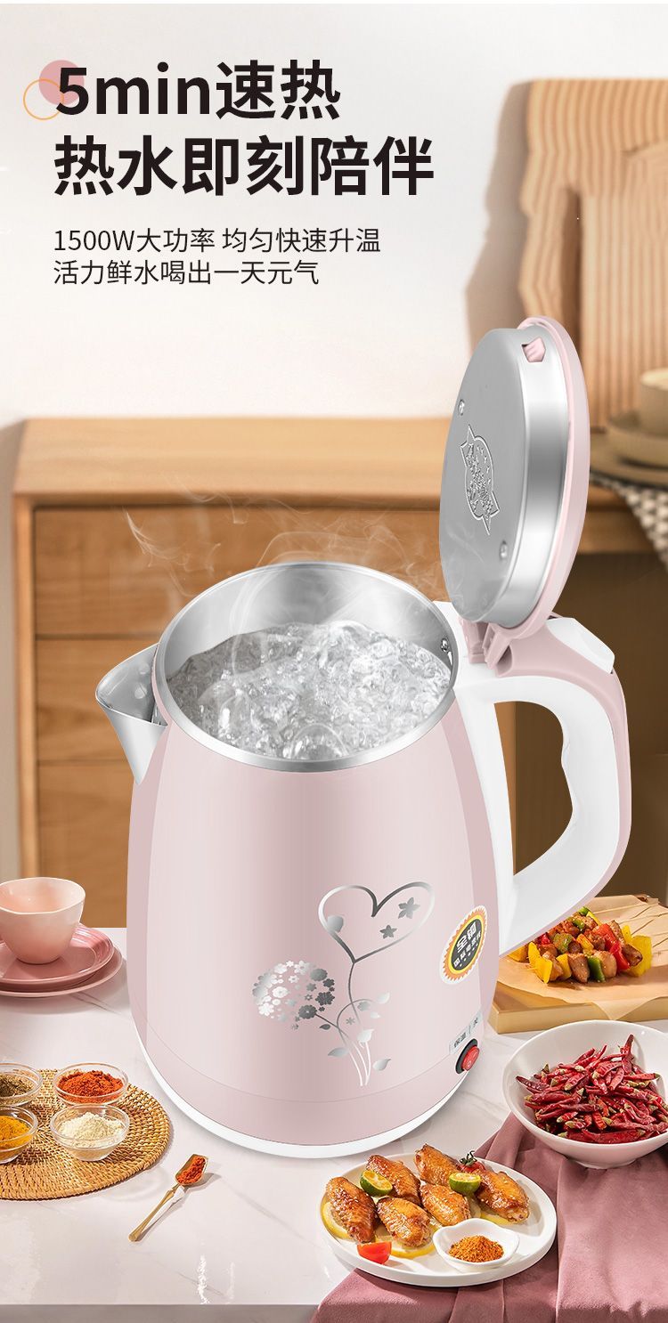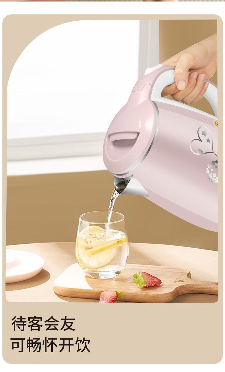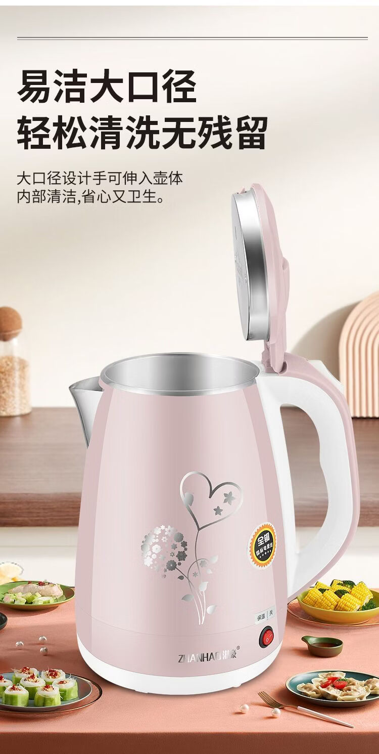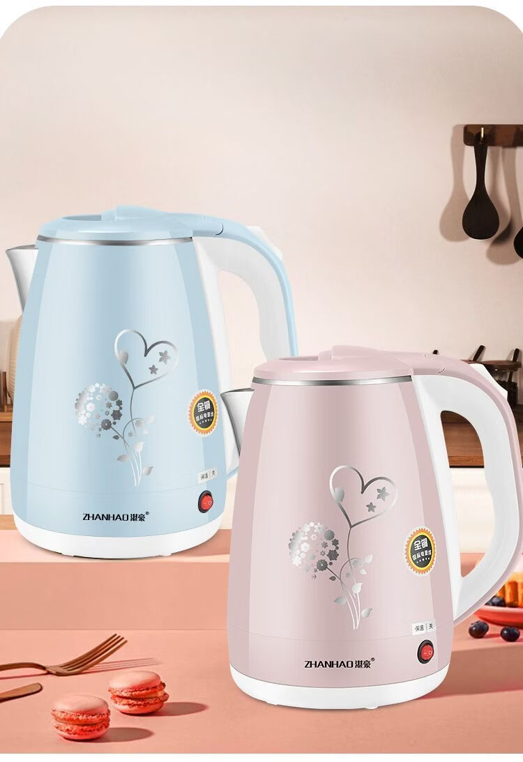湛豪电热水壶家用保温烧水壶304不锈钢防烫大容量自动断电开水壶 2L 印花-粉色-304不锈钢-2.0L-不保温