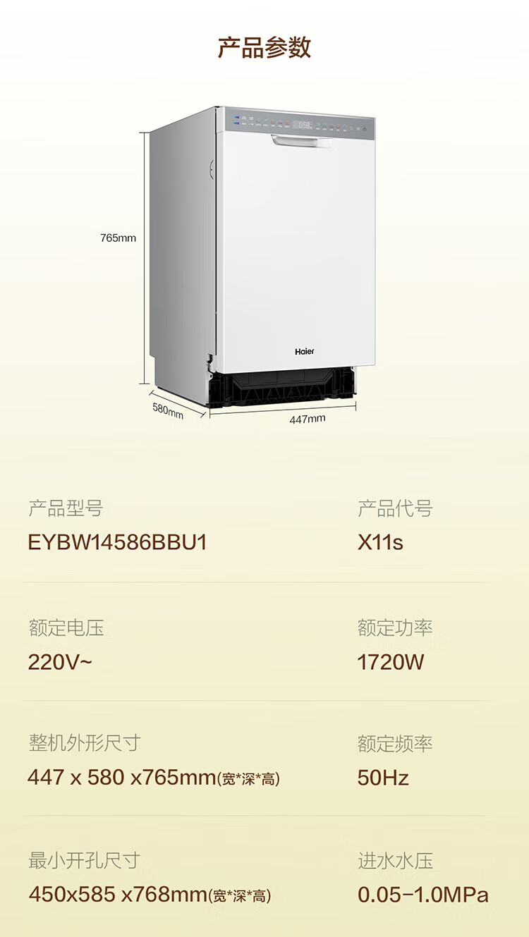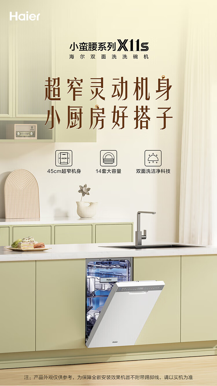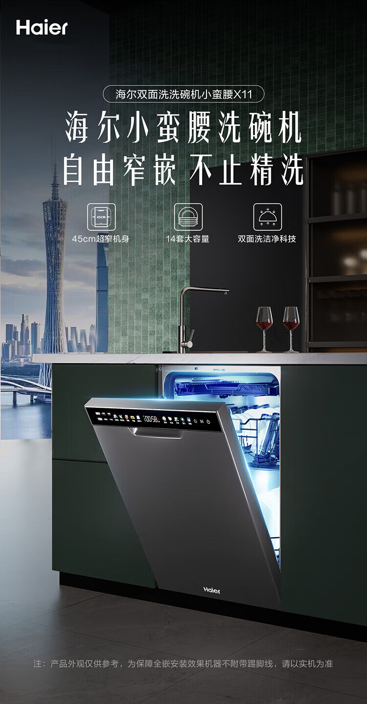 海尔嵌入式14套变频洗碗机双面洗x11/x11小蛮腰极窄面板一级水效智能开门速干五星级消杀速洗消存一体 【X11S常规仓】