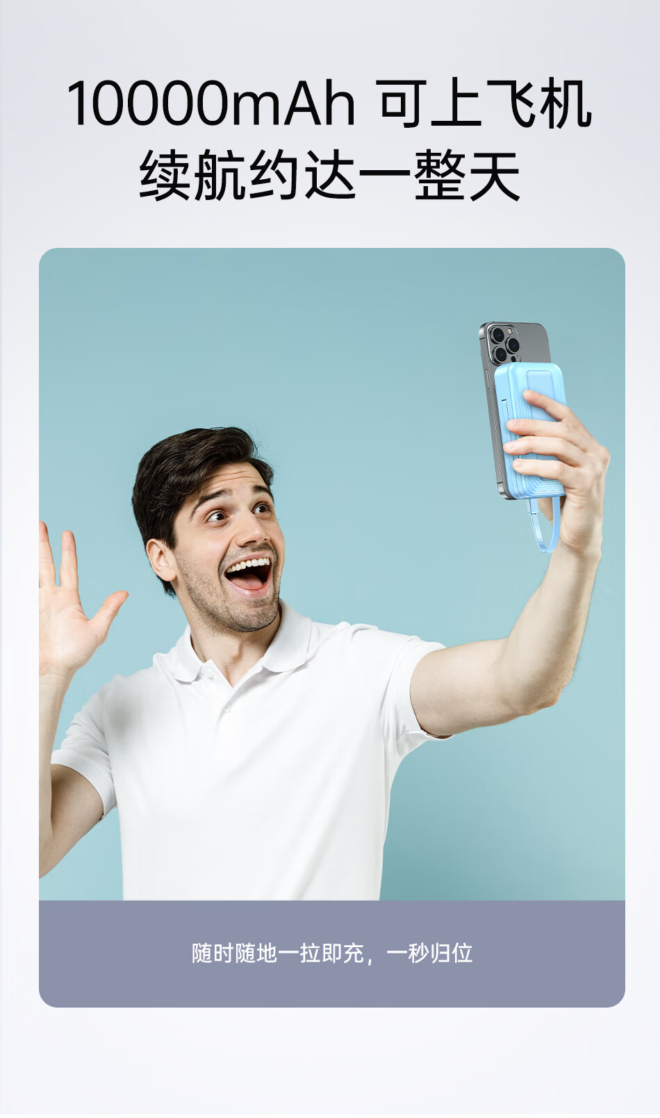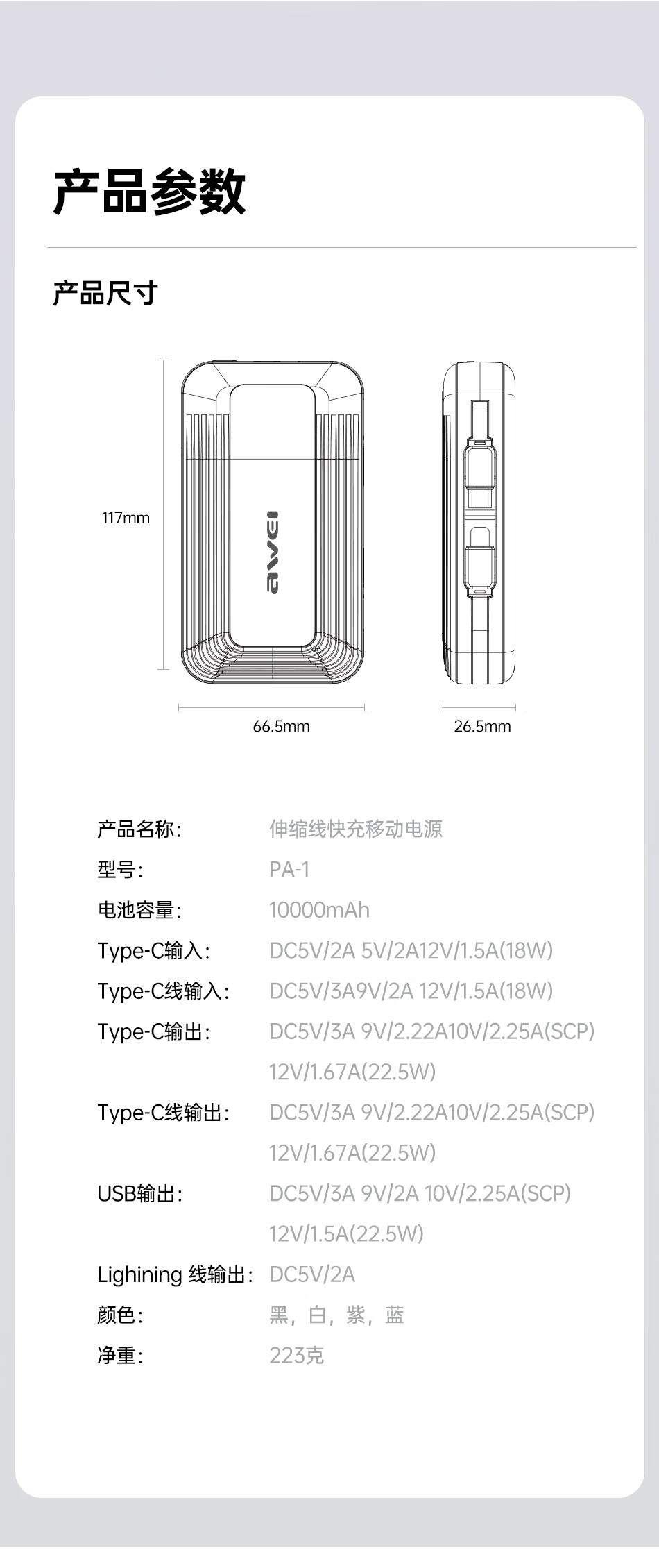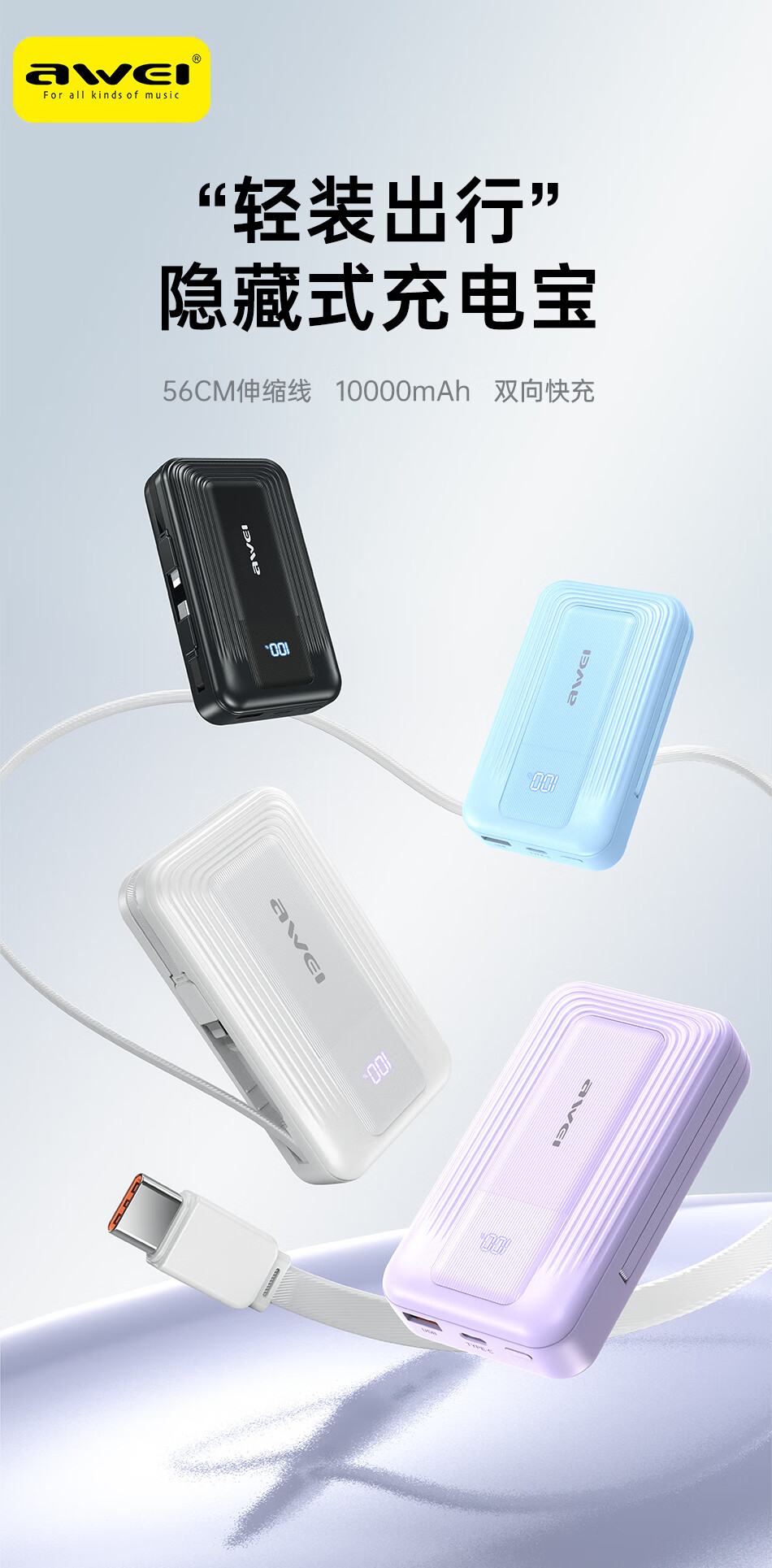用维(AWEI)【充电宝3C认证可上飞机】用维伸缩线容量10000毫安标识自带双线20w快充移动电源小巧便携适用苹果 紫色丨55cm伸缩线丨自带双线 10000mAh