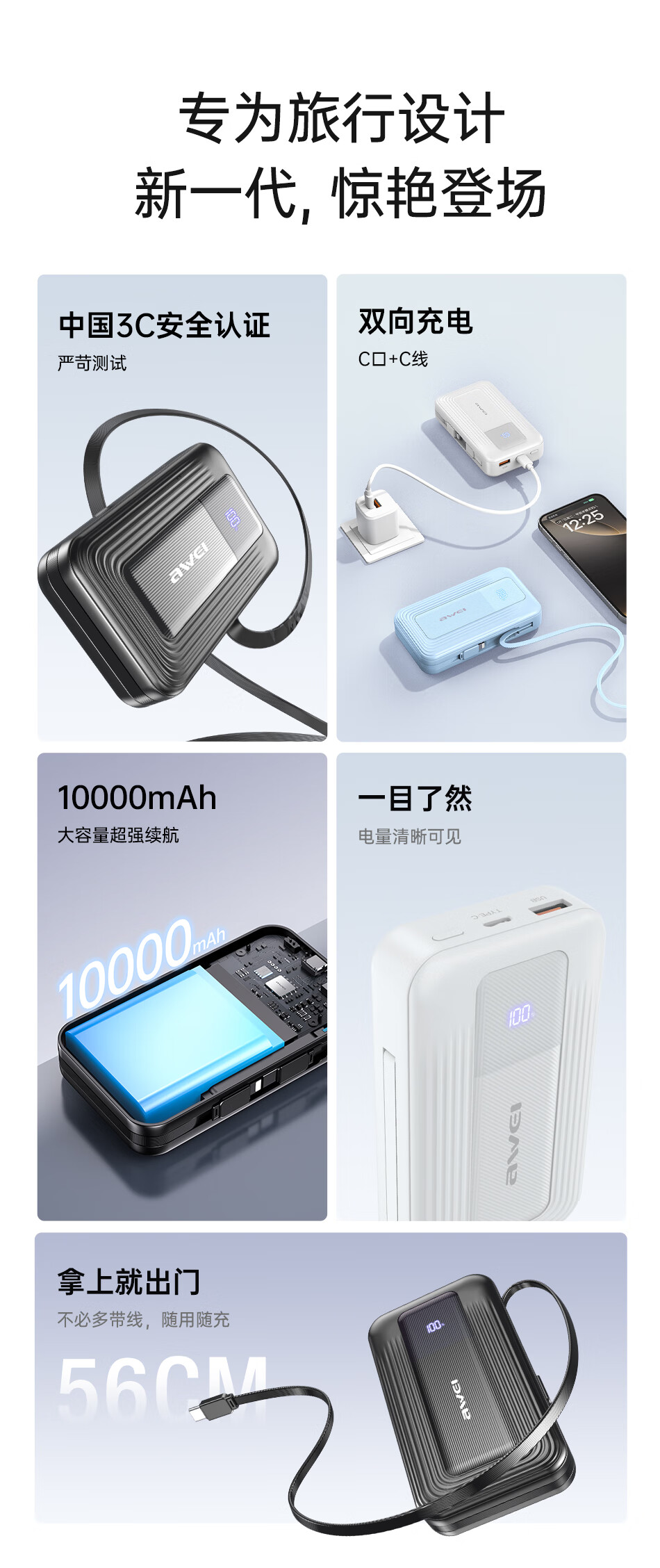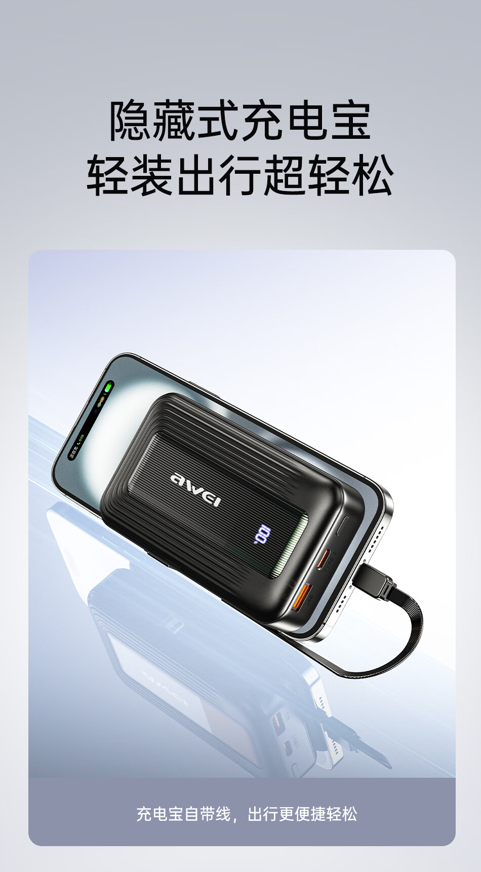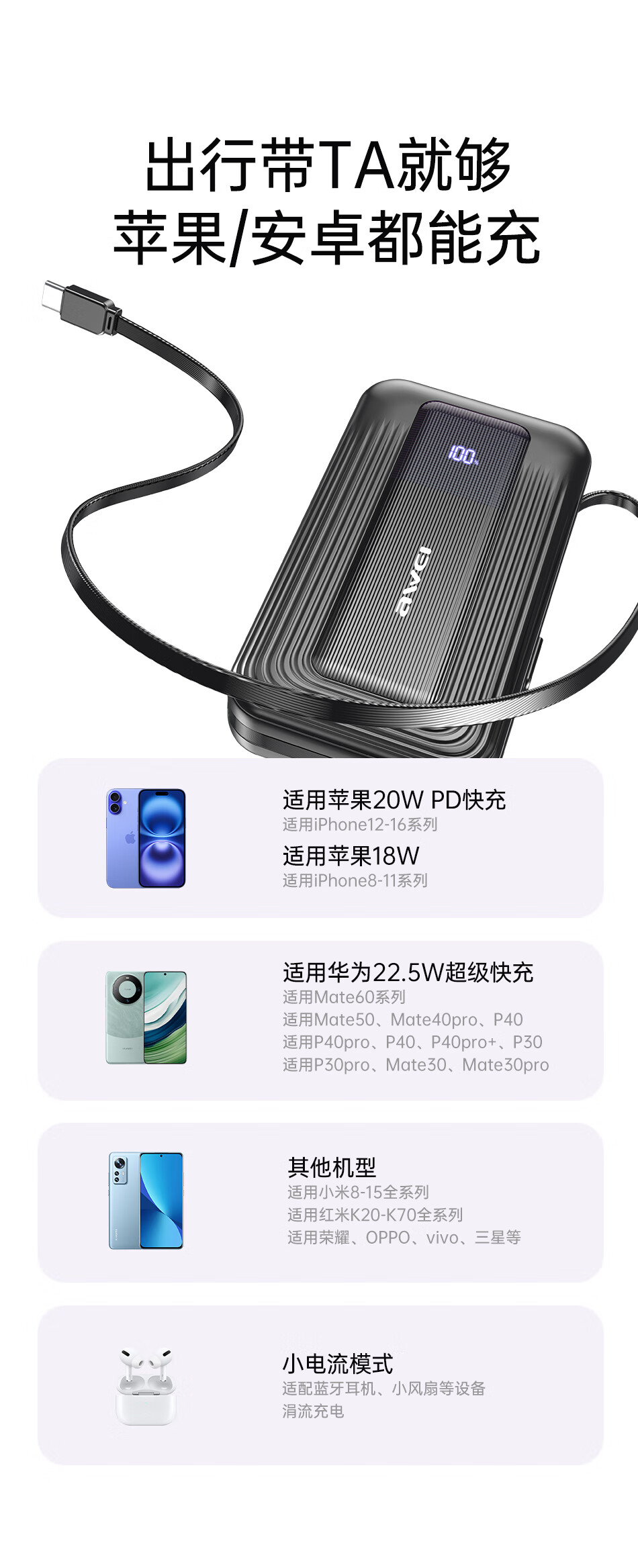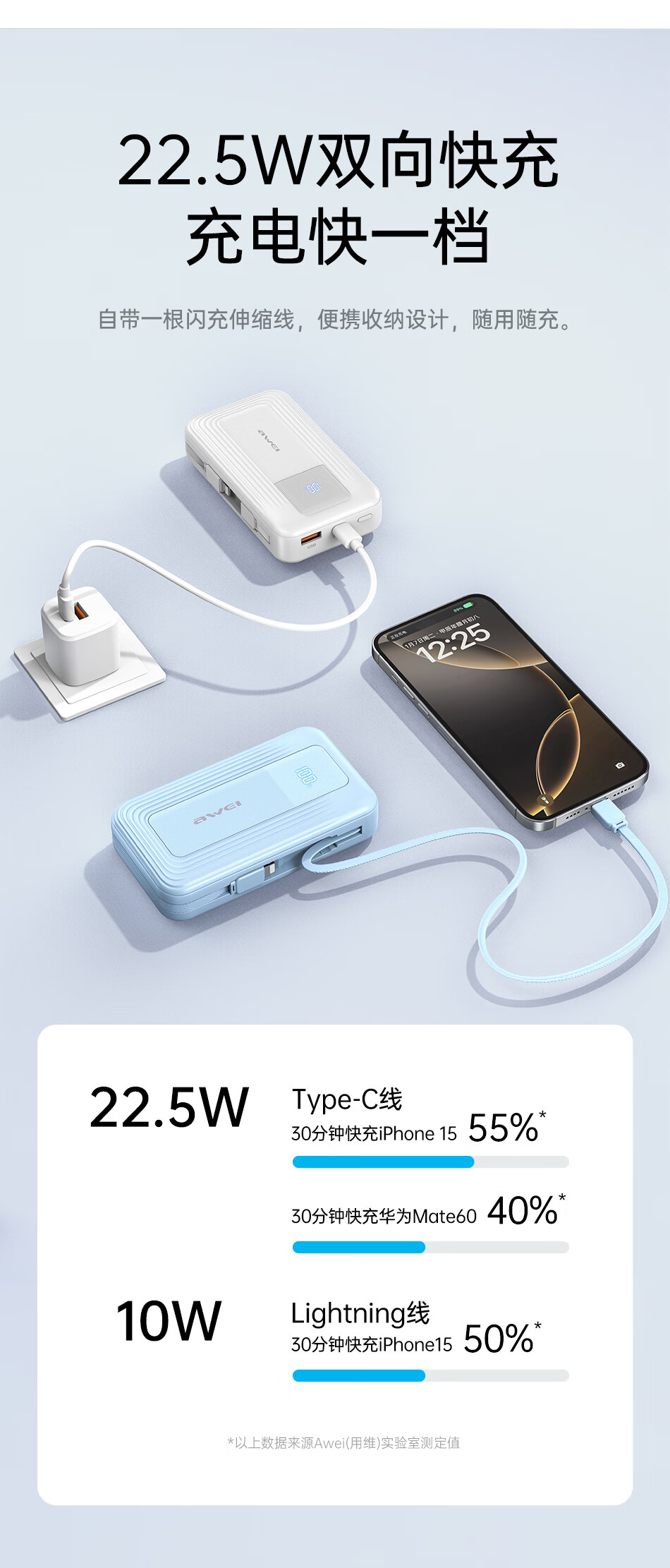 用维(AWEI)充电宝10000毫安容量自带双线22.5W快充移动电源迷你超薄小巧便携适用苹果17【3C认证可上飞机】 紫色丨电量数显丨自带苹果+Type-C双线 10000mAh