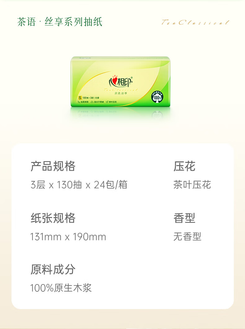 心相印抽纸 面巾纸 茶语丝享 3层130抽*24包真S码 纸巾(整箱销售)