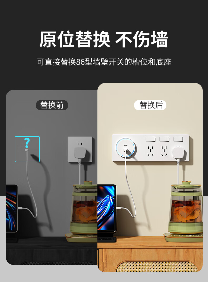 罗格朗开关插座面板未莱陶瓷白家用86型暗装五孔USB多孔墙壁5孔电源开关 五孔USB A+C 30W充电插座