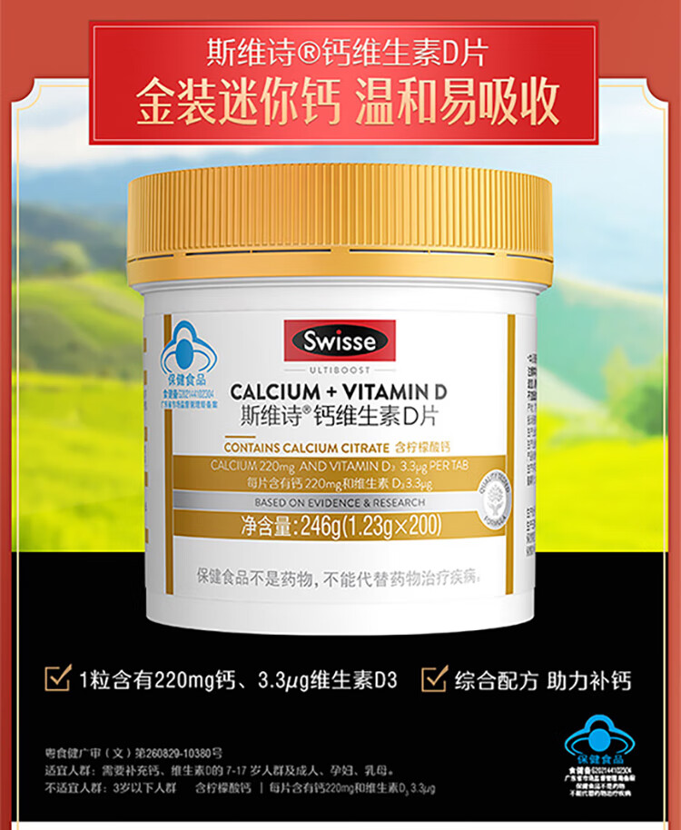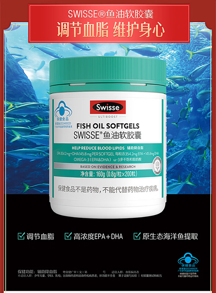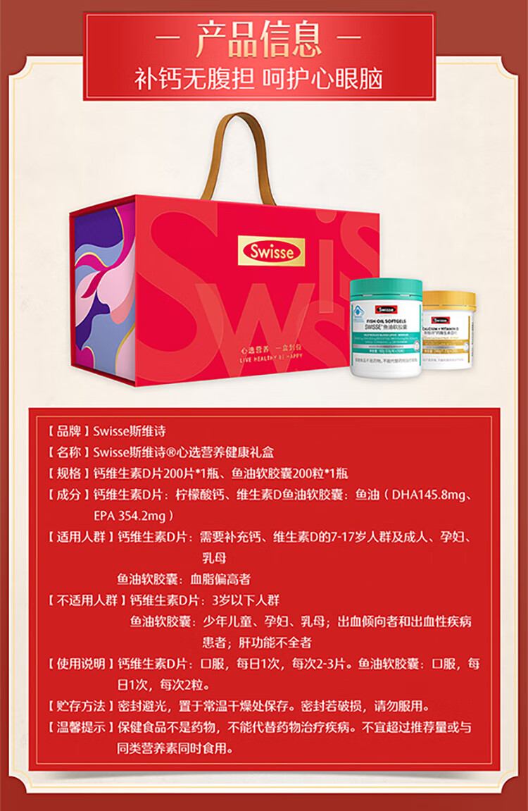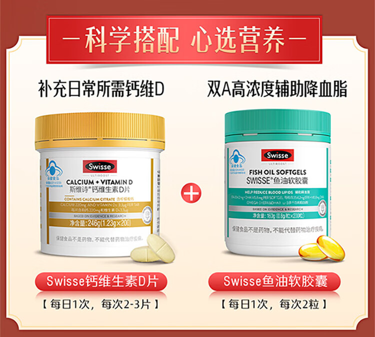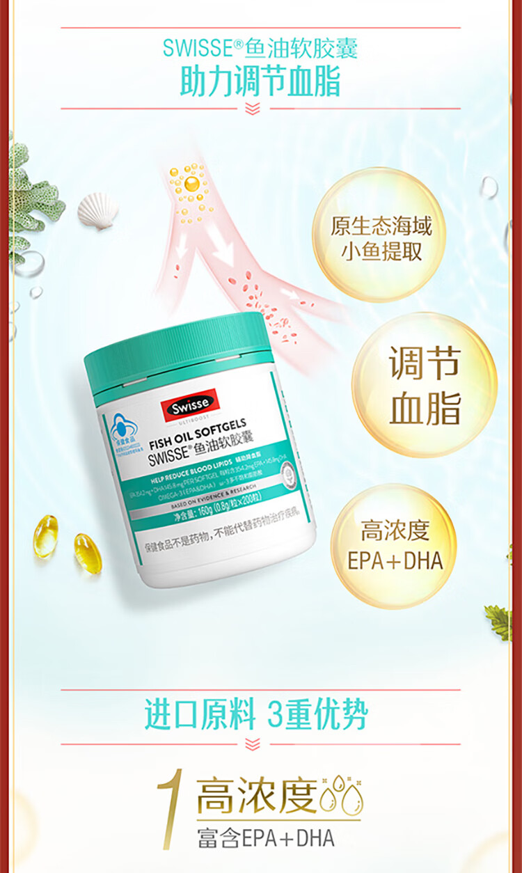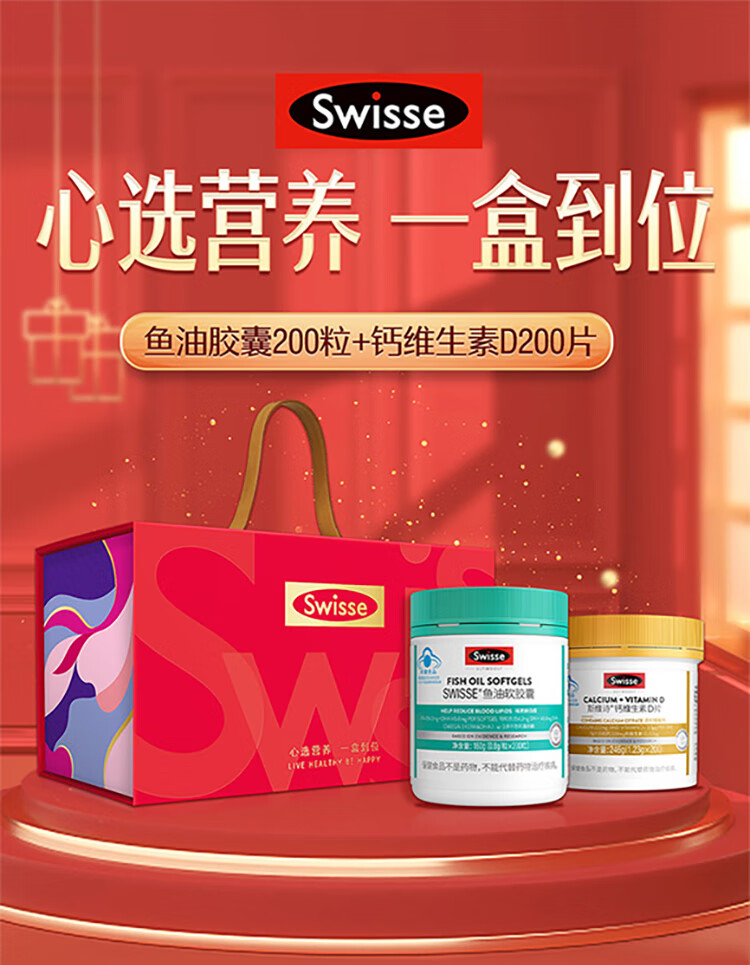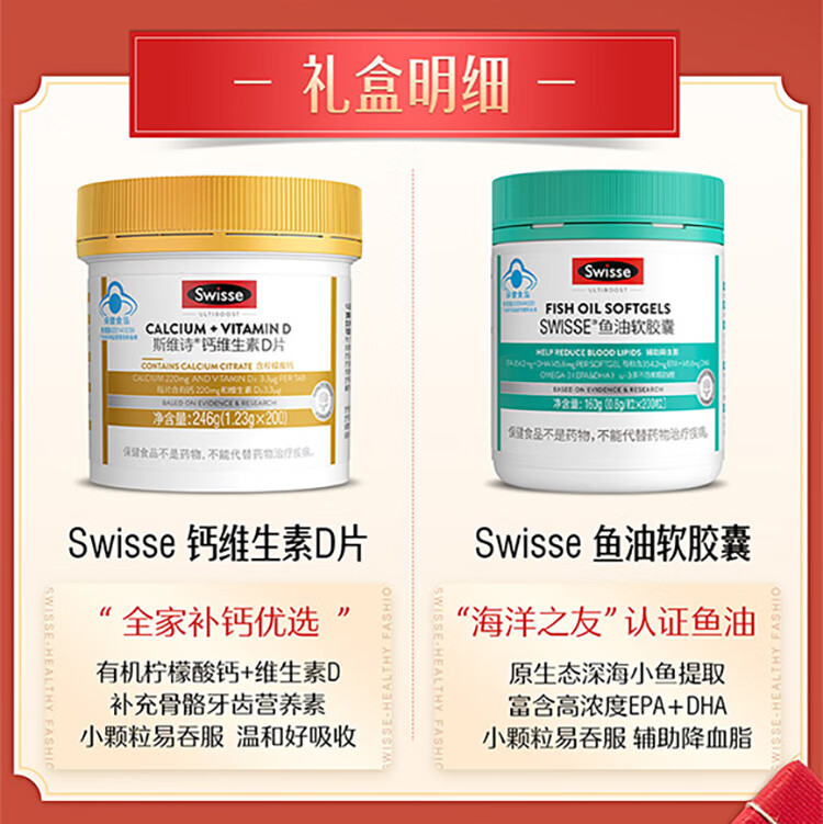 Swisse斯维诗 鱼油软胶囊 深海高浓度小粒鱼油 Omega3 DHA EPA 蓝帽认证 【年货节心选礼盒】鱼油 200粒*1瓶 +钙200片